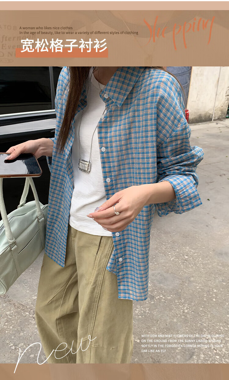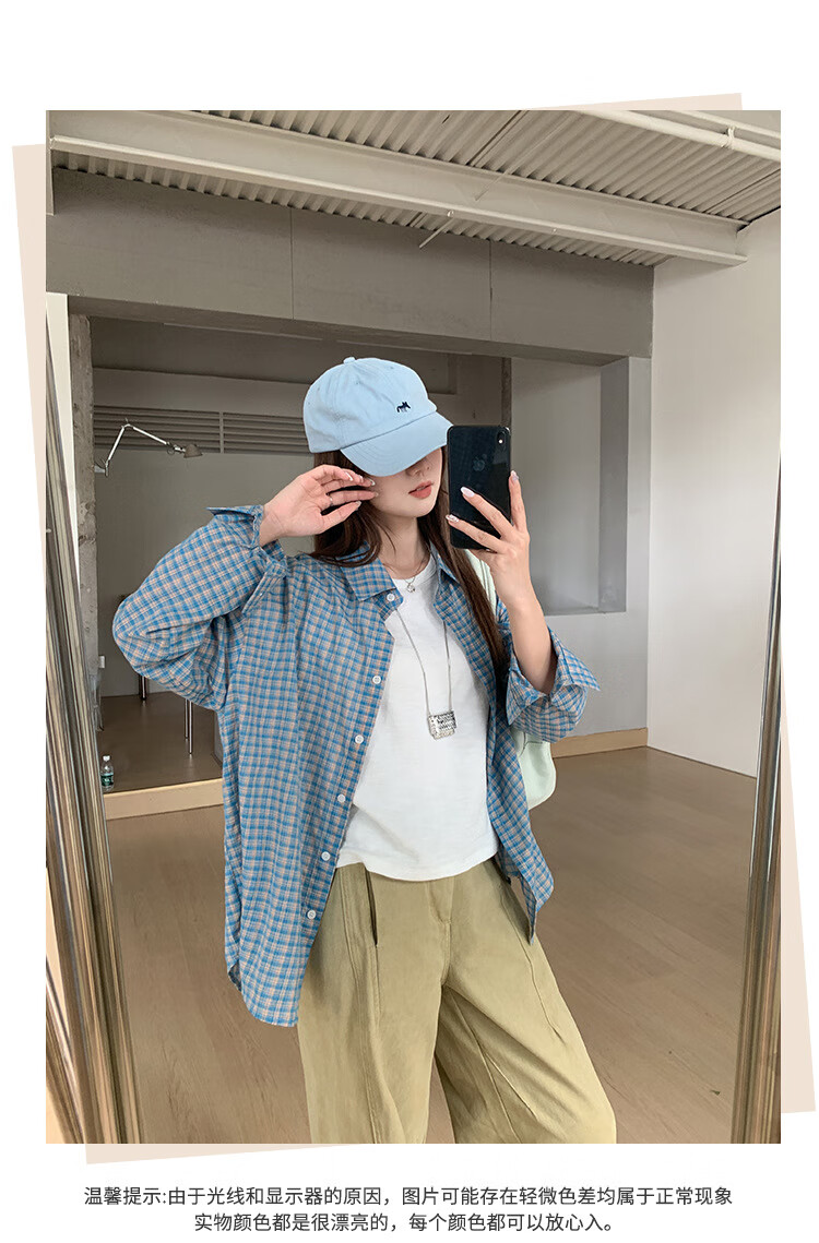【优选】格子衬衫长袖t恤女秋季甜美独特别致显瘦宽松外套上衣 蓝色 S