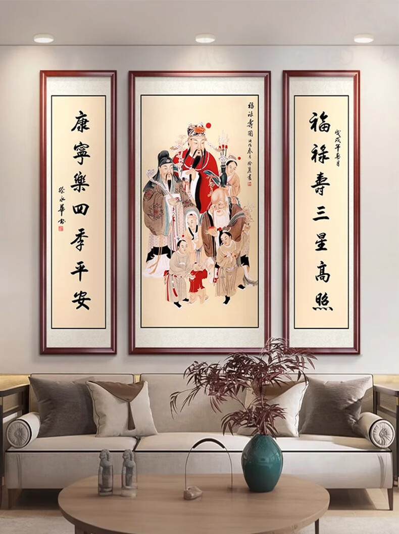 篆砚福禄寿三星高照中堂画挂画农村喜庆客厅装饰画对联字画背景墙壁画 U款 100*200+2*50*200CM_实木框