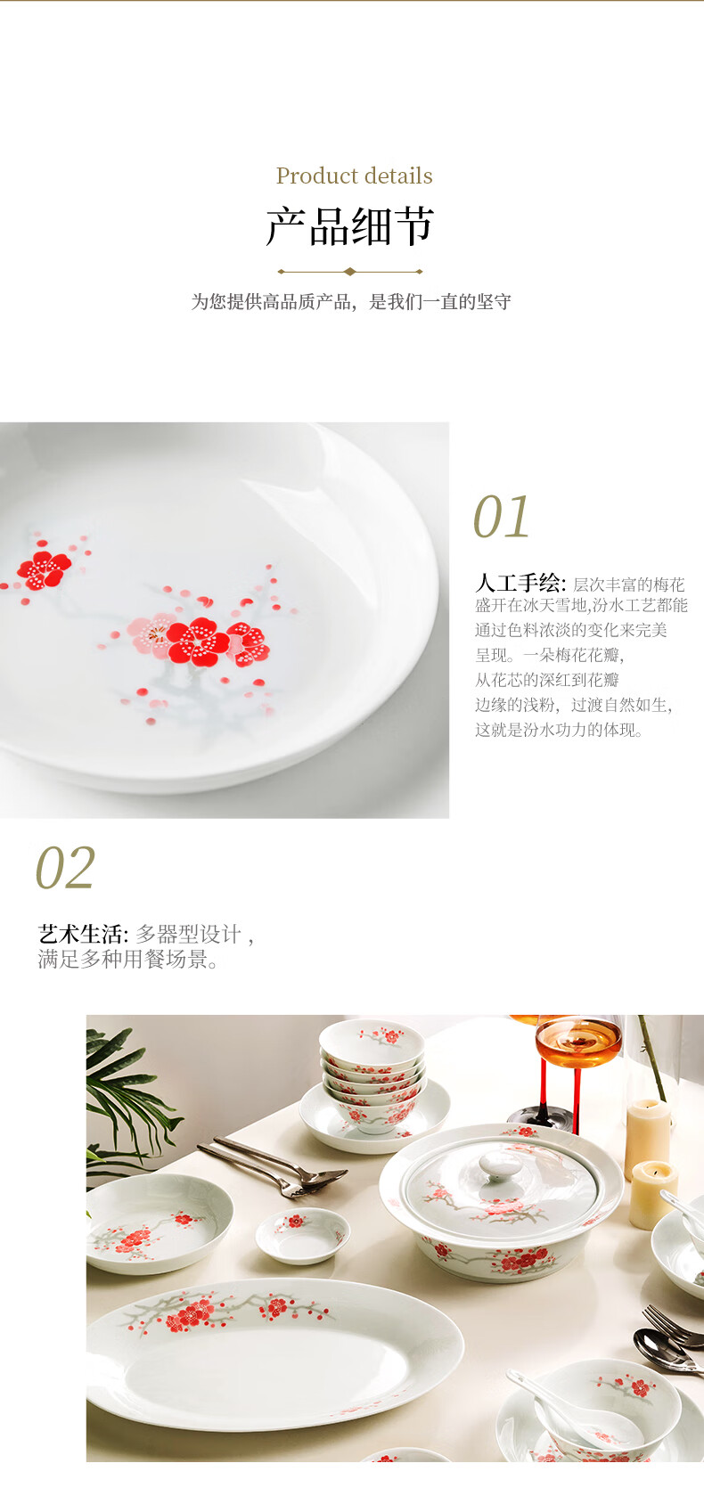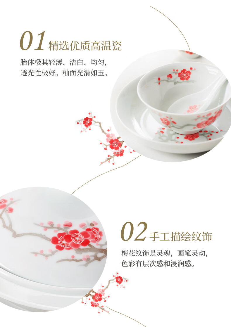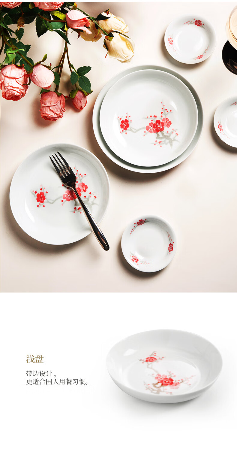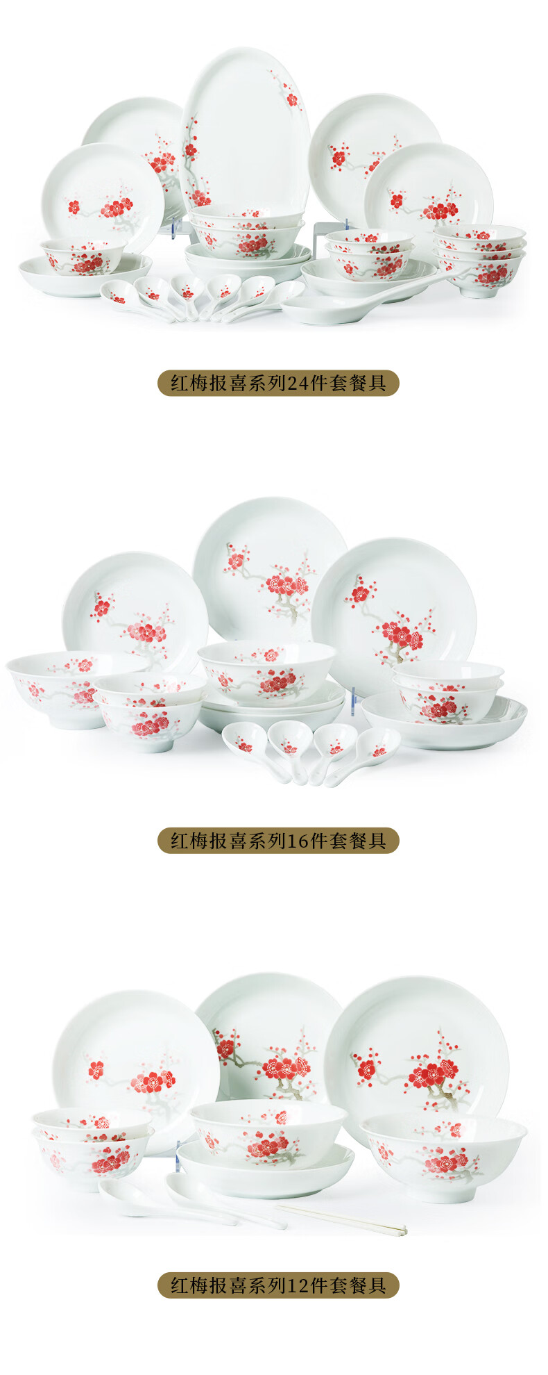 红官窑红梅报喜餐具整套碗盘釉下彩耐高温白瓷结婚乔迁新房送长辈礼陶瓷 红梅报喜20头【锦盒装】6人食