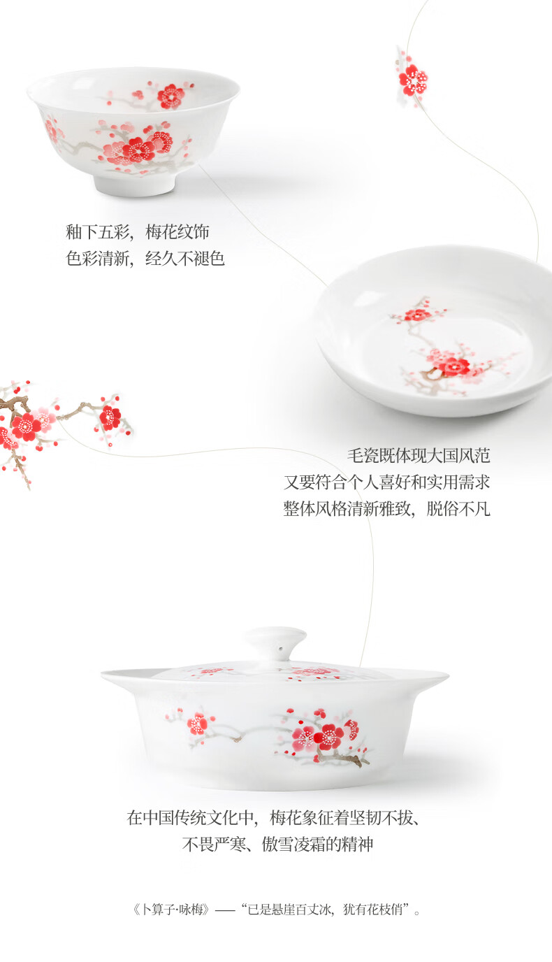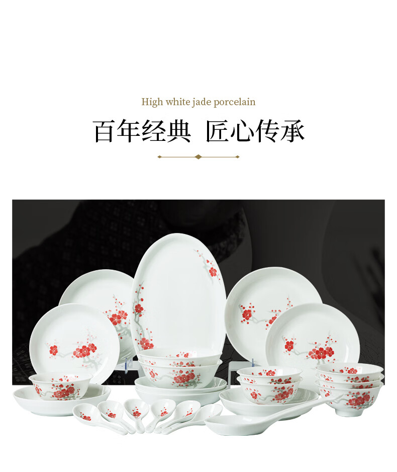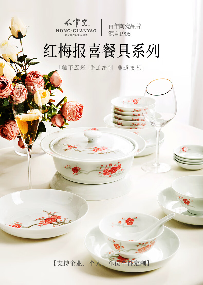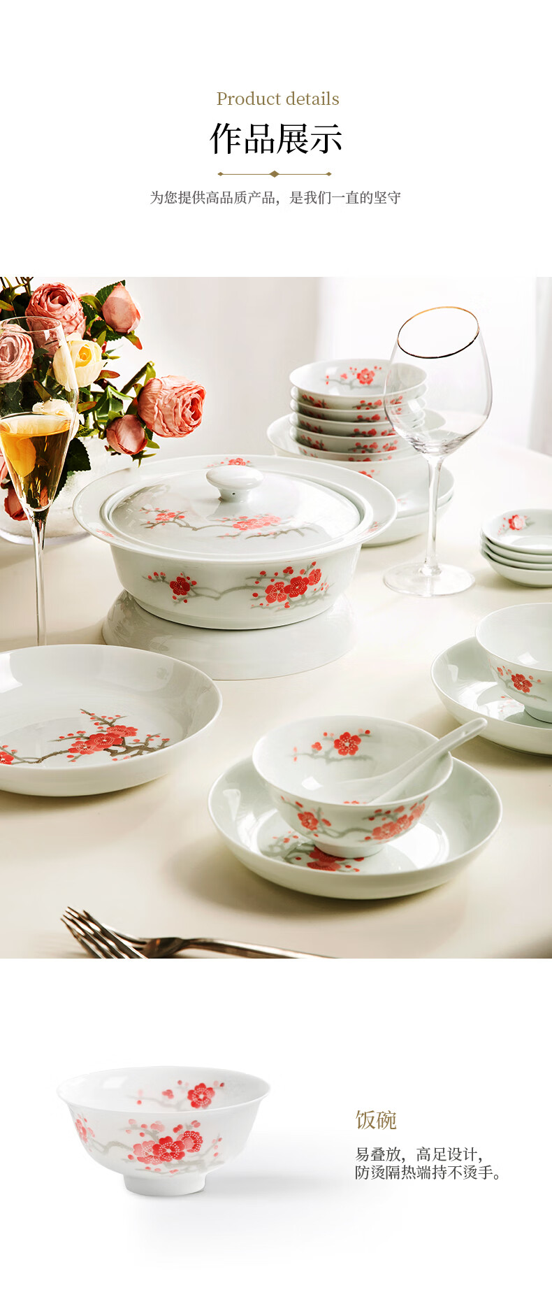 红官窑红梅报喜餐具整套碗盘釉下彩耐高温白瓷结婚乔迁新房送长辈礼陶瓷 红梅报喜20头【锦盒装】6人食