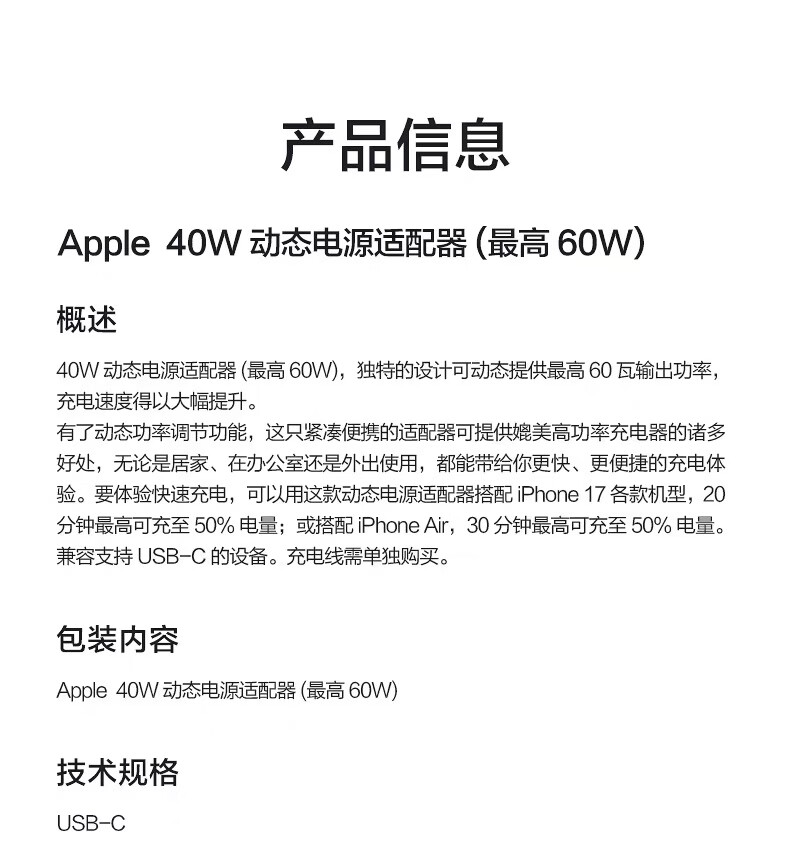 AppIe/苹果17/16充电头40W充电器适配原装正品iPhone17promax/Pro/16/15充电器头数据线快充套装 苹果8-17系列40W动态电源适配器