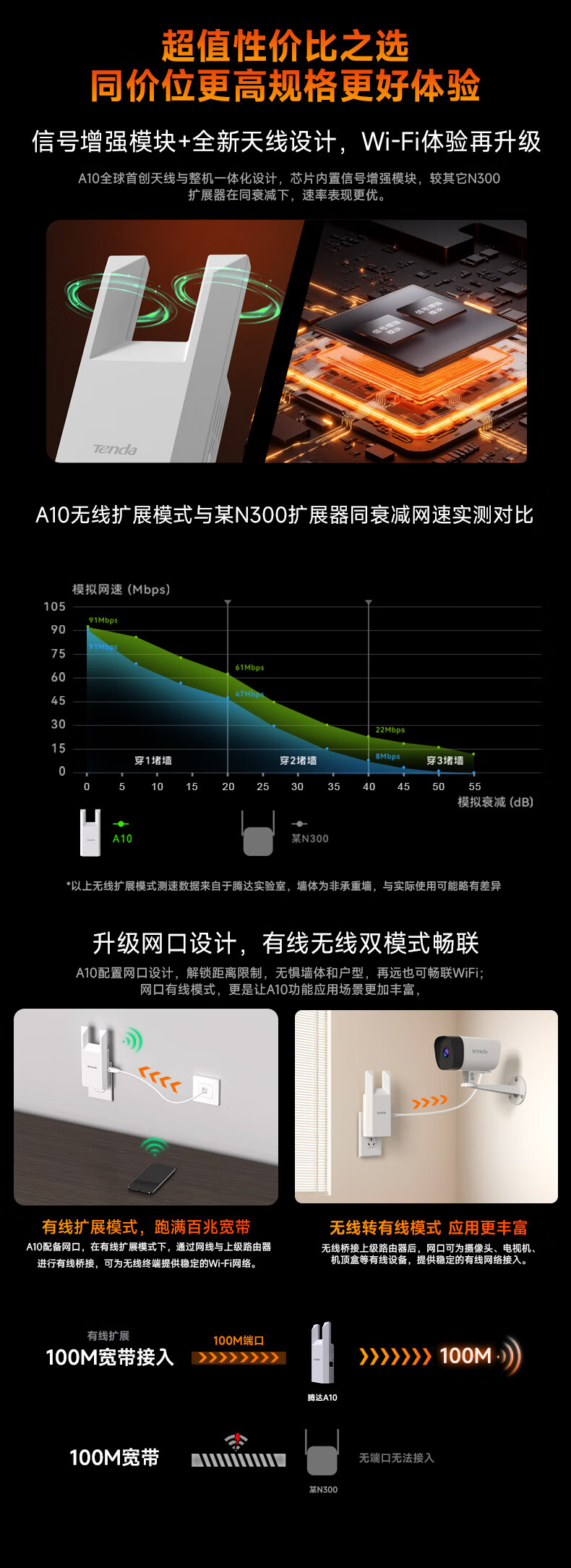 Tenda腾达WiFi信号放大器无线网络扩大路由增强wi-fi中继拓展穿墙王全屋覆盖扩展网口AP家用桥接有线A10