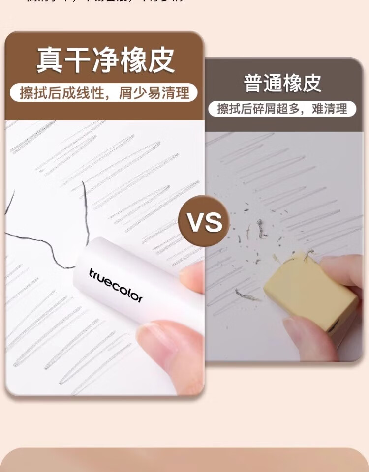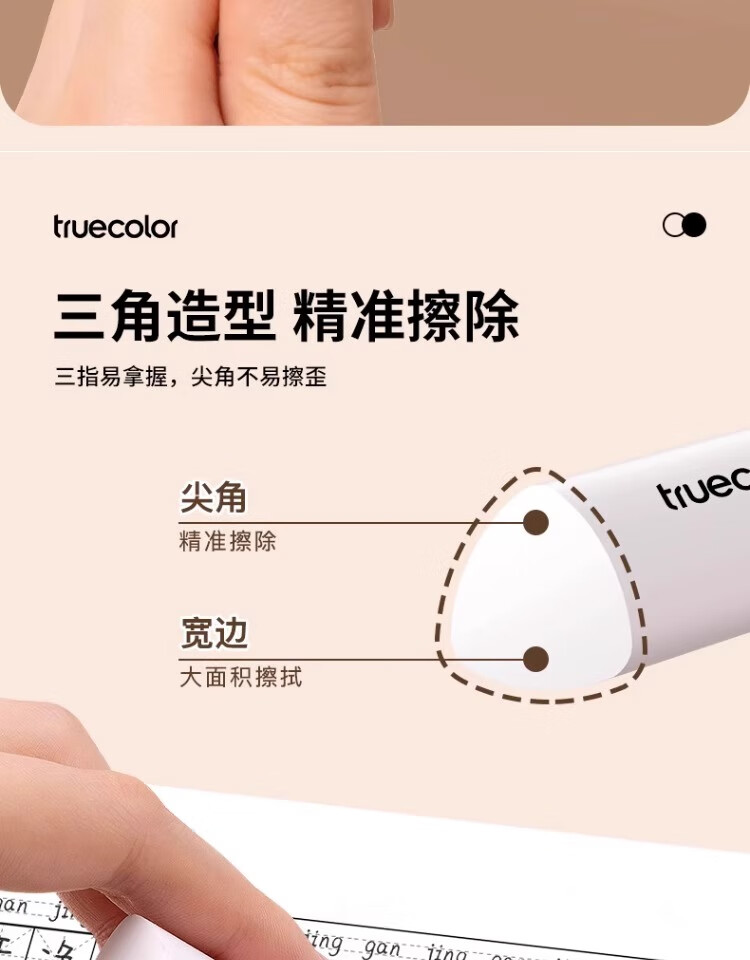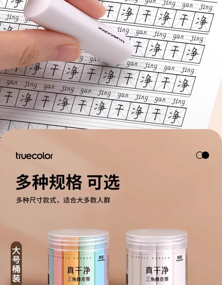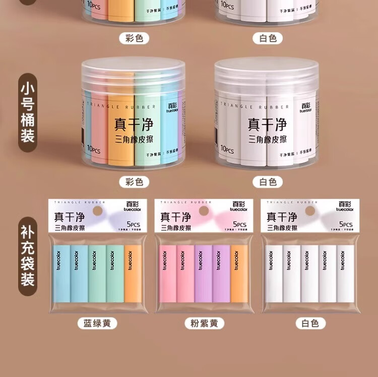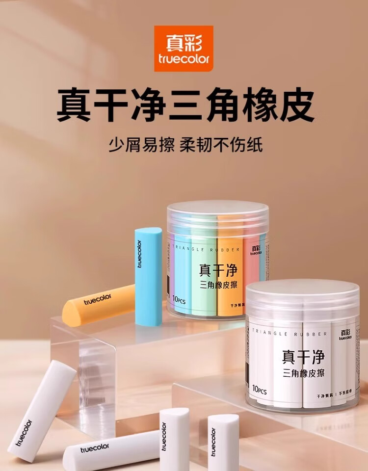 真彩(TRUECOLOR)集屑三角橡皮擦美术橡皮无屑超干净擦拭成条擦字干净不留痕2B少屑儿童写字素描 中号彩色10个/桶