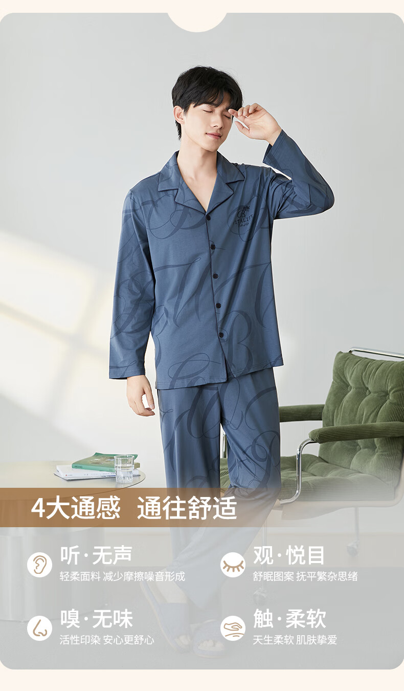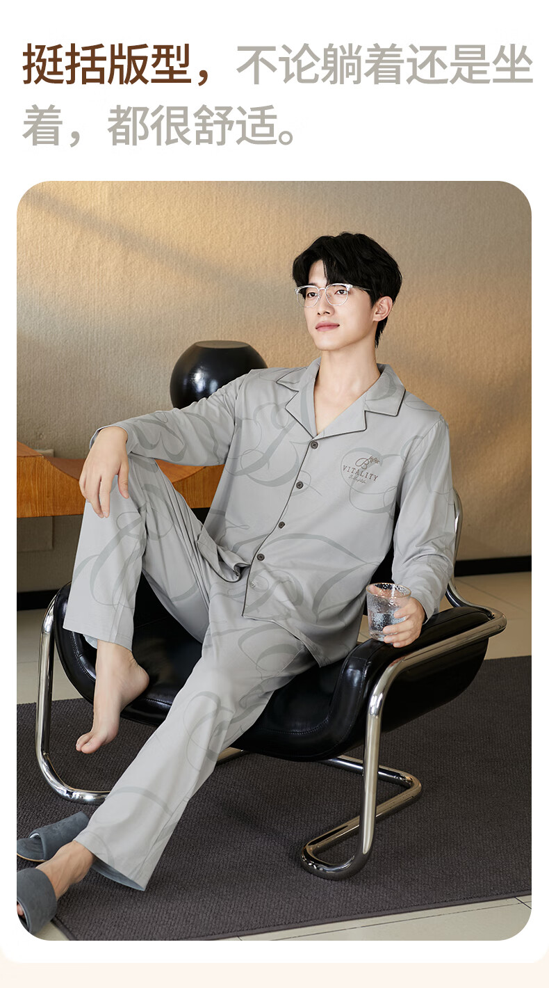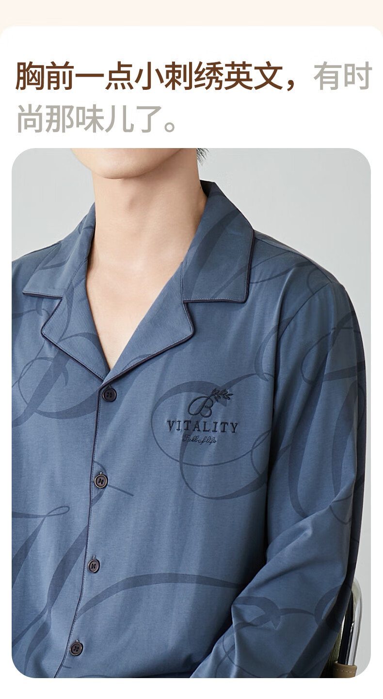 芬腾男士睡衣春秋季纯棉锁边翻领开衫长袖家居服套装软棉棉