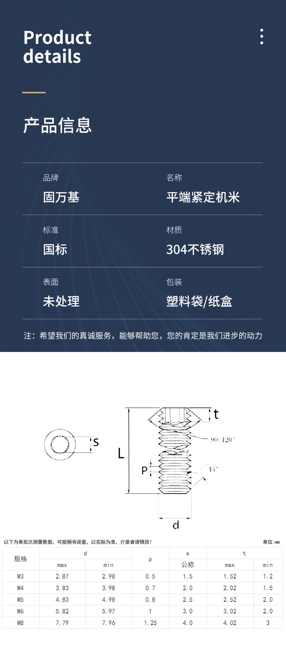 固万基304不锈钢内六角平端紧定螺钉止付顶丝无头机米螺丝DIN913 M2x3[100粒]