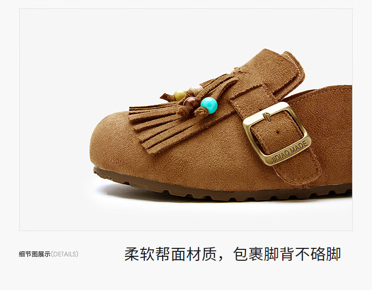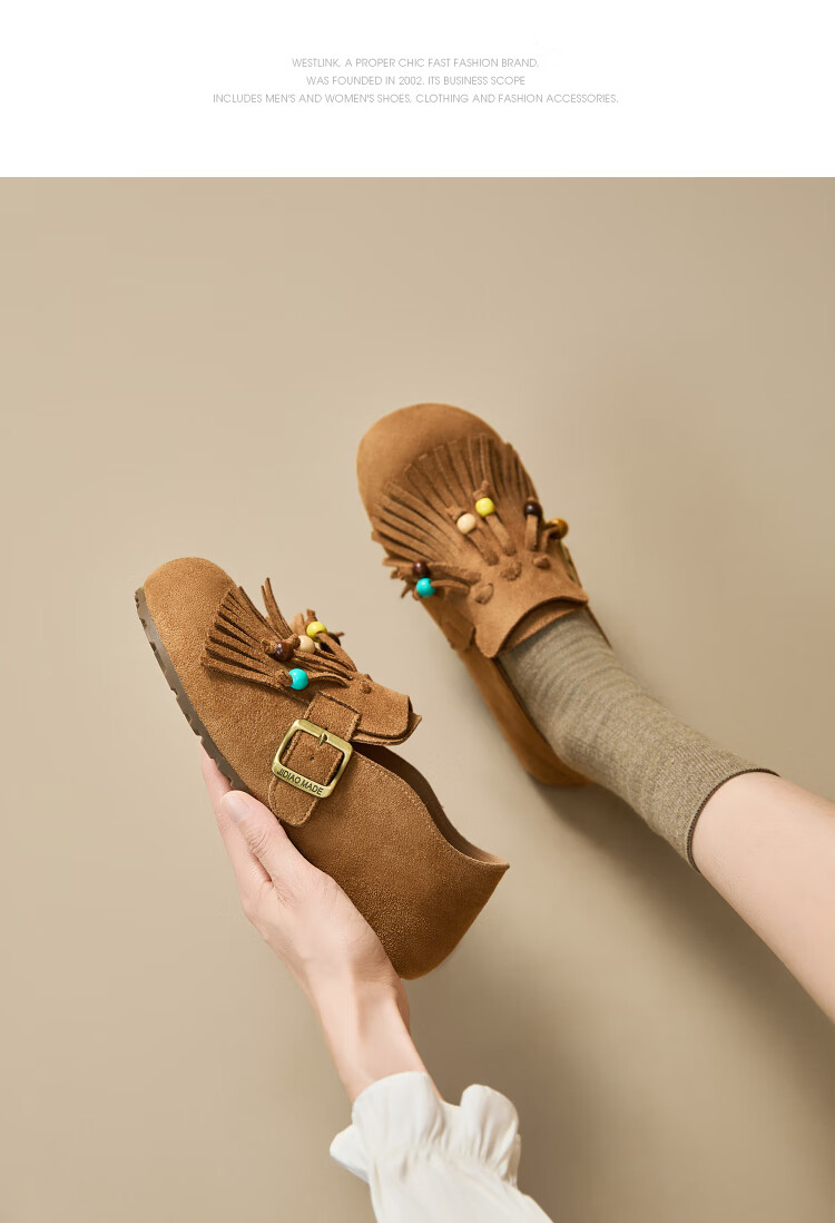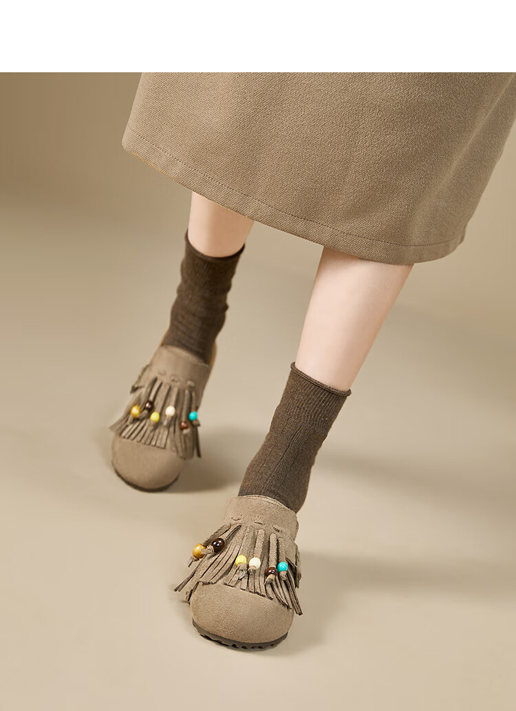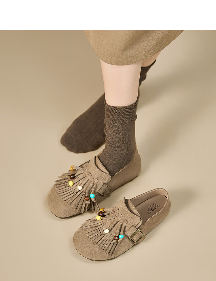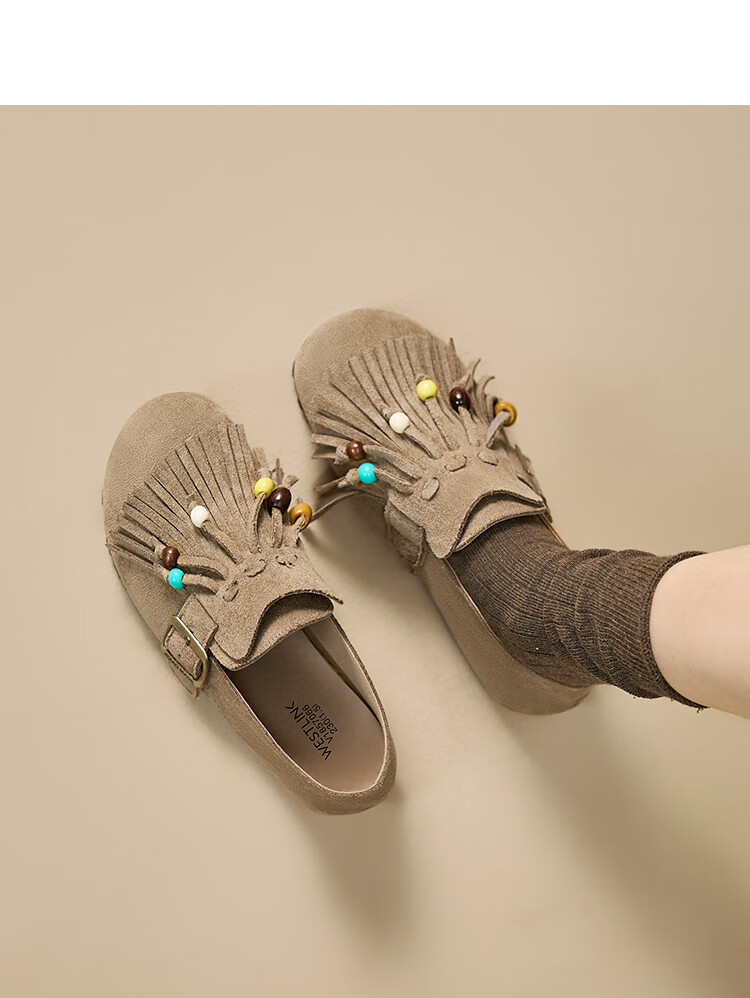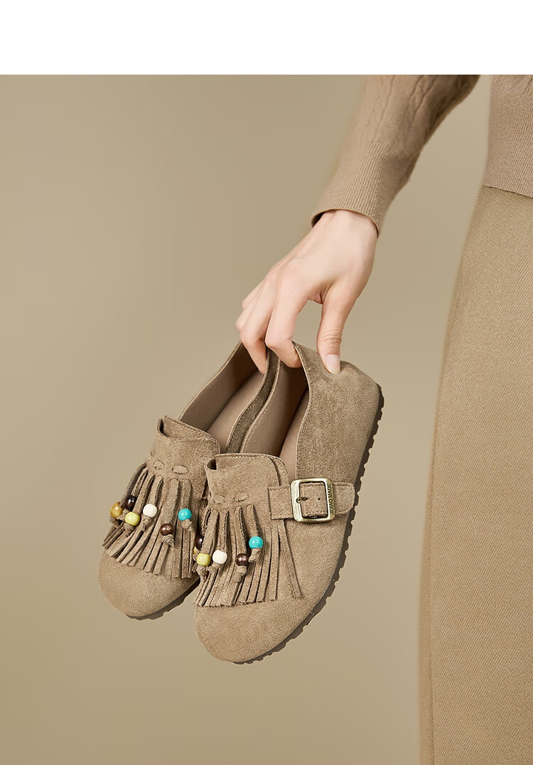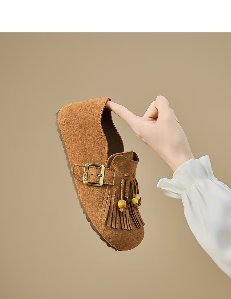 西遇流苏勃肯鞋女2025新款秋季全包一脚蹬懒人平底鞋圆头软底单鞋 卡其色 38 (240)