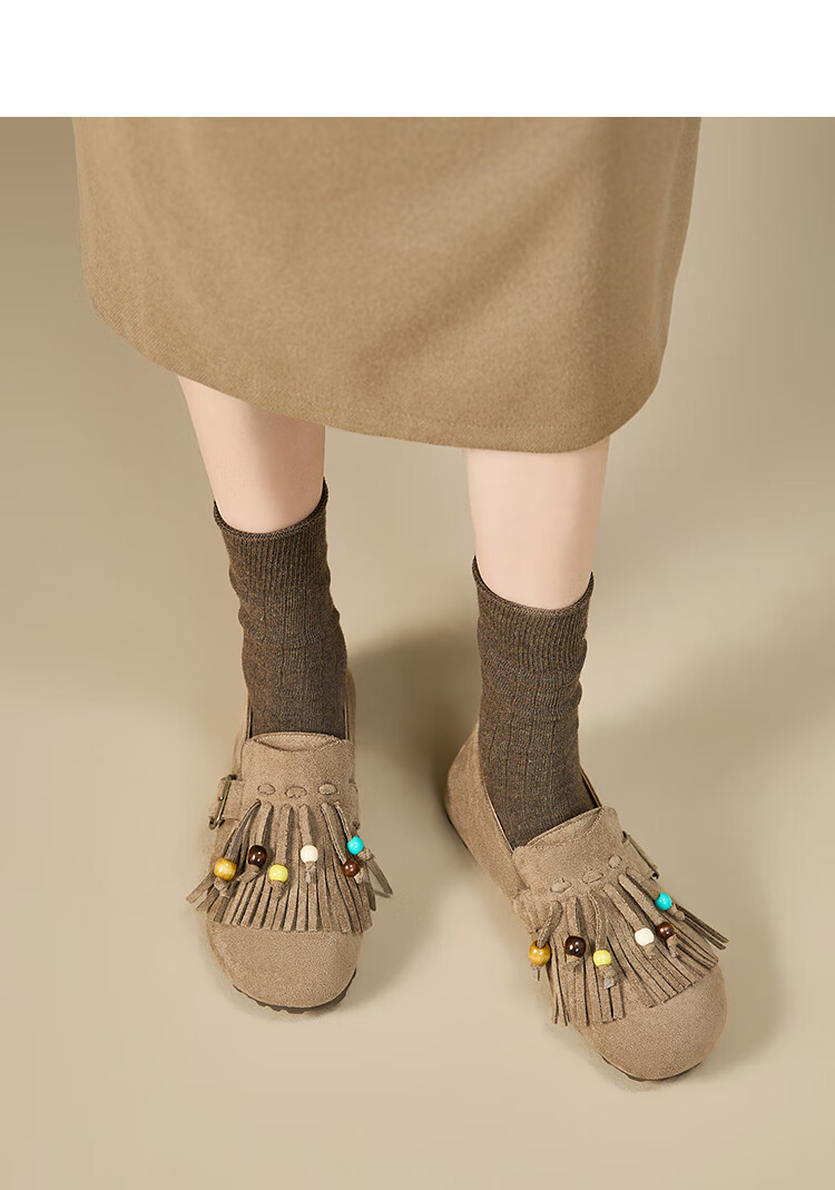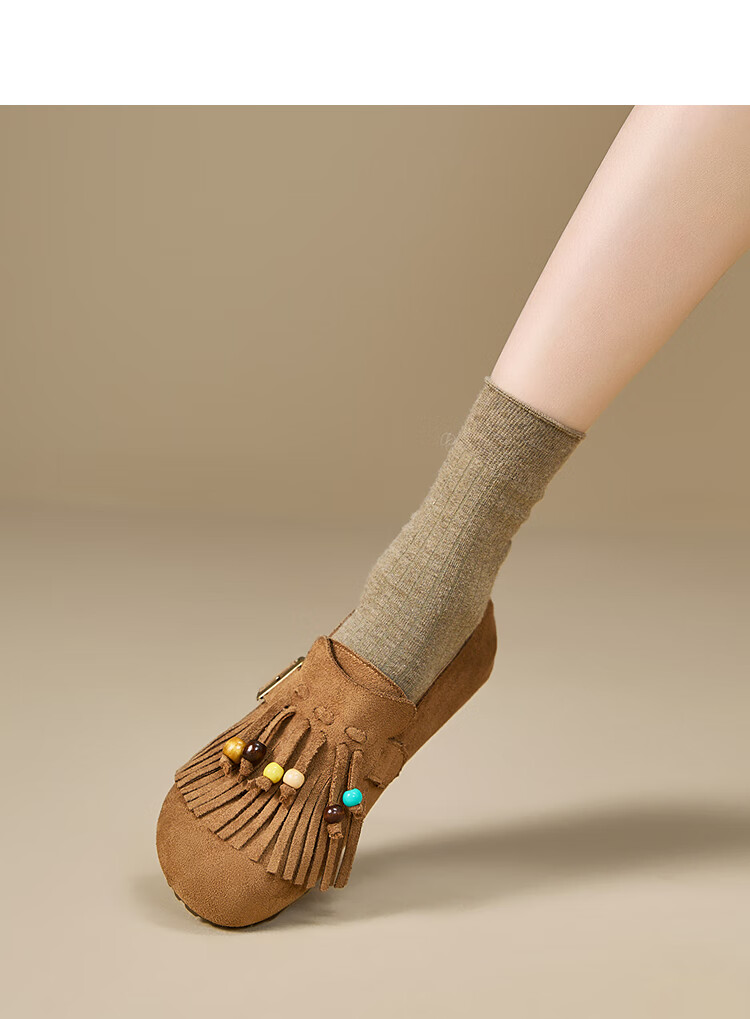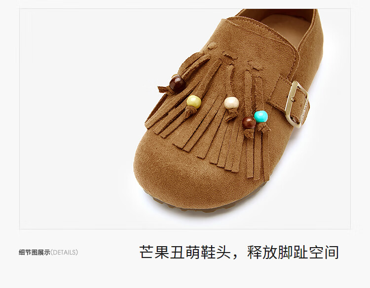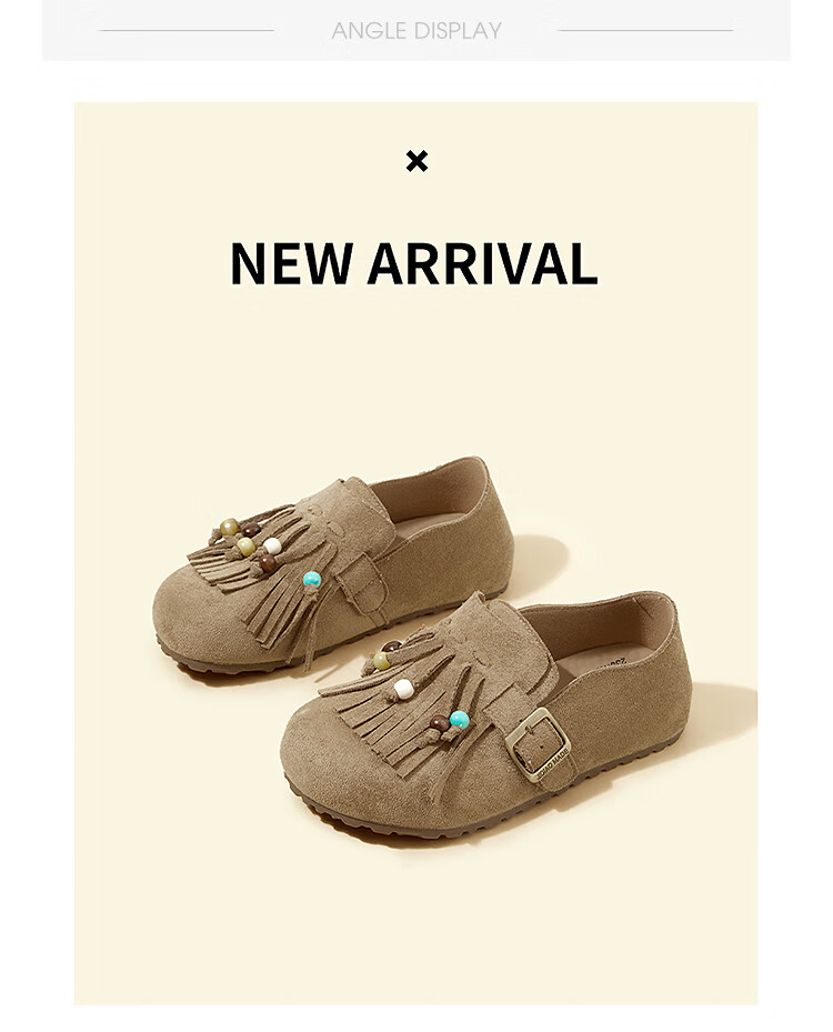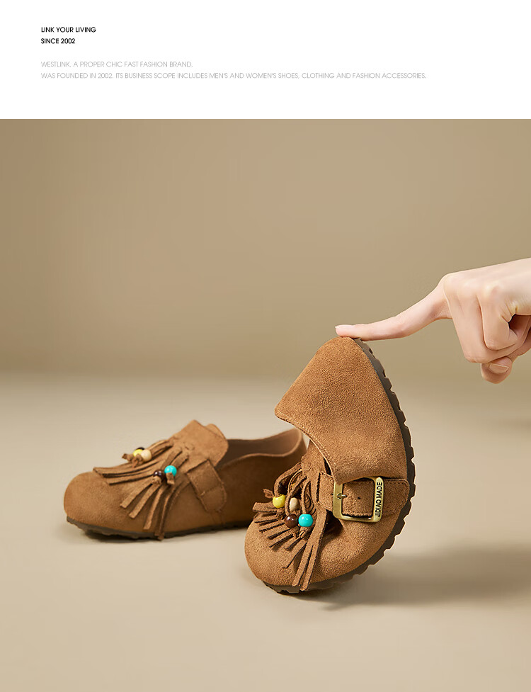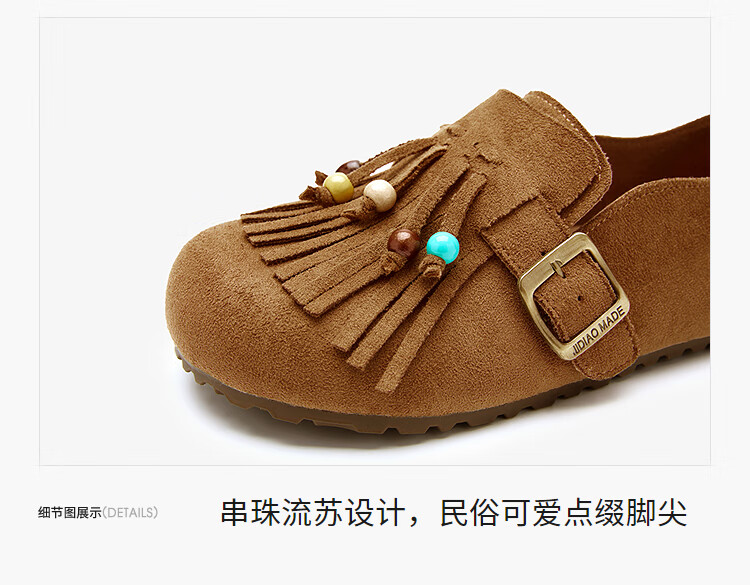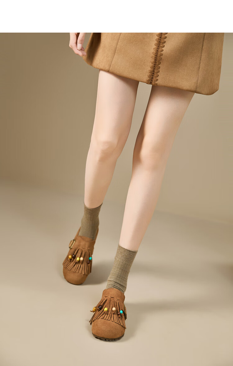西遇流苏勃肯鞋女2025新款秋季全包一脚蹬懒人平底鞋圆头软底单鞋 卡其色 38 (240)