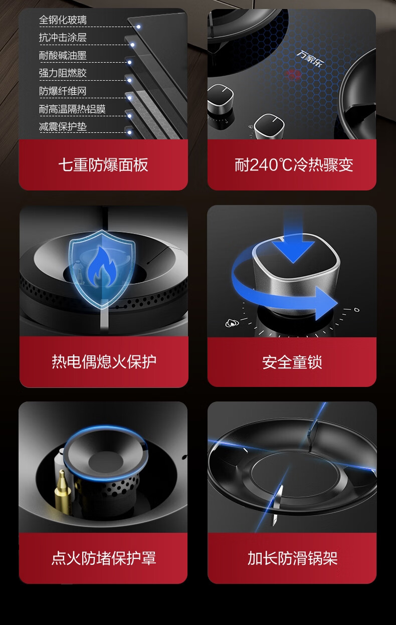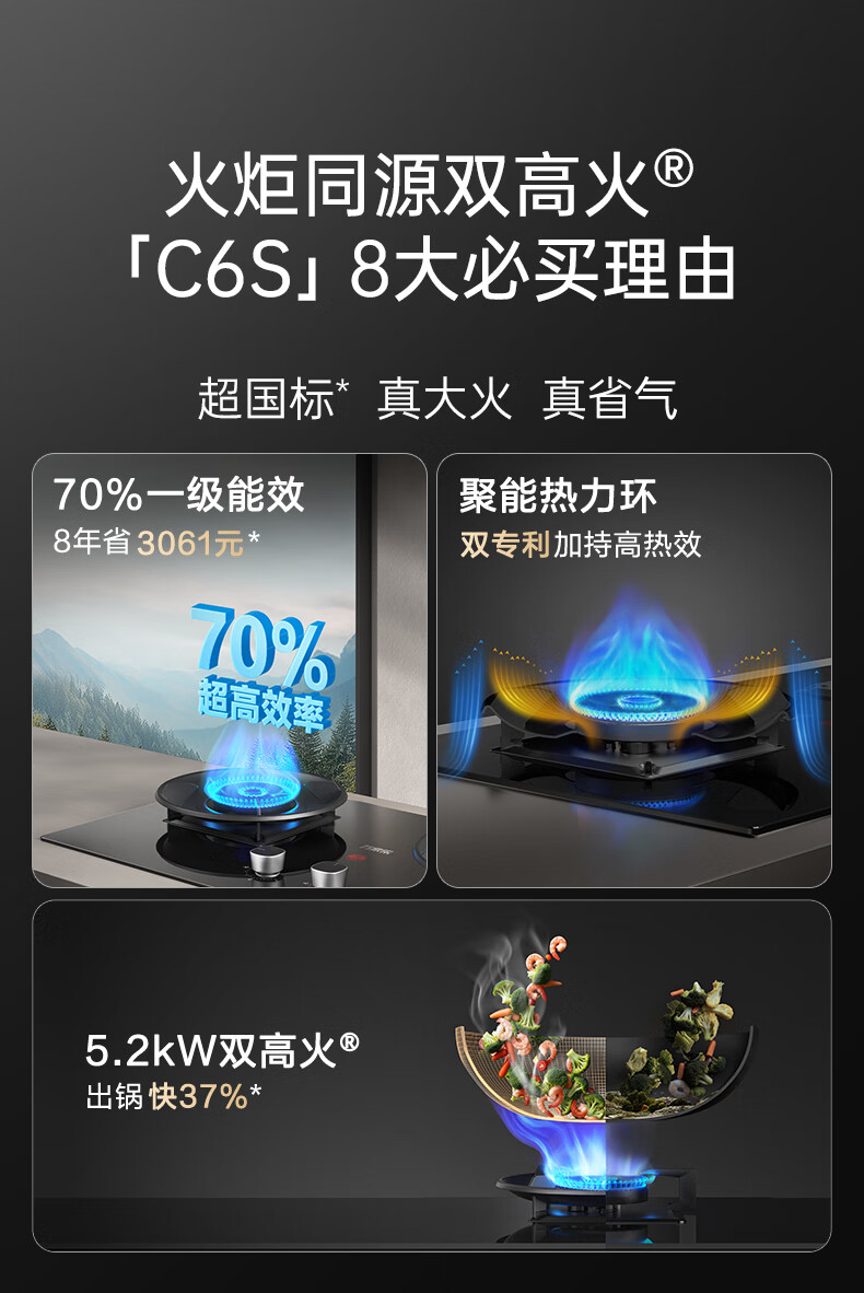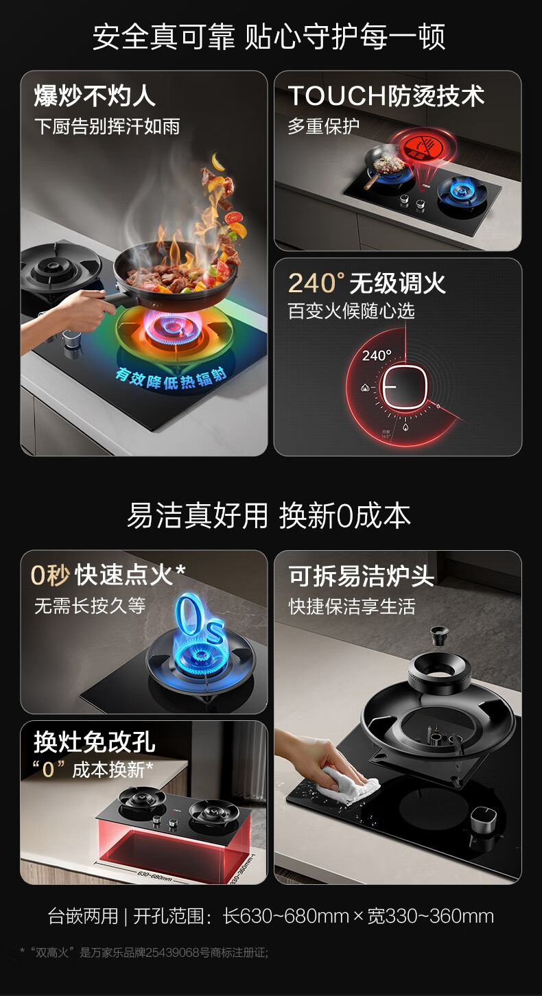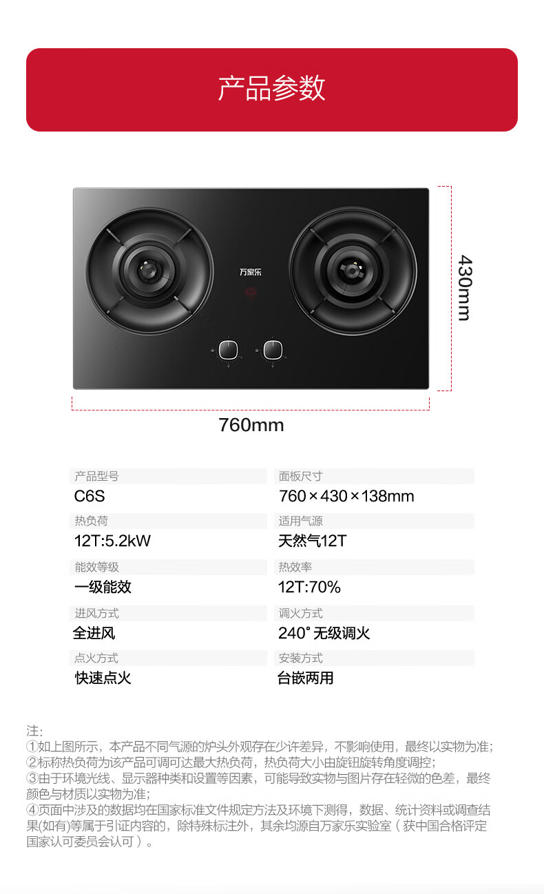 万家乐燃气灶【小飓风C6S】5.2kw大火力灶70%高热效率台嵌两用换新免扩孔高温防烫灶 可适配开孔天然气灶