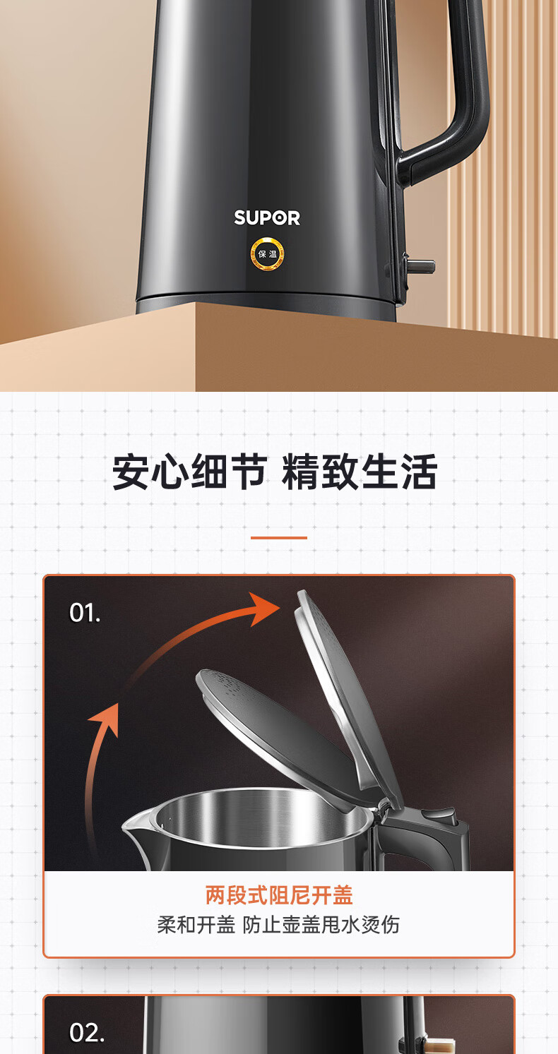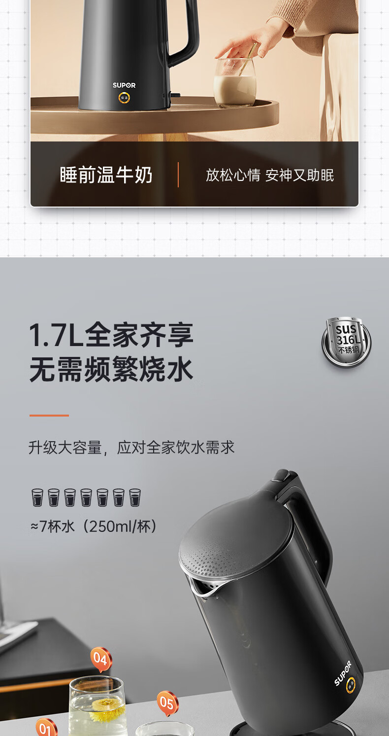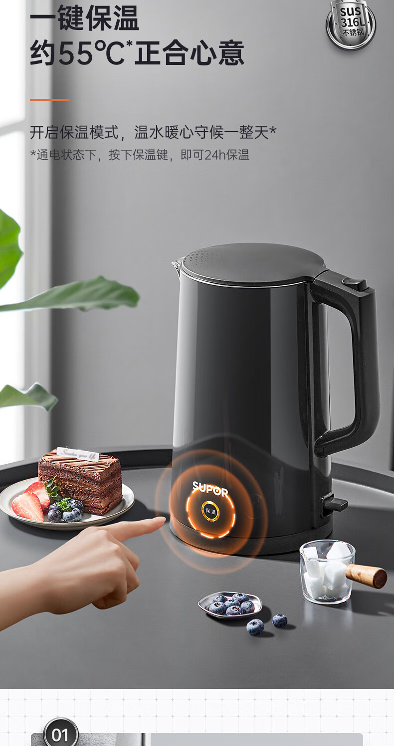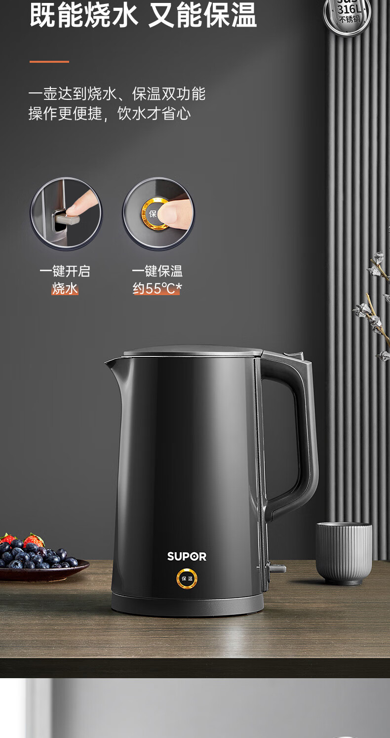 苏泊尔(SUPOR)电水壶热水壶 1.7L大容量全钢无缝电热水壶 316L不锈钢烧水壶 一键保温恒温 SW-17J12P