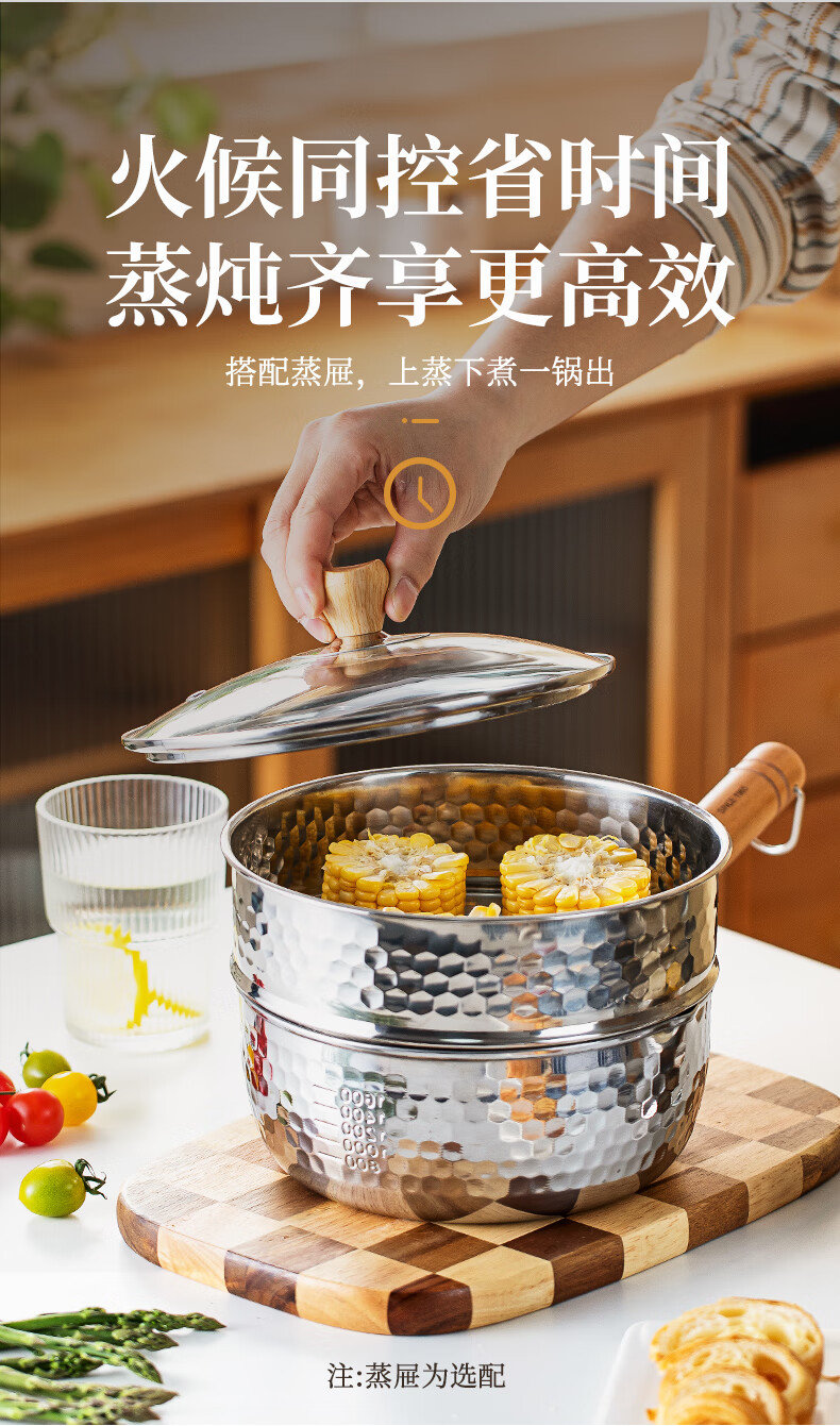 兰琦欧加厚304不锈钢小蒸锅双层家用汤锅蒸煮炖小型蒸笼电磁炉燃气灶用 26cm双层 1cm 全钢柄
