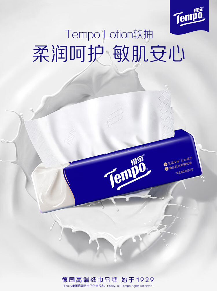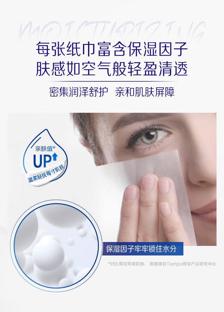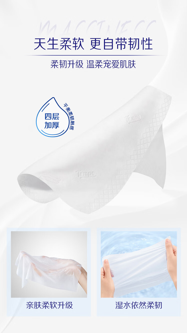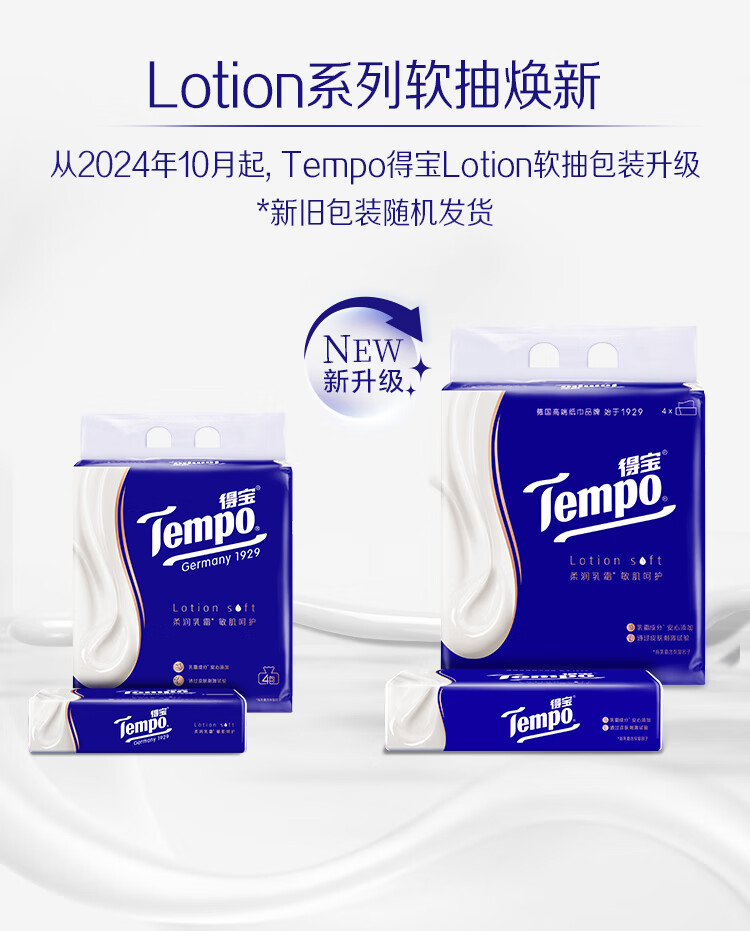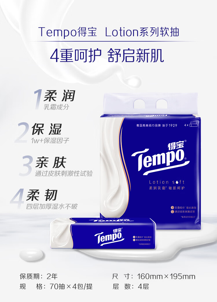 得宝(TEMPO)一博同款 乳霜纸 婴儿云柔巾 Lotion4层70抽*4包 保湿纸巾 抽纸