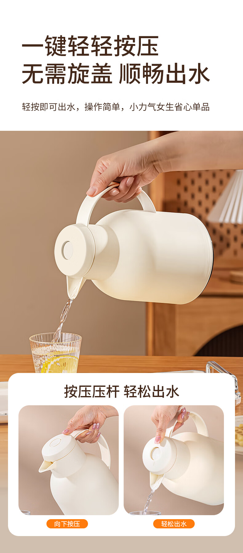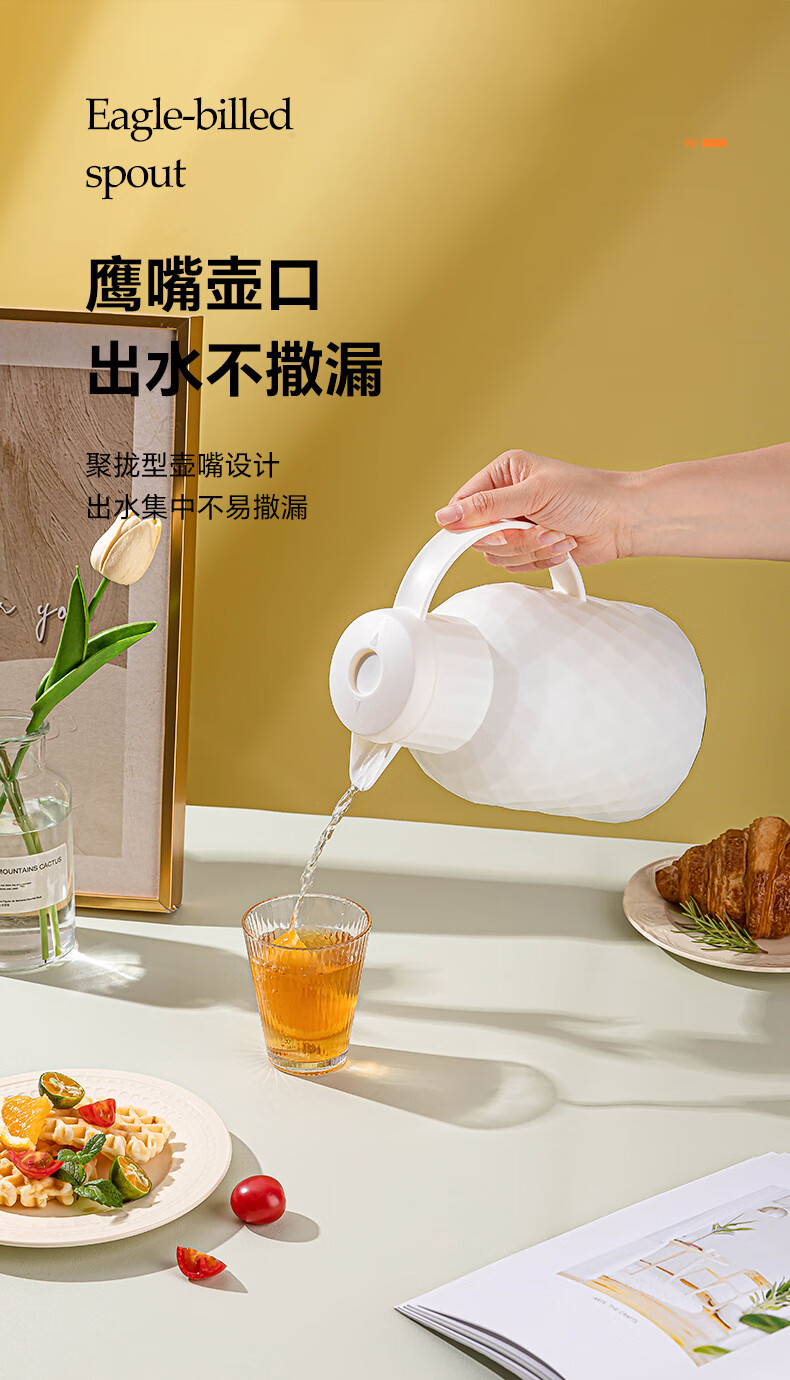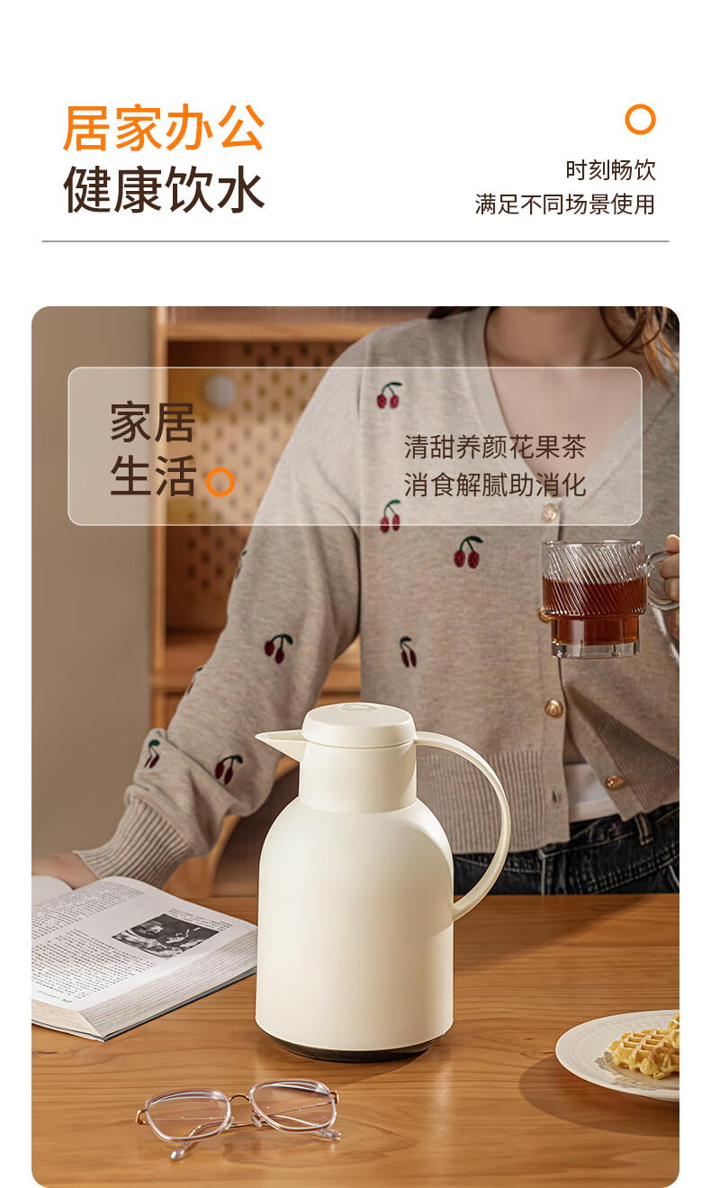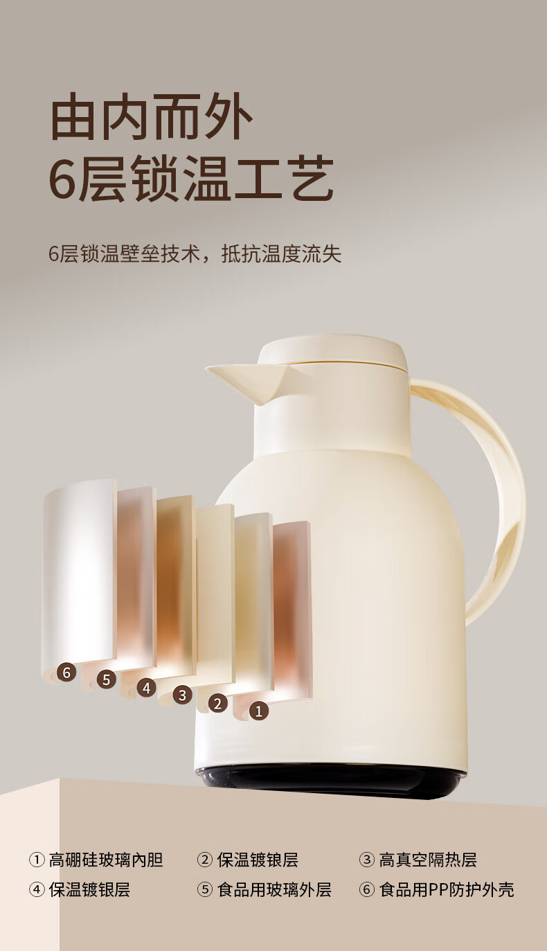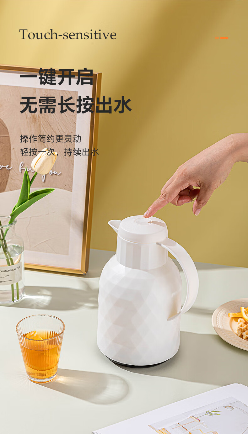 乐唯诗(LOVWISH) 保温壶家用办公室保温瓶热水瓶车载水壶暖水壶玻璃内胆开水瓶 钻纹保温壶【按压款】米白色1400ml