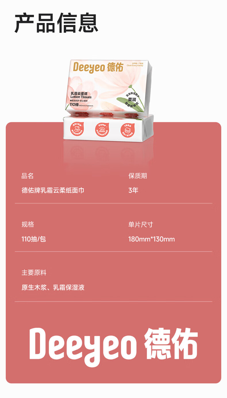 德佑云柔巾110抽*18包 乳霜纸柔纸巾婴儿保湿纸巾宝宝专用面巾抽纸