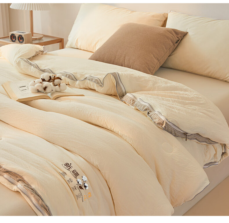 一默四件套被套床单枕套简约拼色水洗棉居家宿舍单人亲肤透气床品套装 卡其+抹茶绿 床单款 (被套200*230cm)