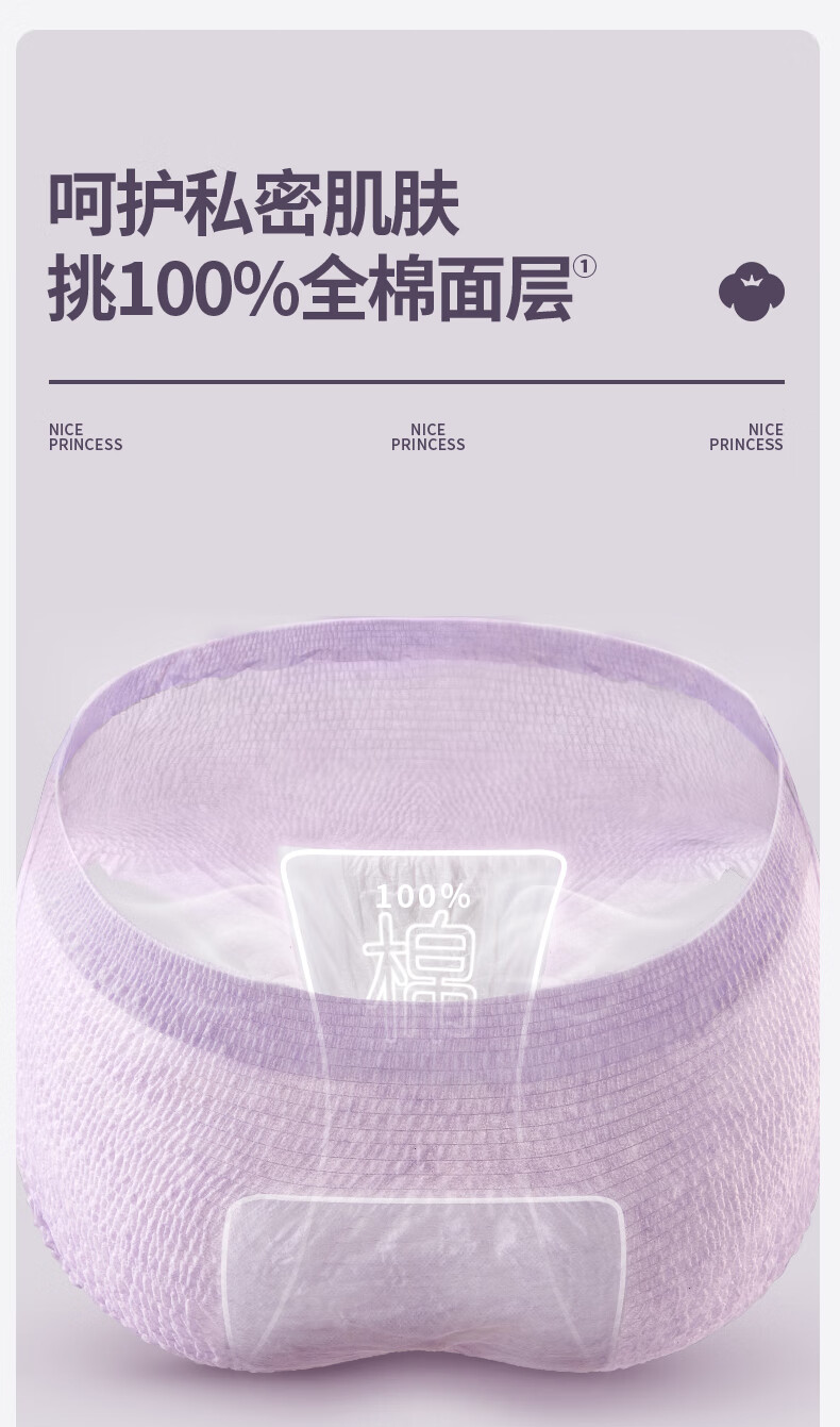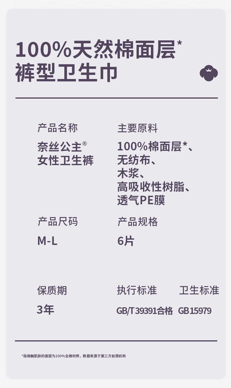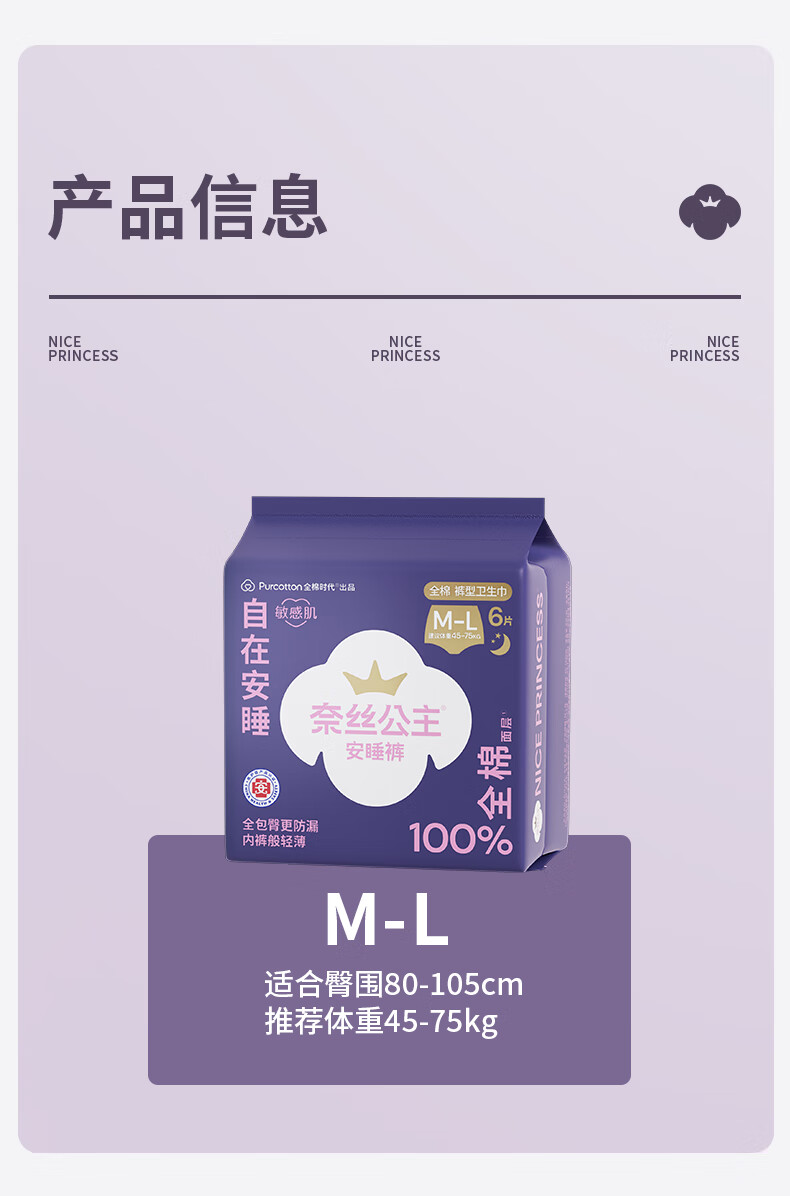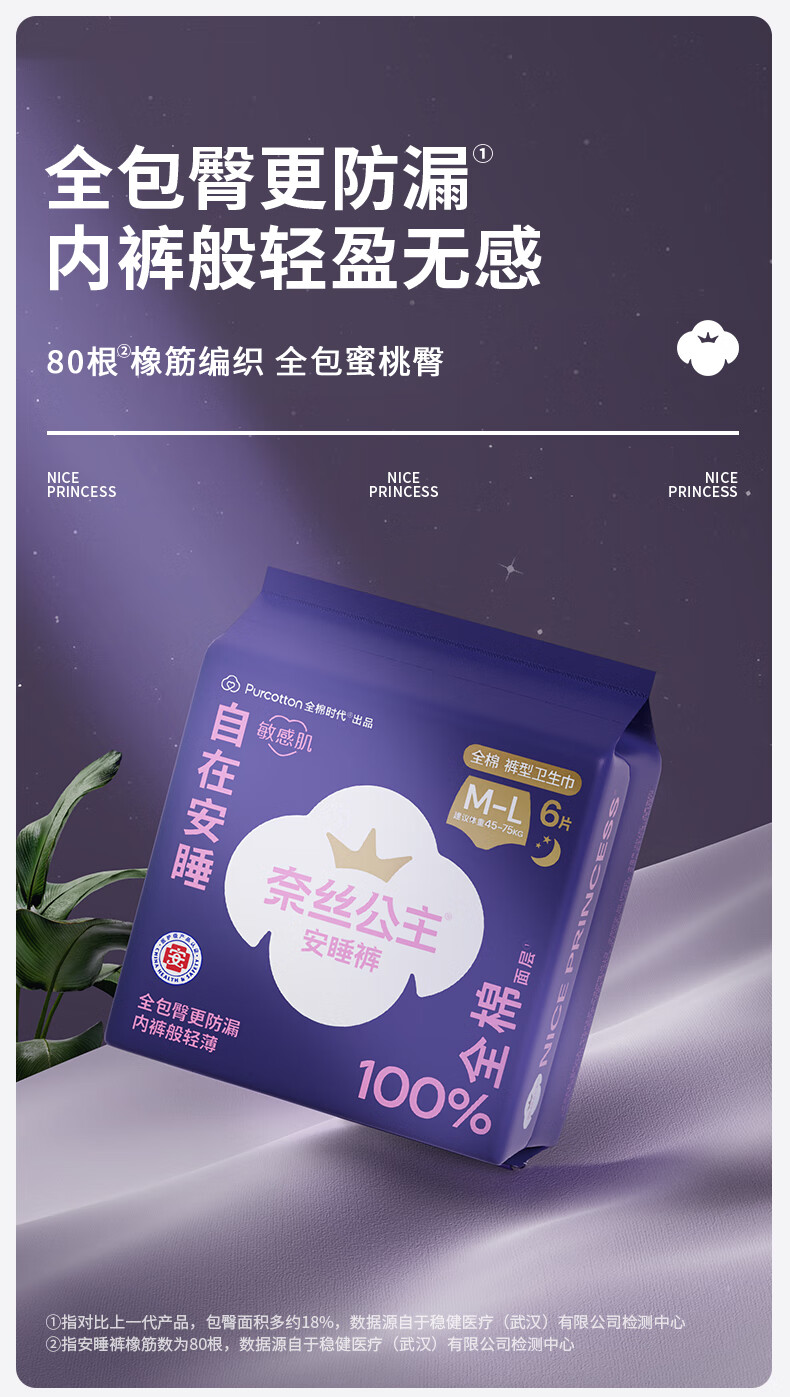 全棉时代奈丝公主医护级纯棉安心裤安睡裤裤型卫生巾ML 6条旅行装京东自营
