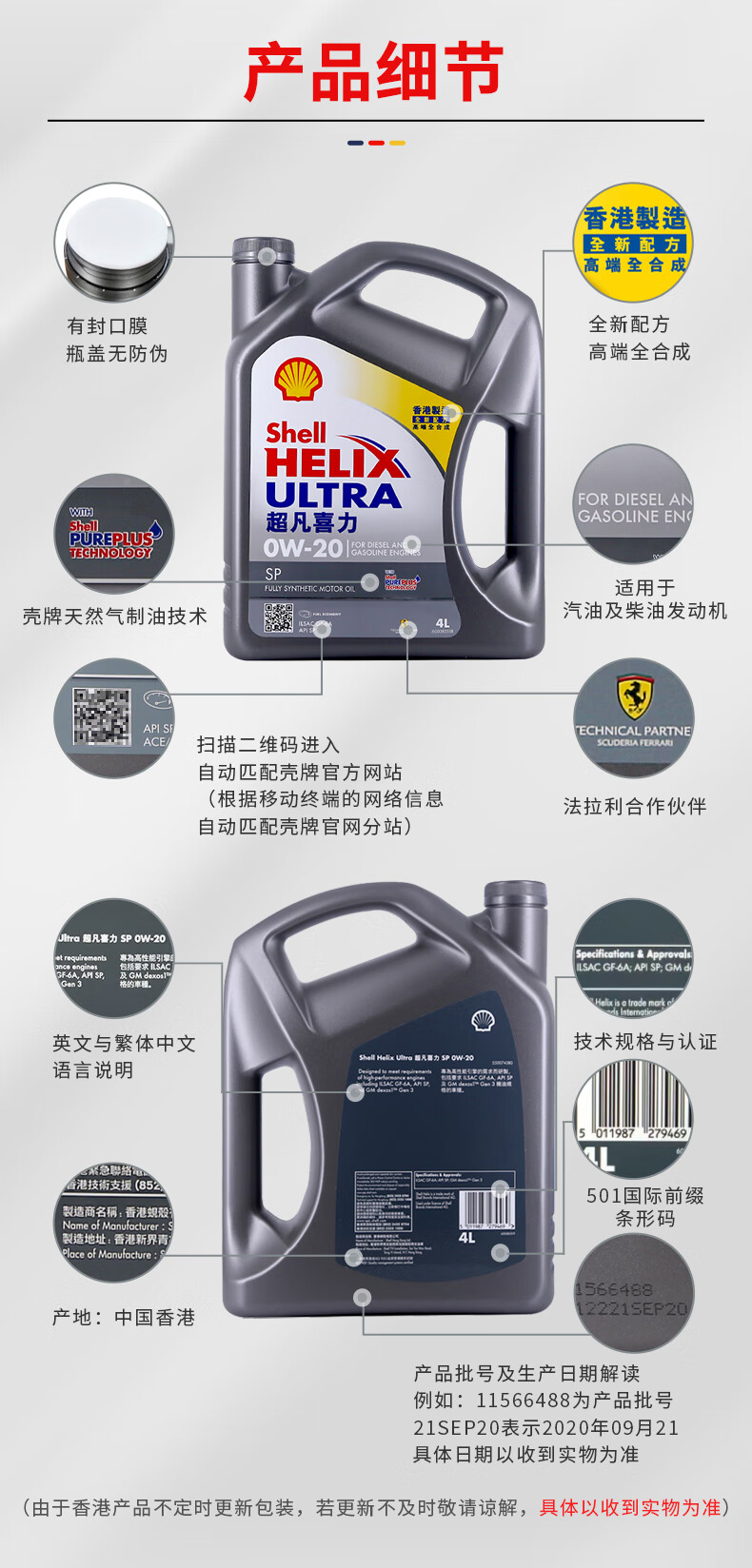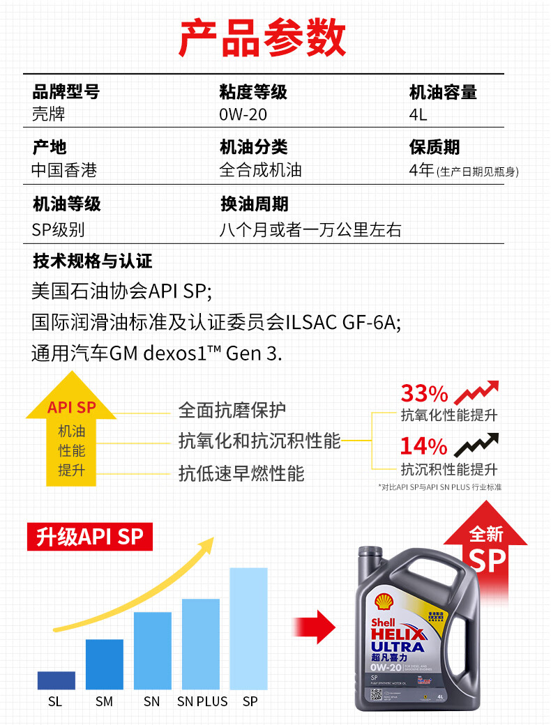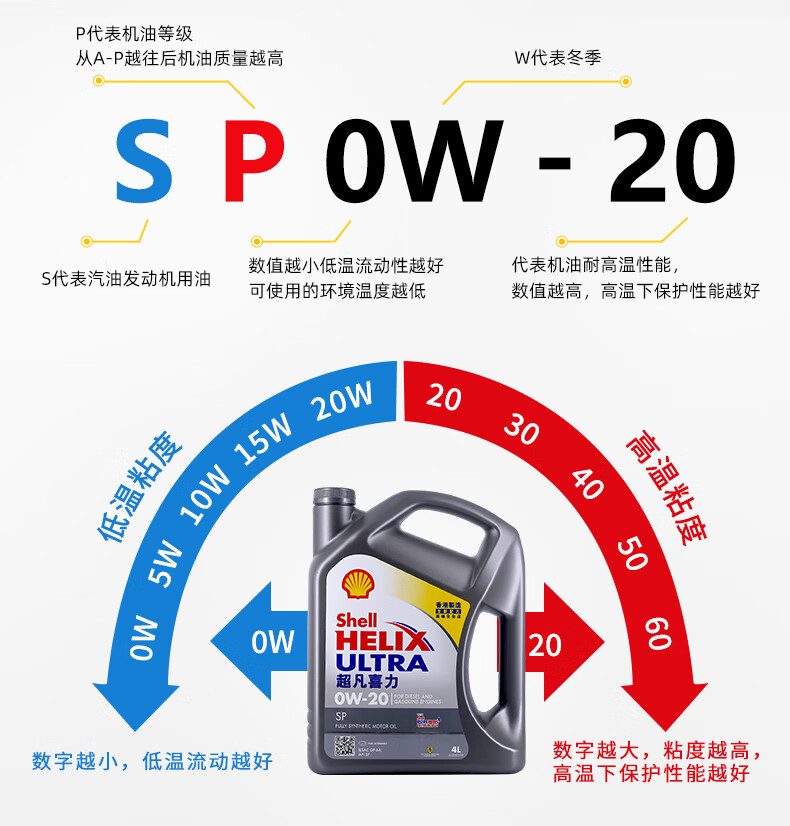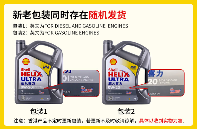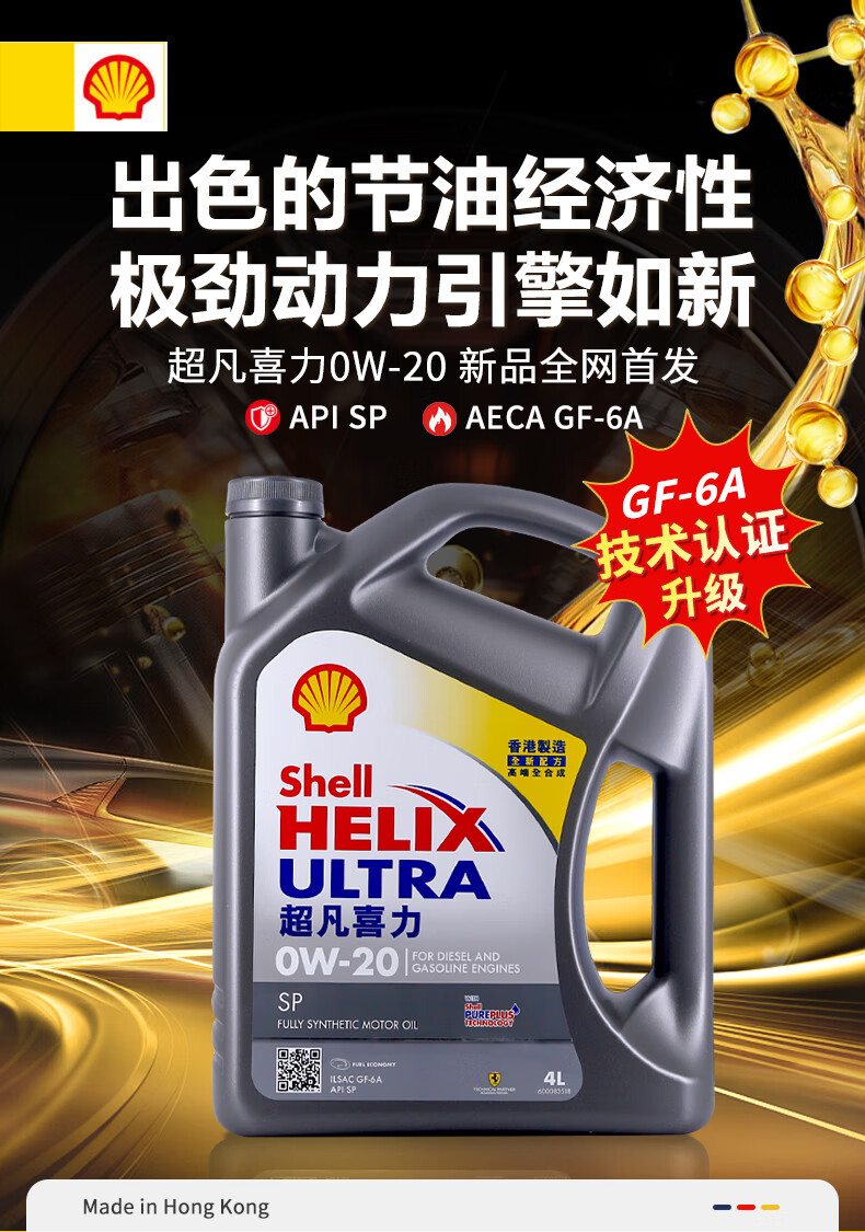 壳牌(Shell)全合成机油超凡喜力0W-20 API SP/GF-6A级 4L灰壳保养香港进口