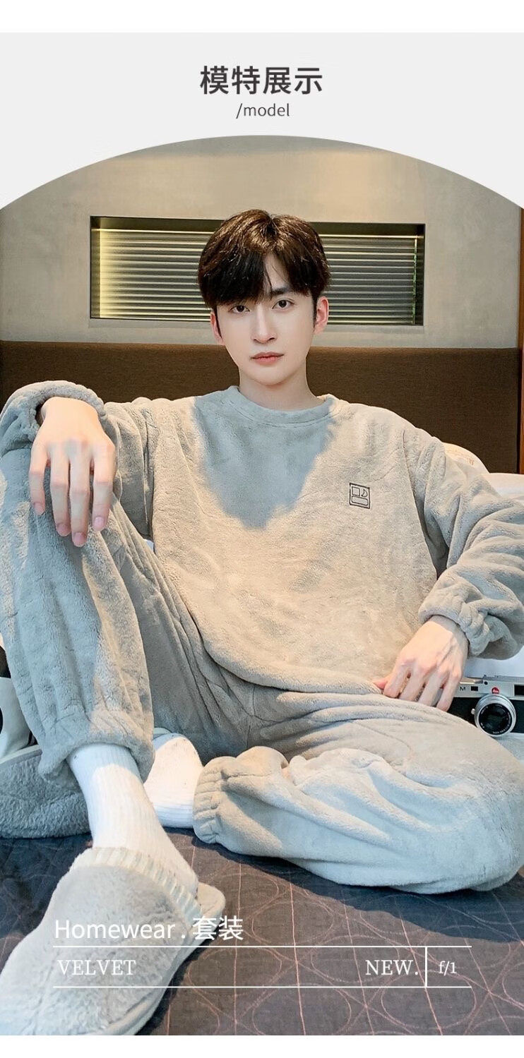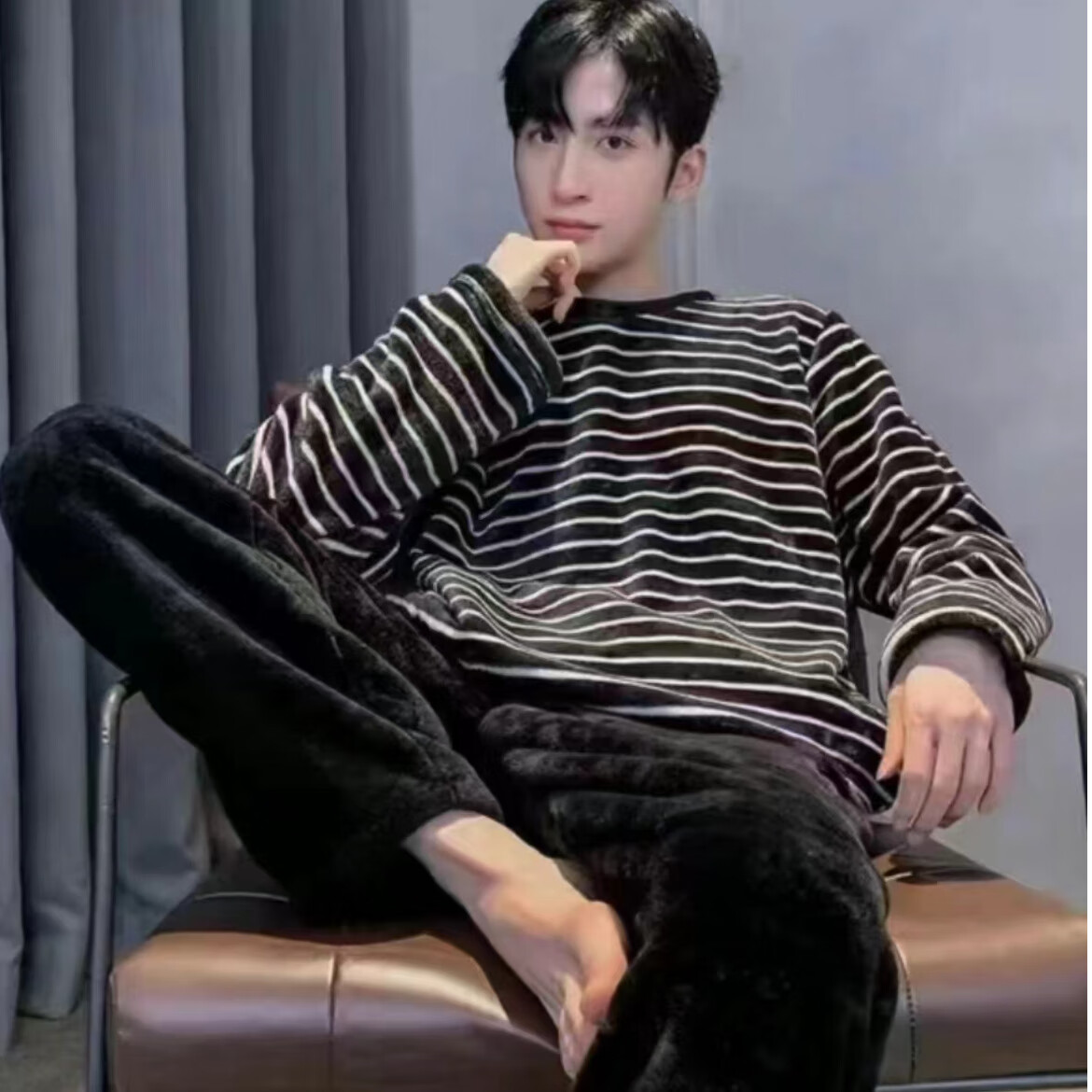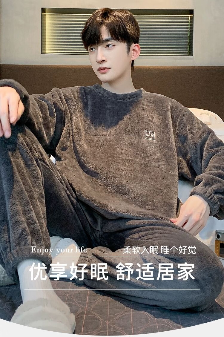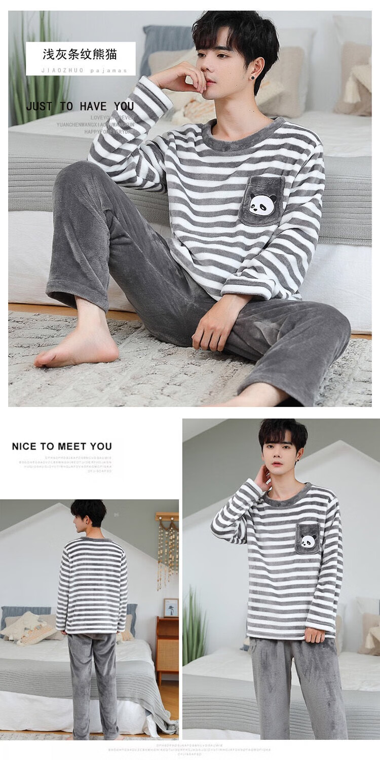 加绒加厚珊瑚绒睡衣男士秋冬款保暖条纹圆领学生可外穿家居服套装 JJL-YT1011深灰 XL 建议身高175左右,体重125-145斤