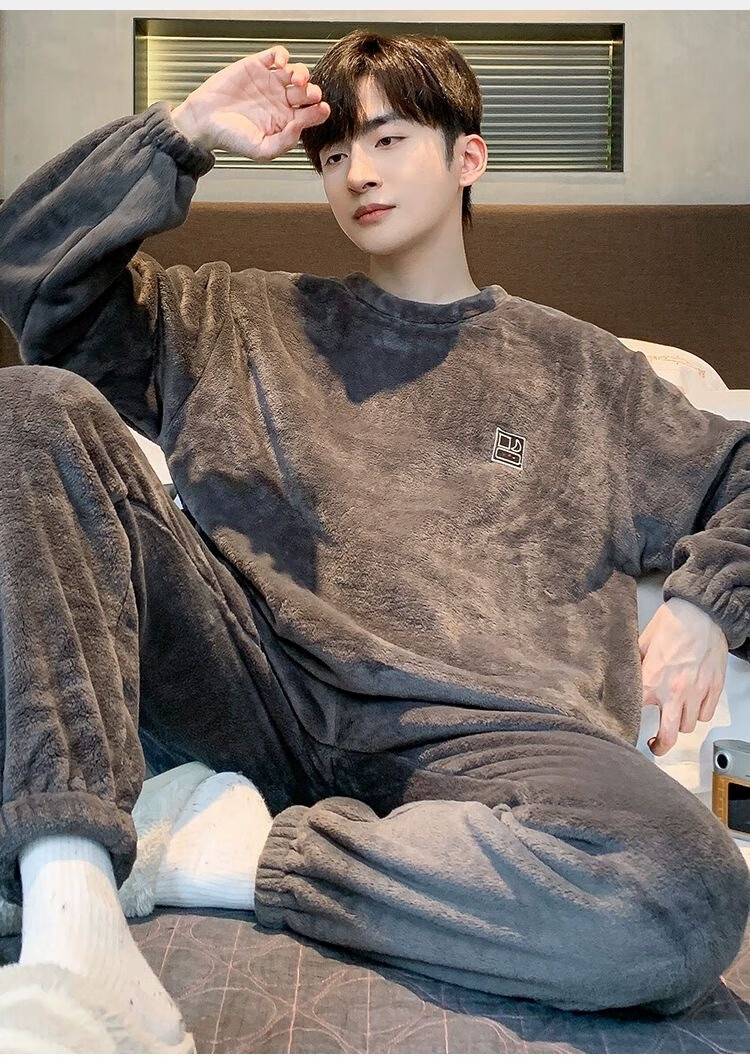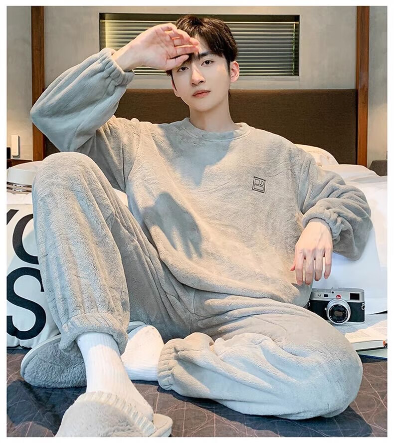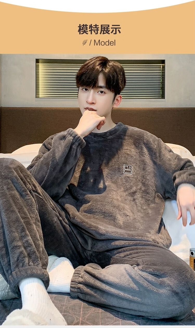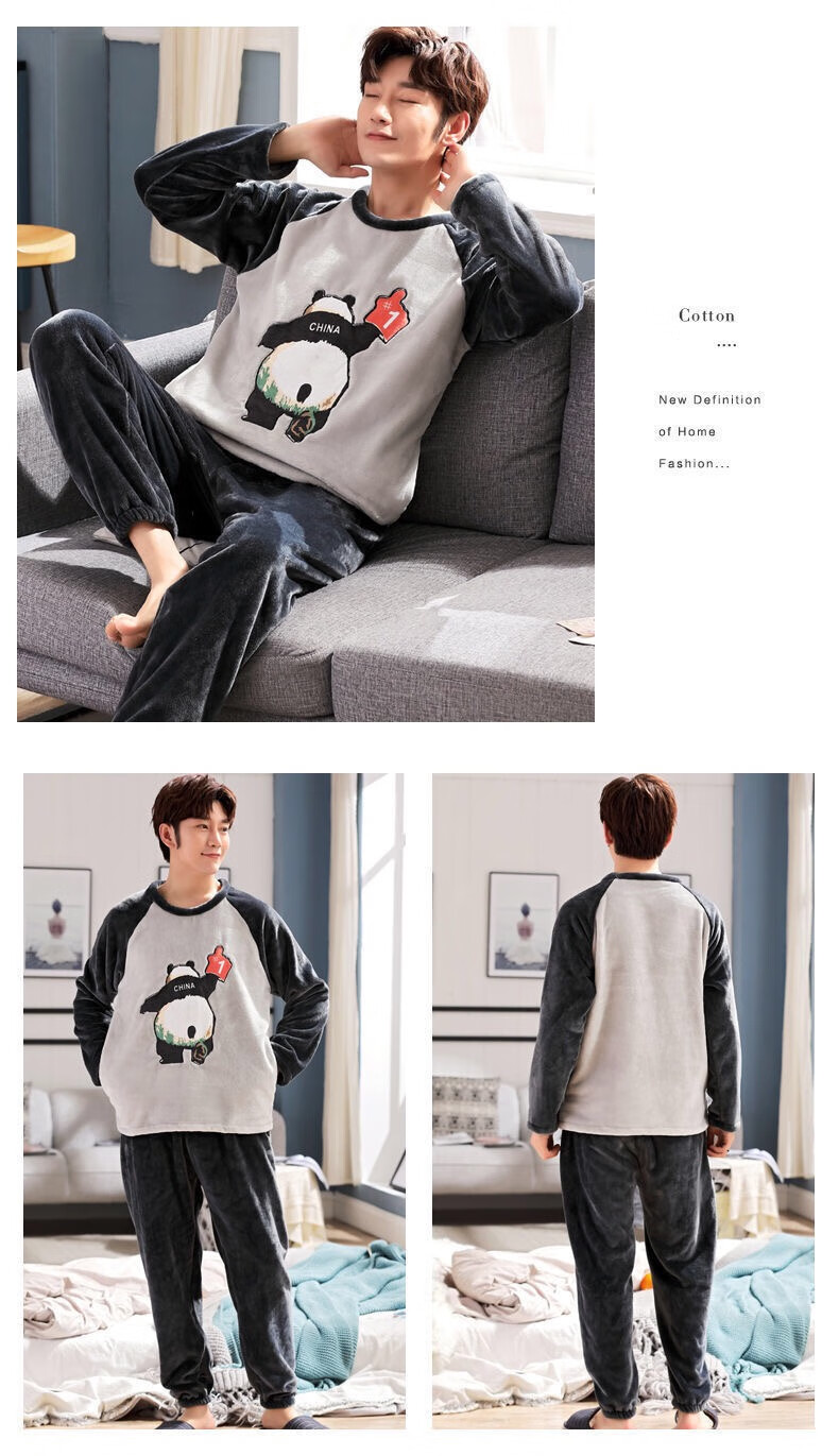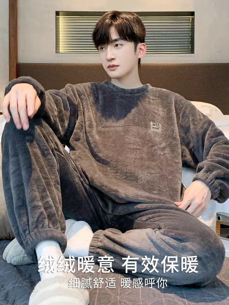 加绒加厚珊瑚绒睡衣男士秋冬款保暖条纹圆领学生可外穿家居服套装 JJL-YT1011深灰 XL 建议身高175左右,体重125-145斤