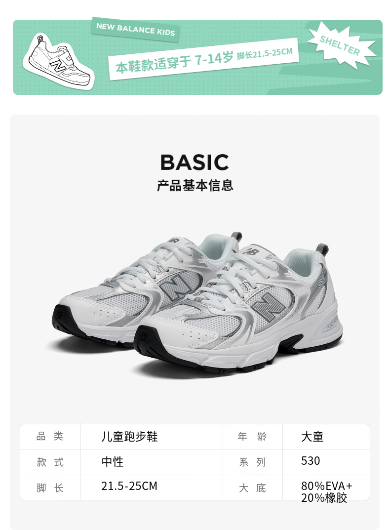 NEW BALANCE7-14岁男女童液态银网面运动鞋GR530AD