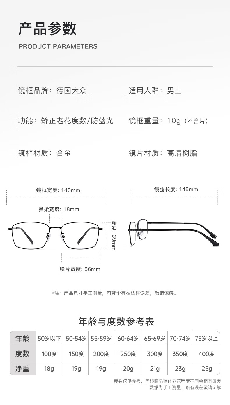 大众德国大众老花镜男士商务超轻高清晰防蓝光眼镜正品花镜W231-400