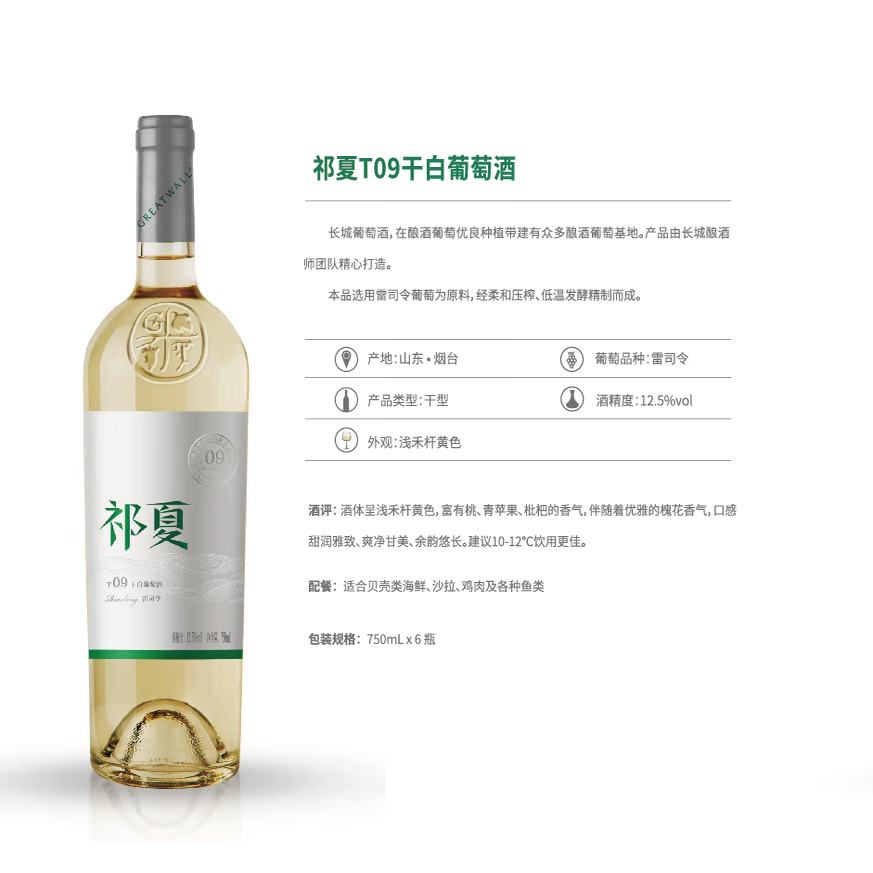 祁夏T09 雷司令干白葡萄酒 750ml微醺自饮送礼约会酒 12.5度750ml*6