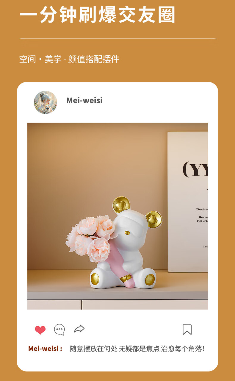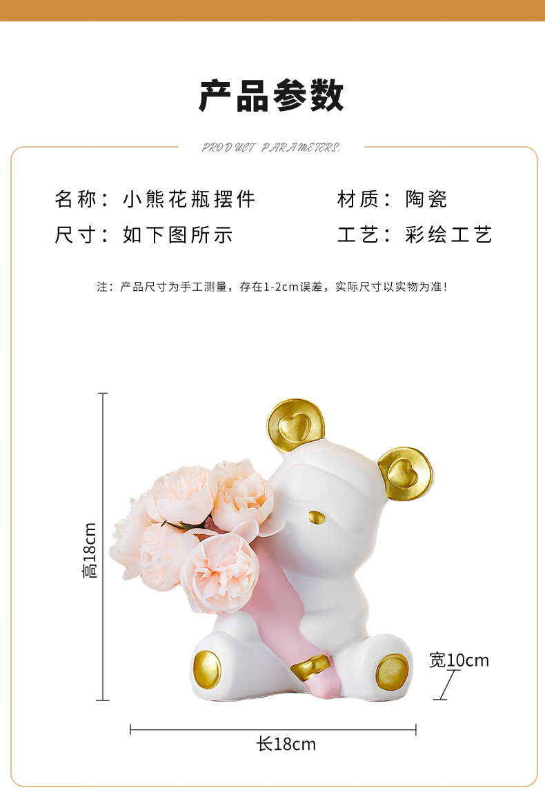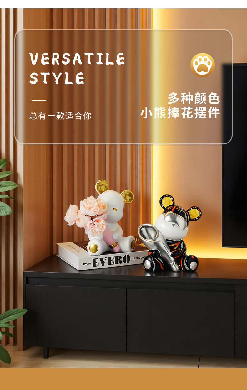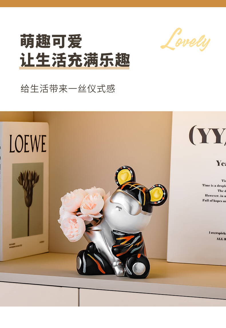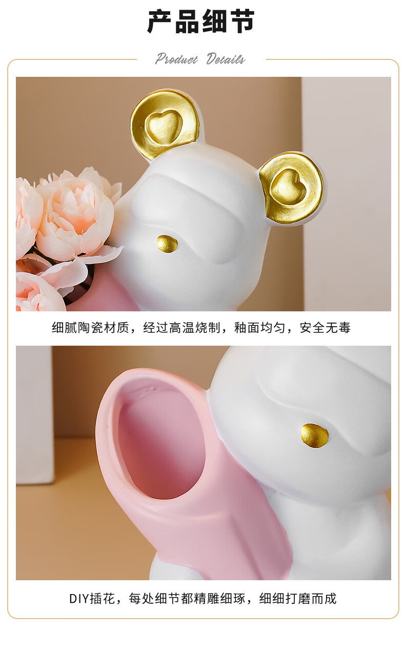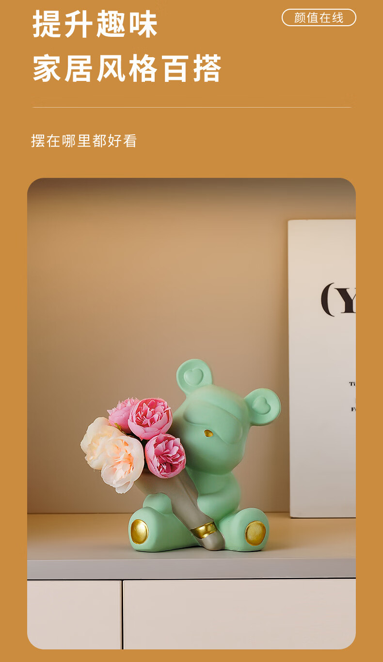 创意捧花暴力熊情绪摆件客厅玄关酒柜电视柜桌面家居装饰礼物 小熊花瓶(森绿色)送1束香槟1束粉色