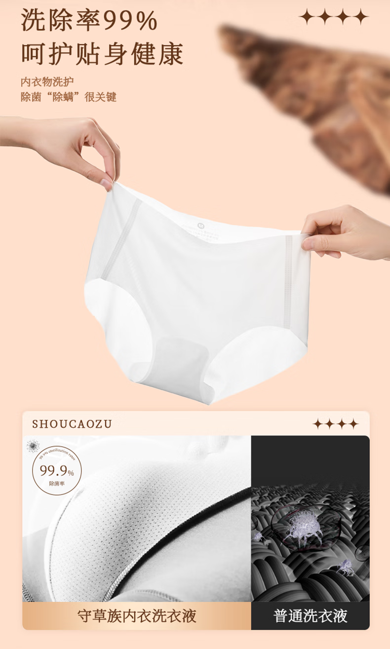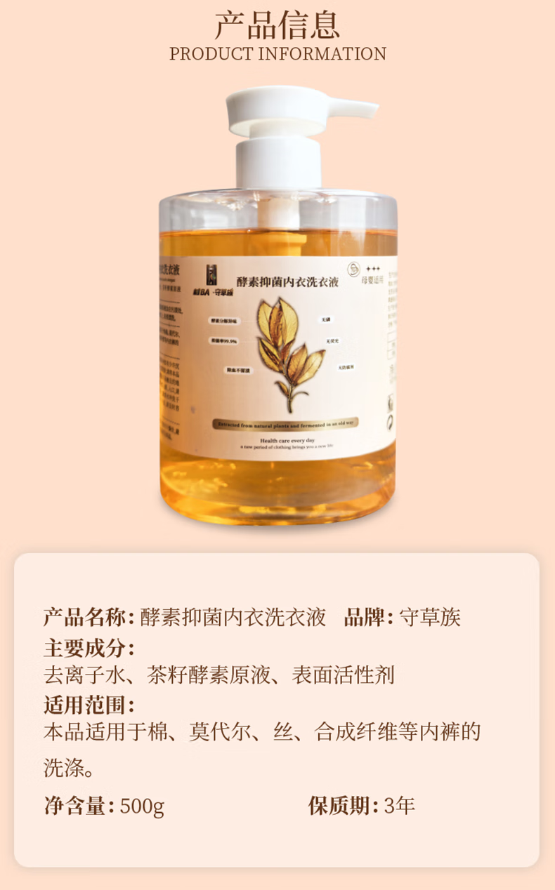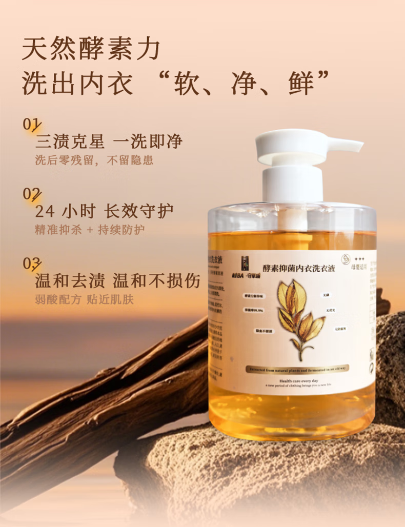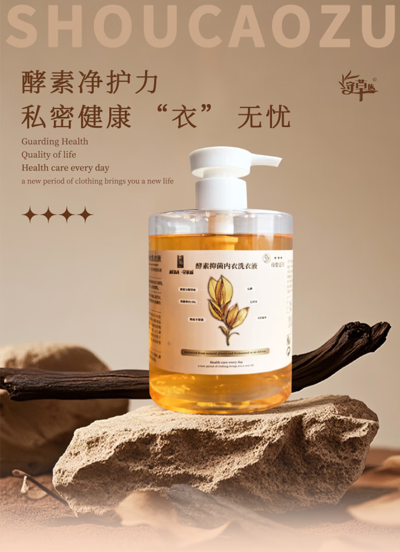 守草族酵素抑菌内衣洗衣液洗内衣内裤专用去血渍去黄渍去异味多效去污渍 酵素抑菌内衣洗500g*3瓶