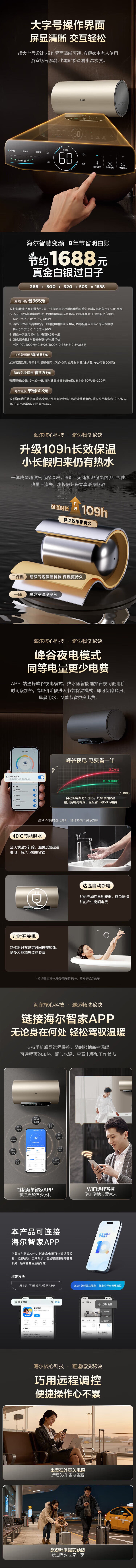 海尔(Haier)国家补贴电热水器80升 JT3 金刚无缝胆 3300W变频节能速热 终身免换镁棒 一级能效家用储水式