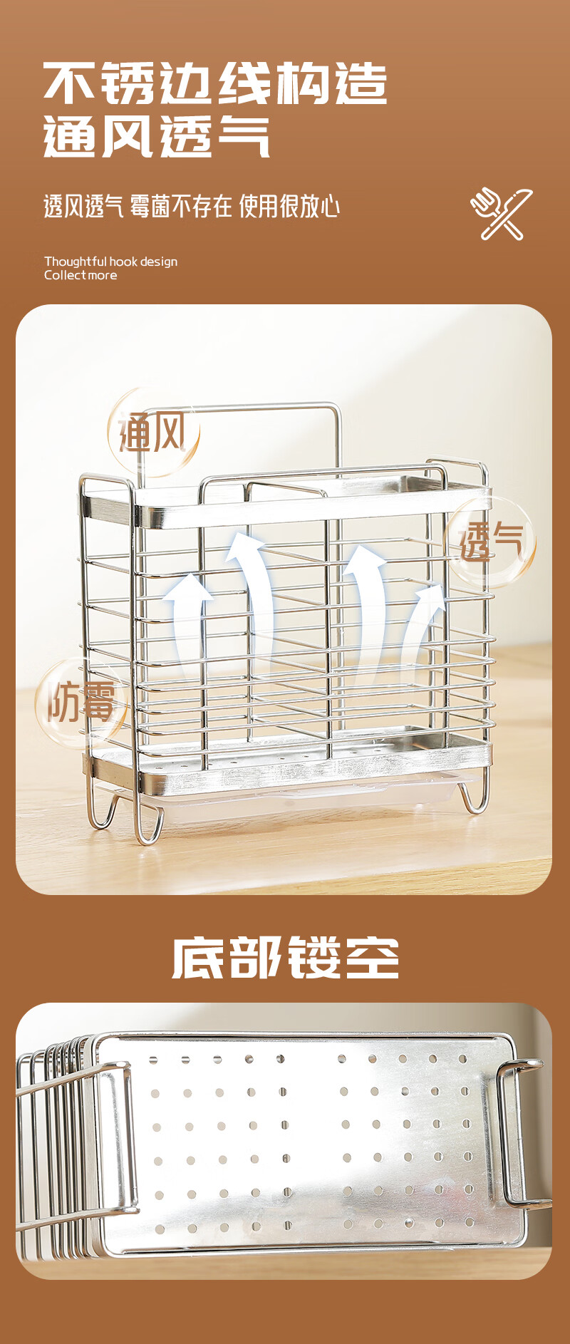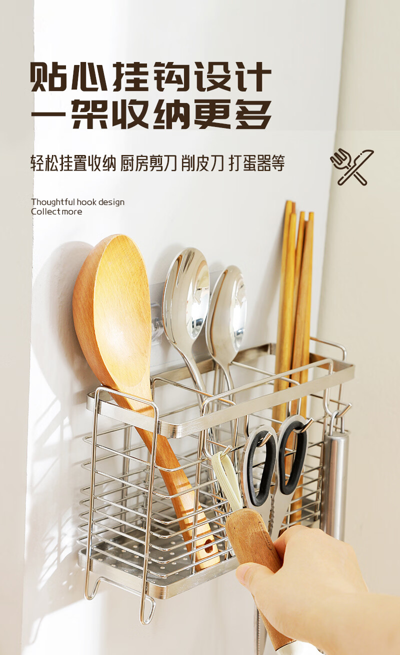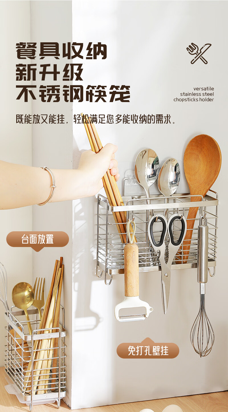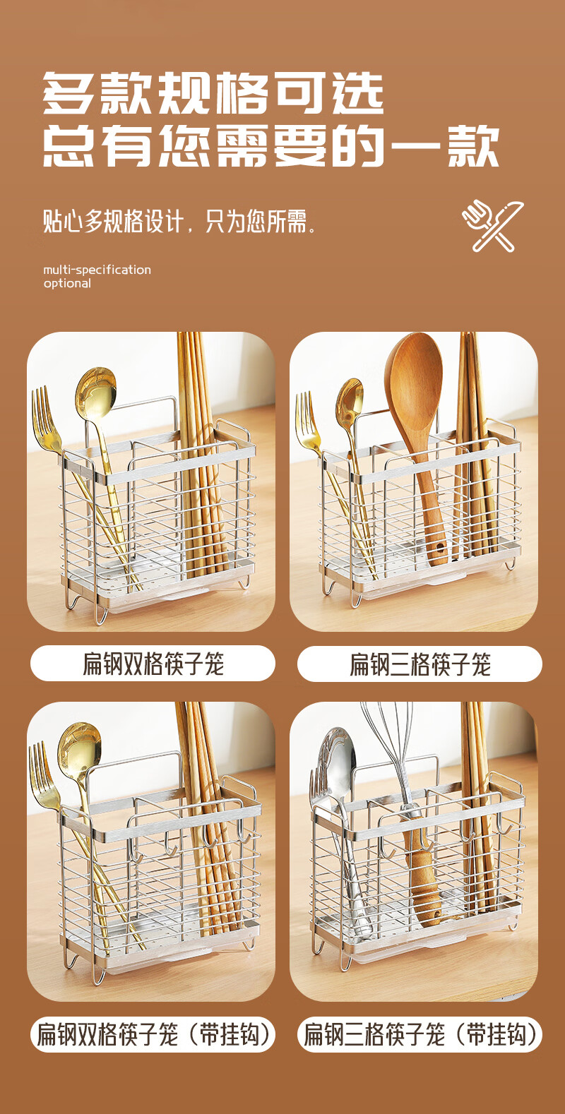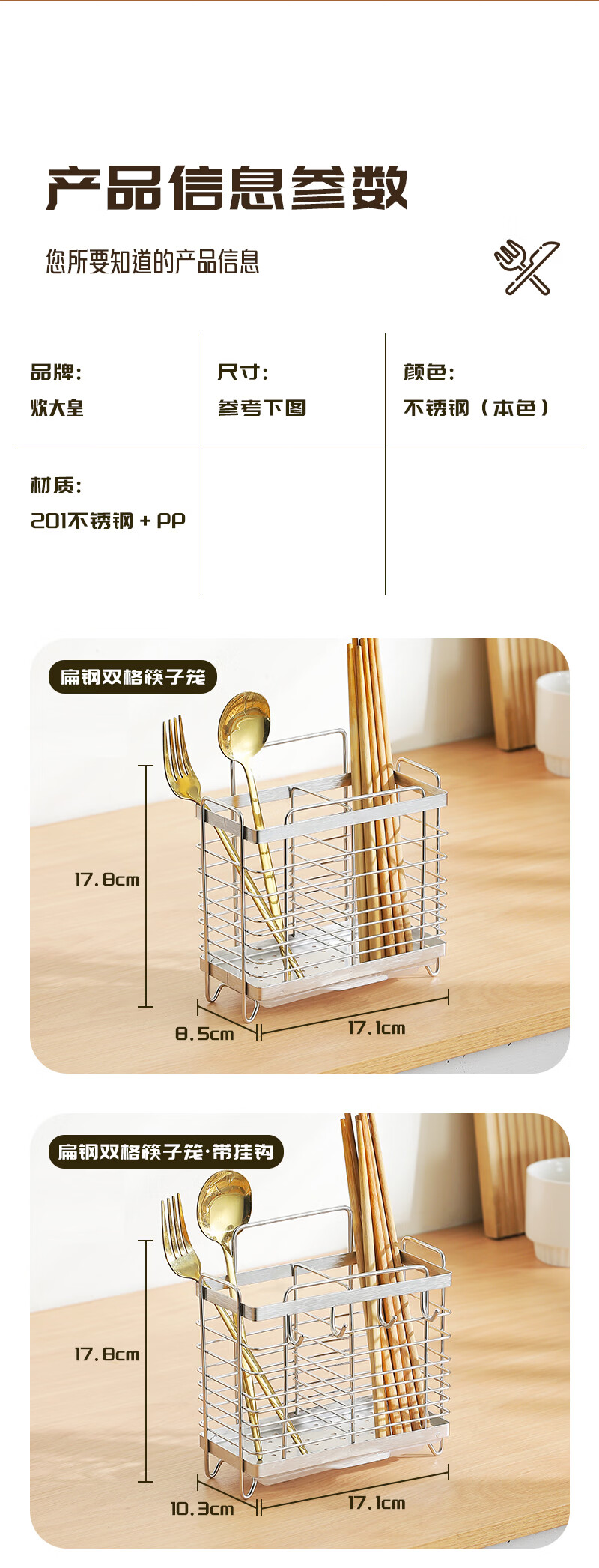 炊大皇厨房置物架不锈钢筷子收纳盒壁通风挂式放筷子筒免打孔沥水筷笼架 A1【本色不锈钢】扁钢双格筷子笼