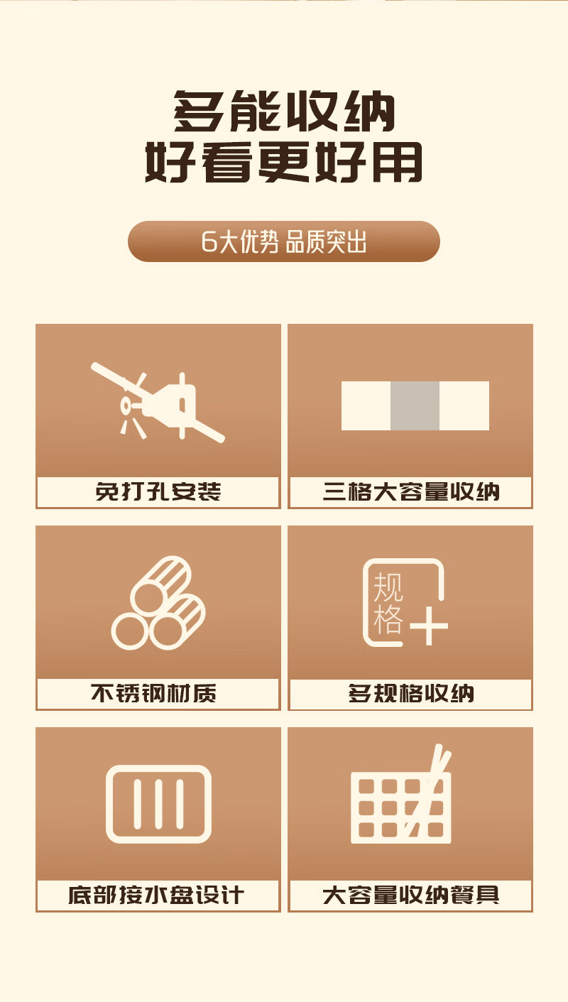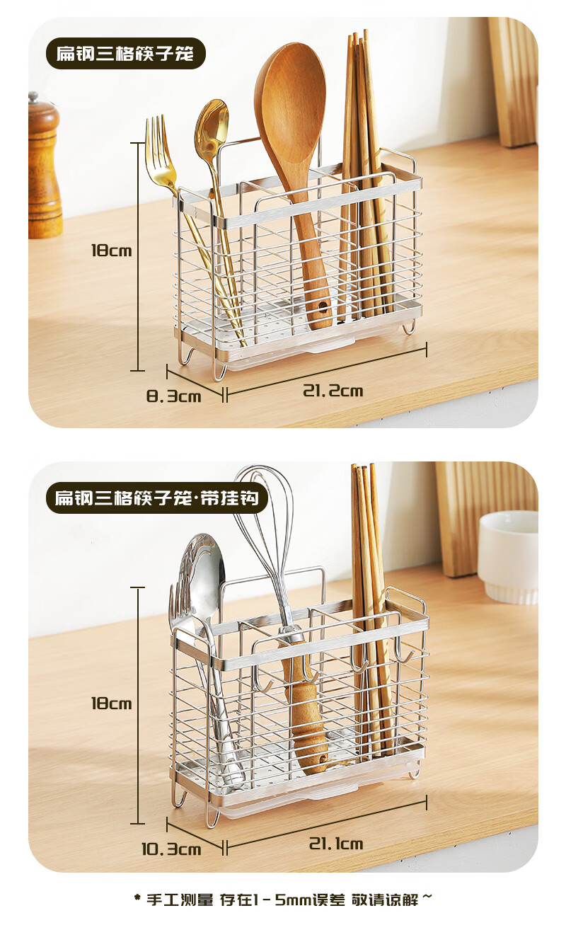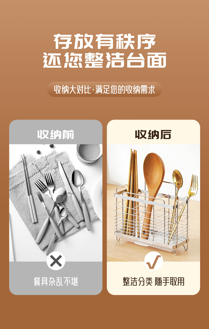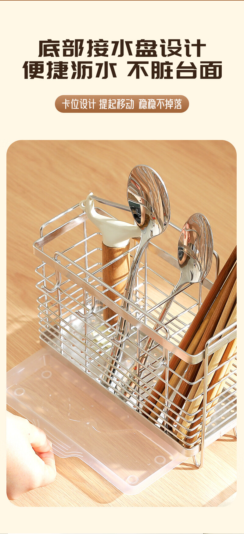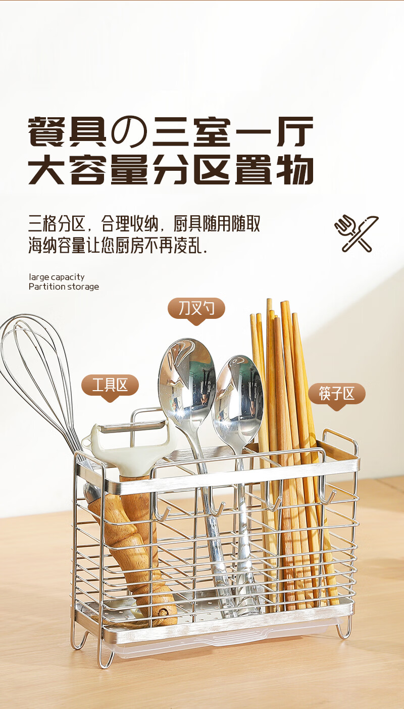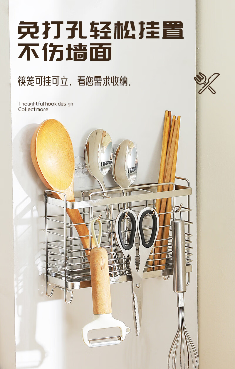 炊大皇厨房置物架不锈钢筷子收纳盒壁通风挂式放筷子筒免打孔沥水筷笼架 A1【本色不锈钢】扁钢双格筷子笼