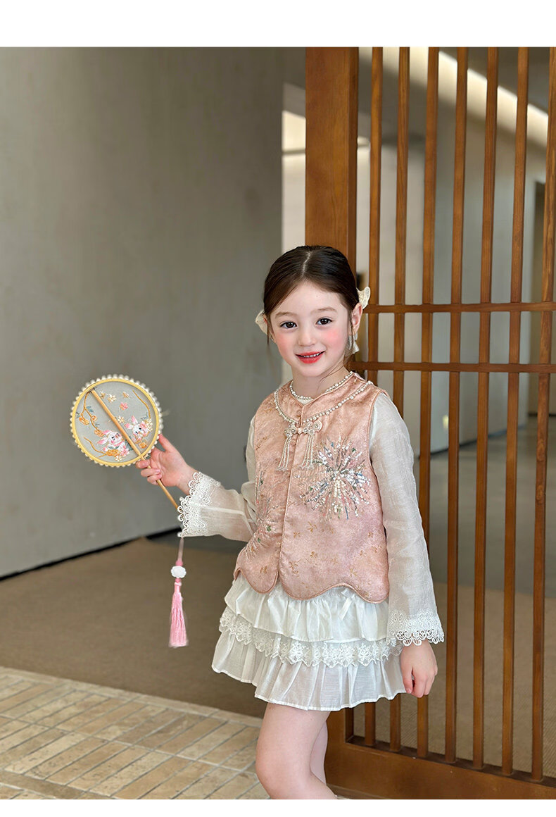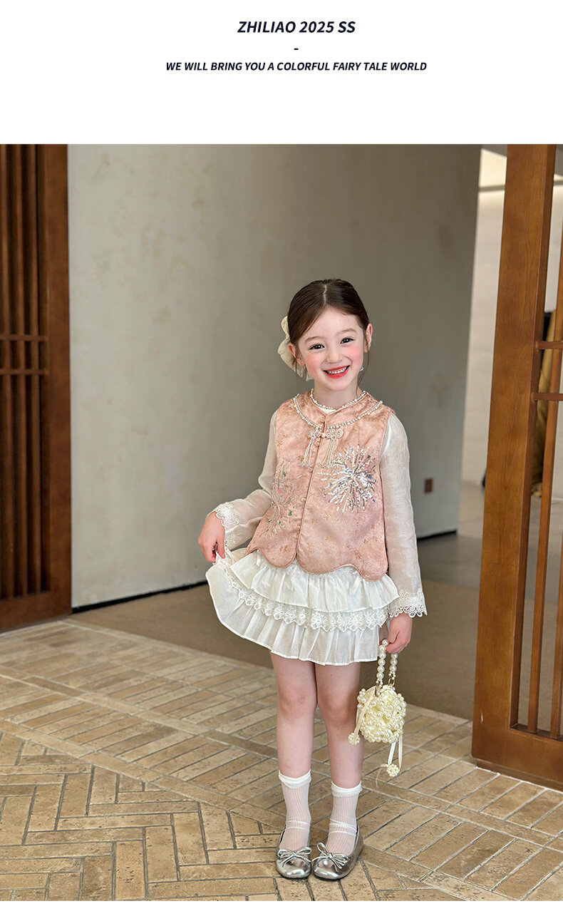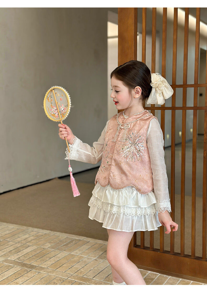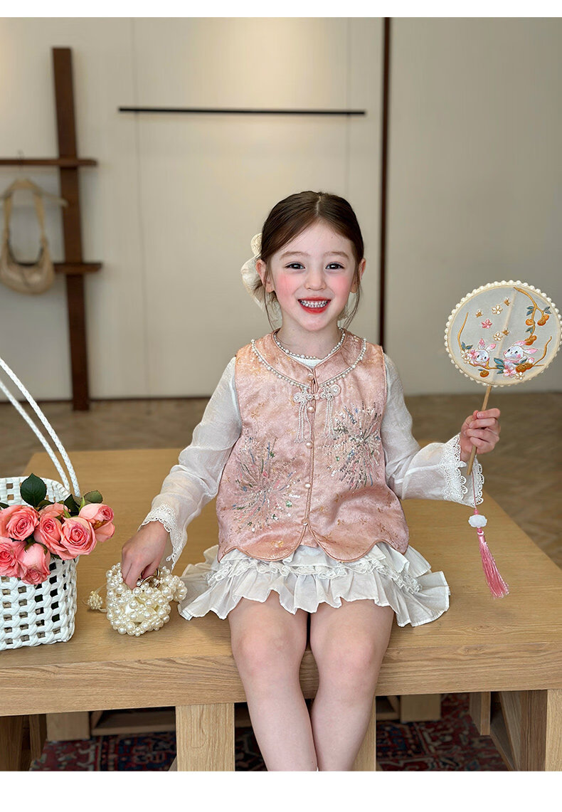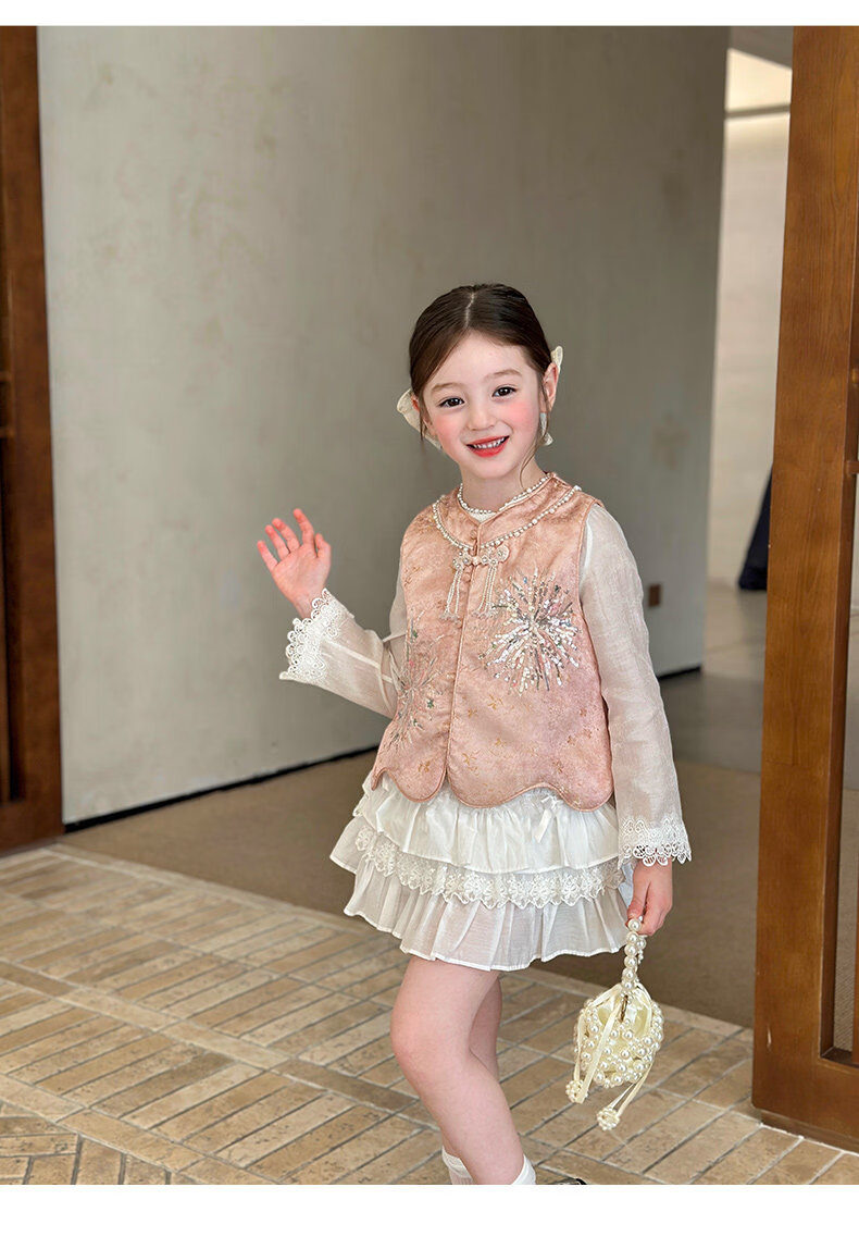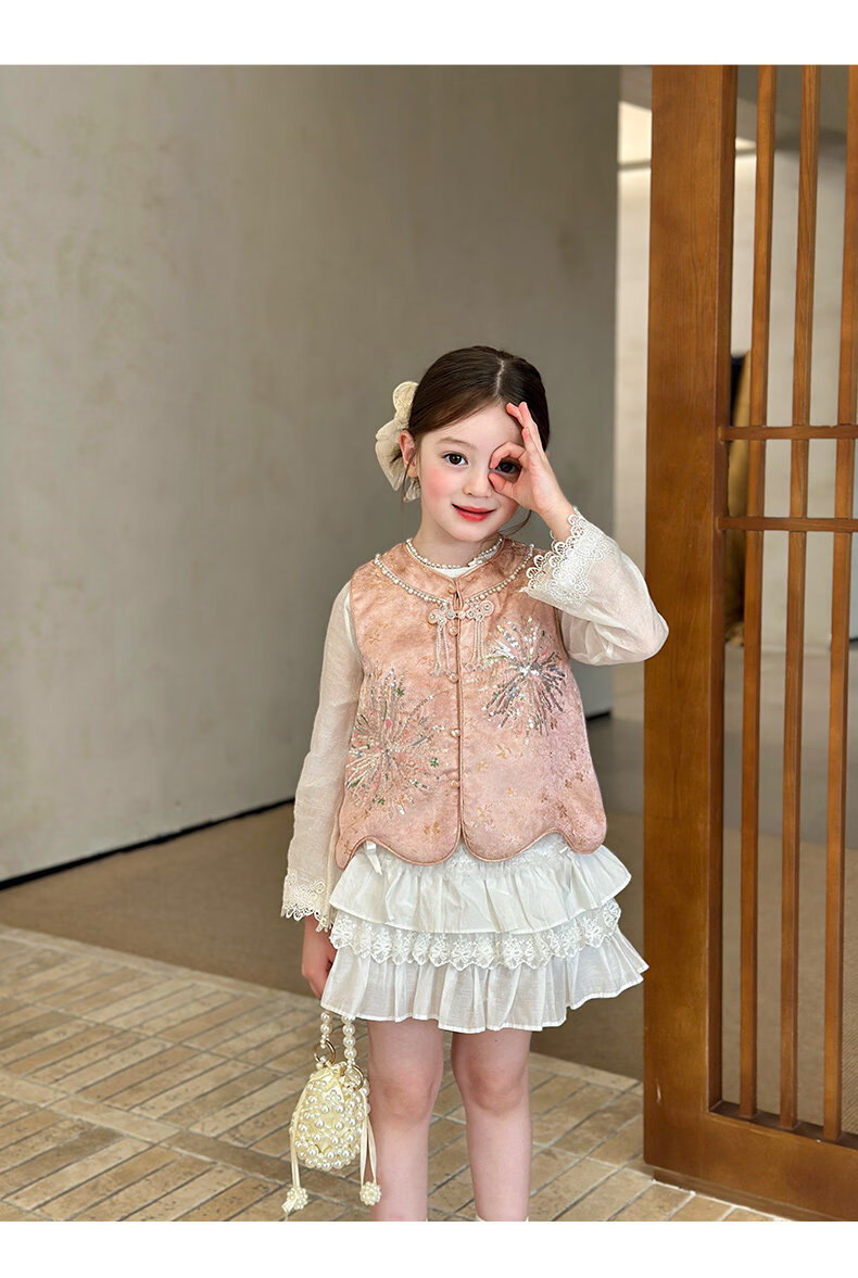 栀了成长记童装女童新中式圆领马甲2026春季儿童国风亮片无袖上衣 粉色 马甲 100 cm