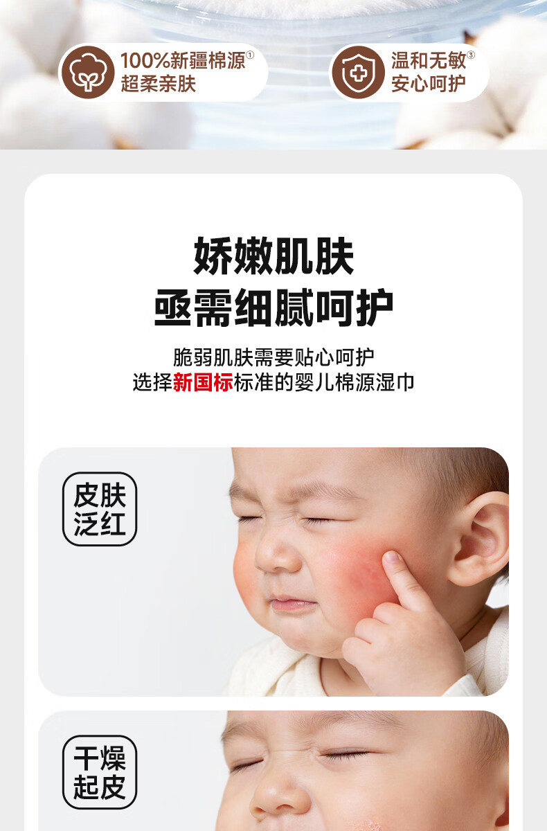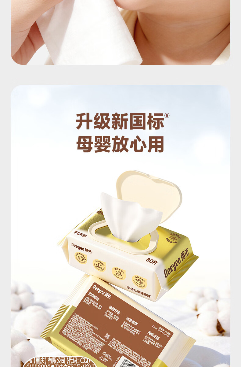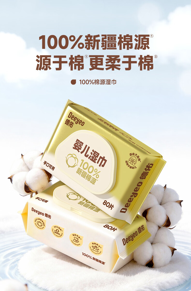 德佑超柔软100%新疆棉源手口湿巾 婴儿湿纸巾80抽*3包新生儿专用