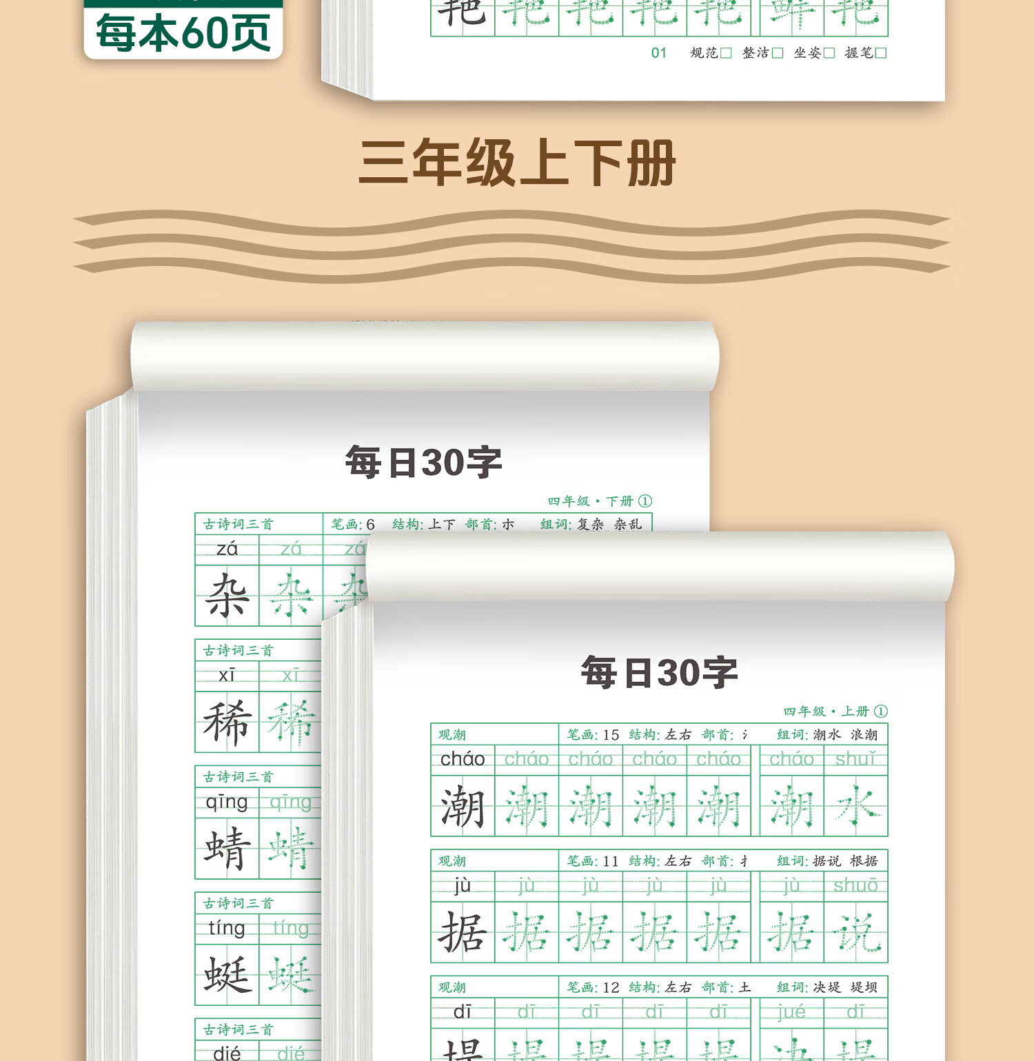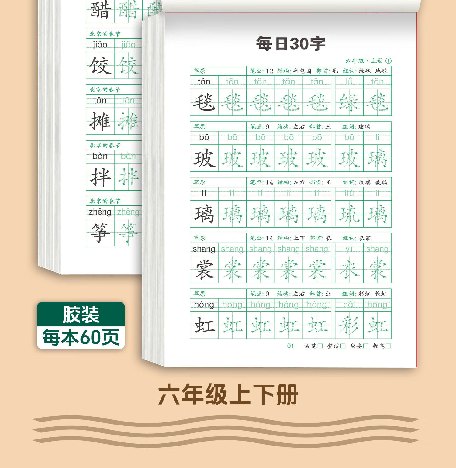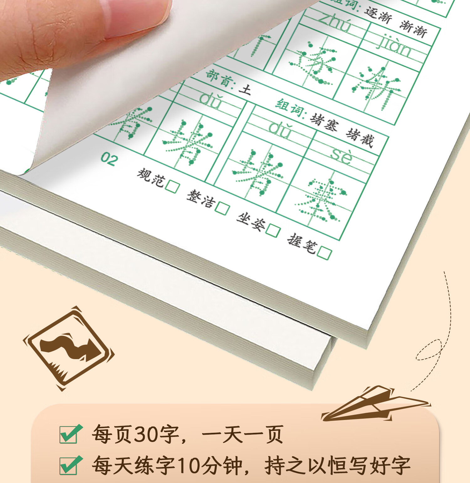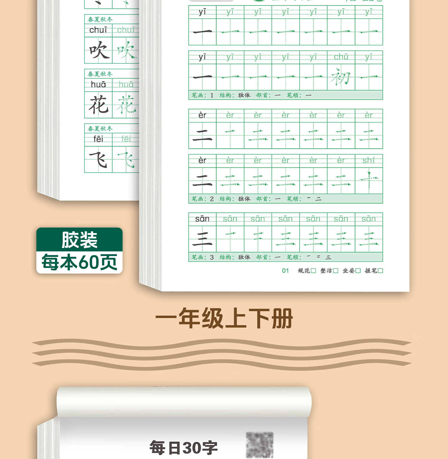 嘟乐仔学生一年级减压练字帖语文字帖点阵每日30字生字描红练字本上册 【课本同步】1年级 上册3本(3本/60页)