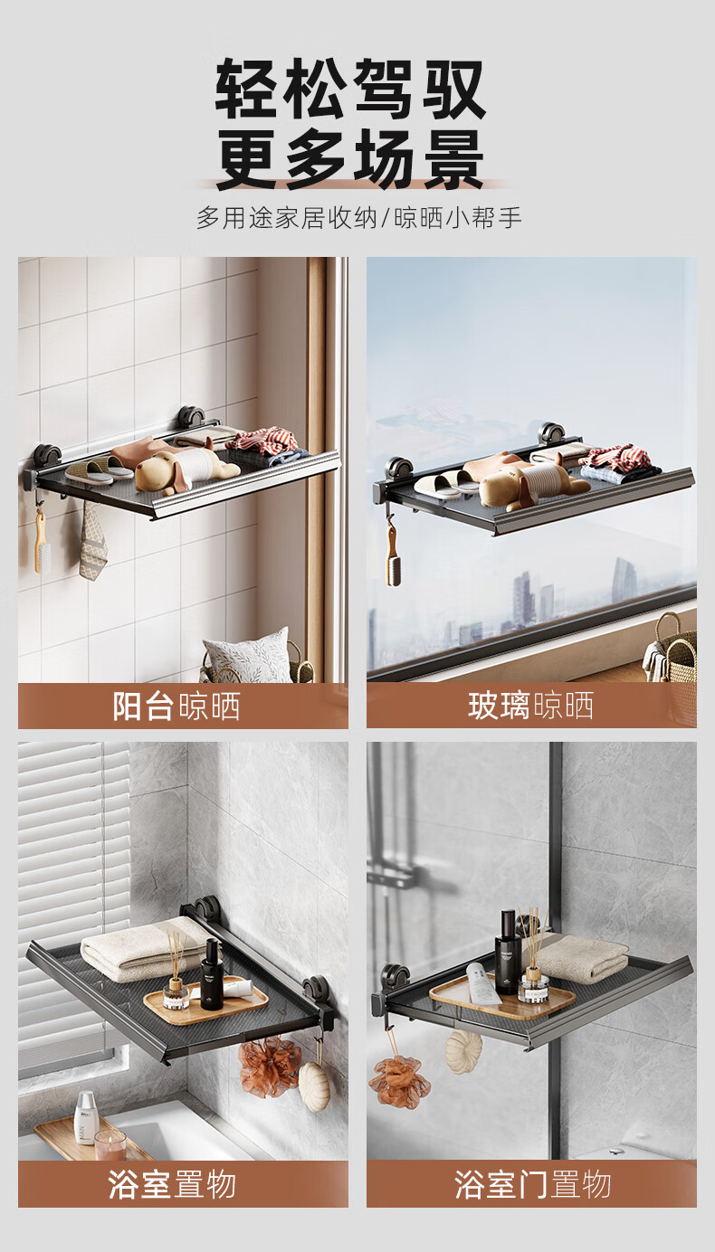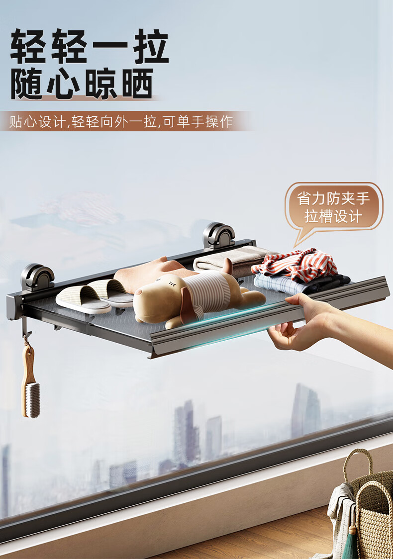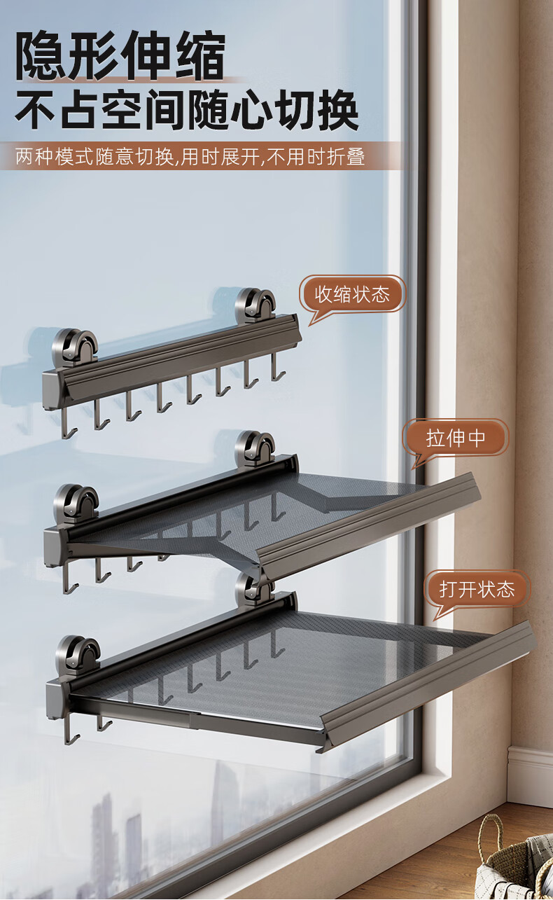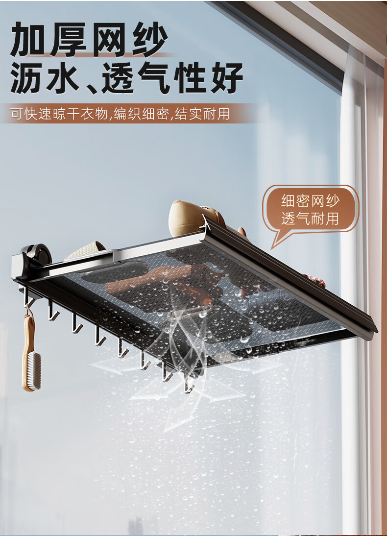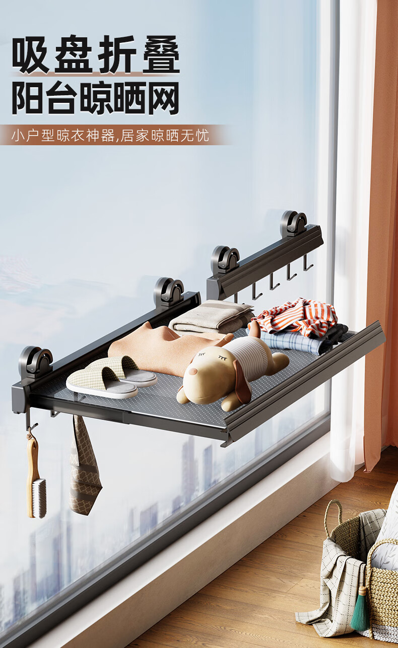 尔思家隐形晾衣架吸盘伸缩折叠晾晒网室内凉晒袜子阳台空间利用晾衣神器 枪灰色吸盘式折叠抽拉晾晒网小号(含6钩)
