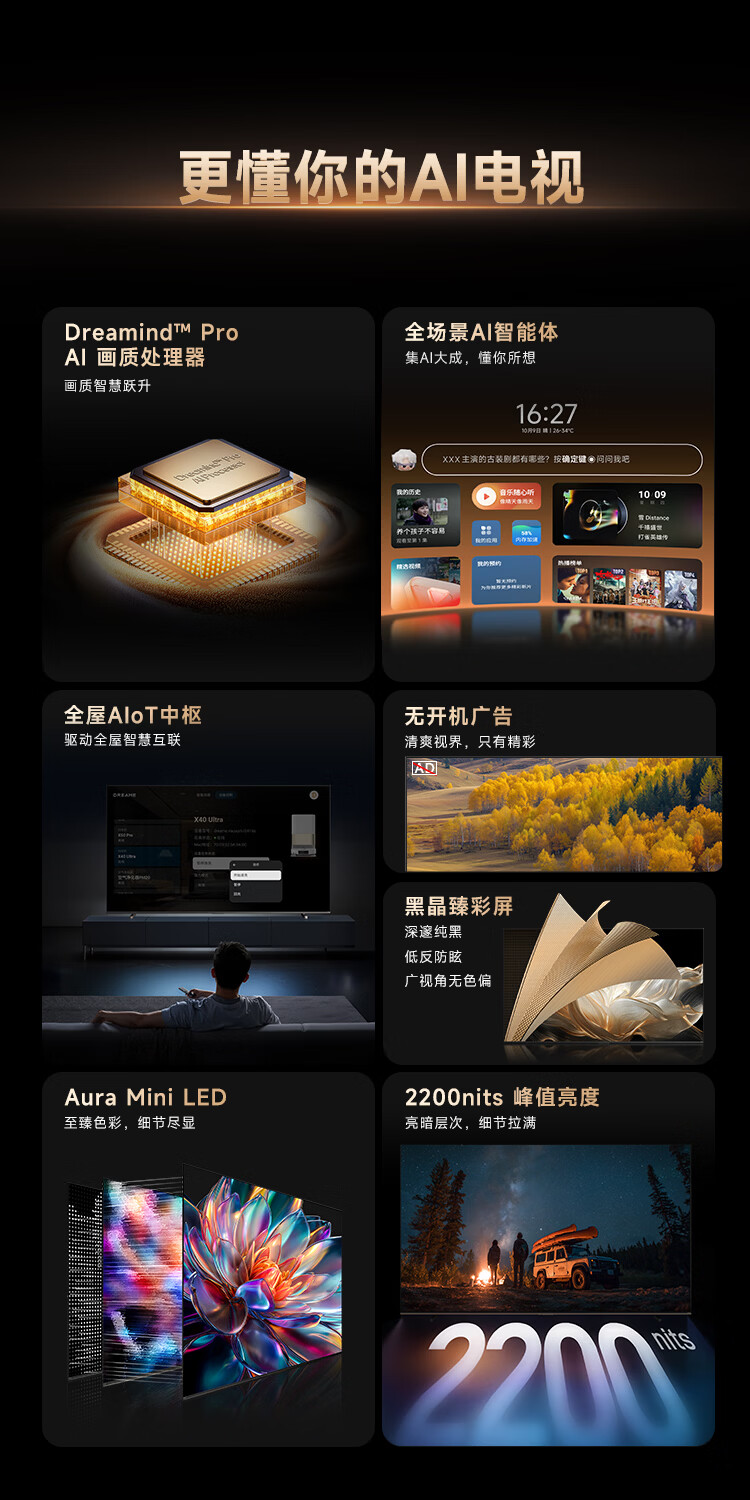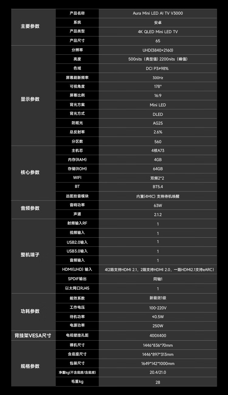 追觅AI电视(春晚同款) 65英寸 65V3000 Aura Mini LED 4K超高清电视机 300Hz高刷 无开机广告 65英寸