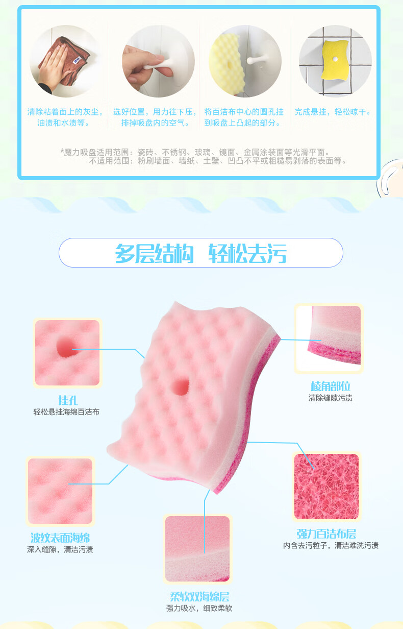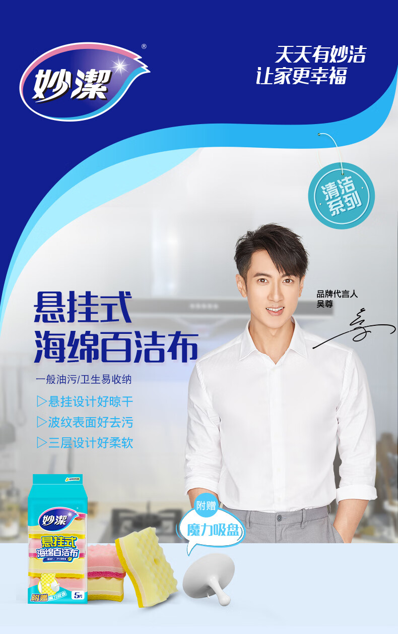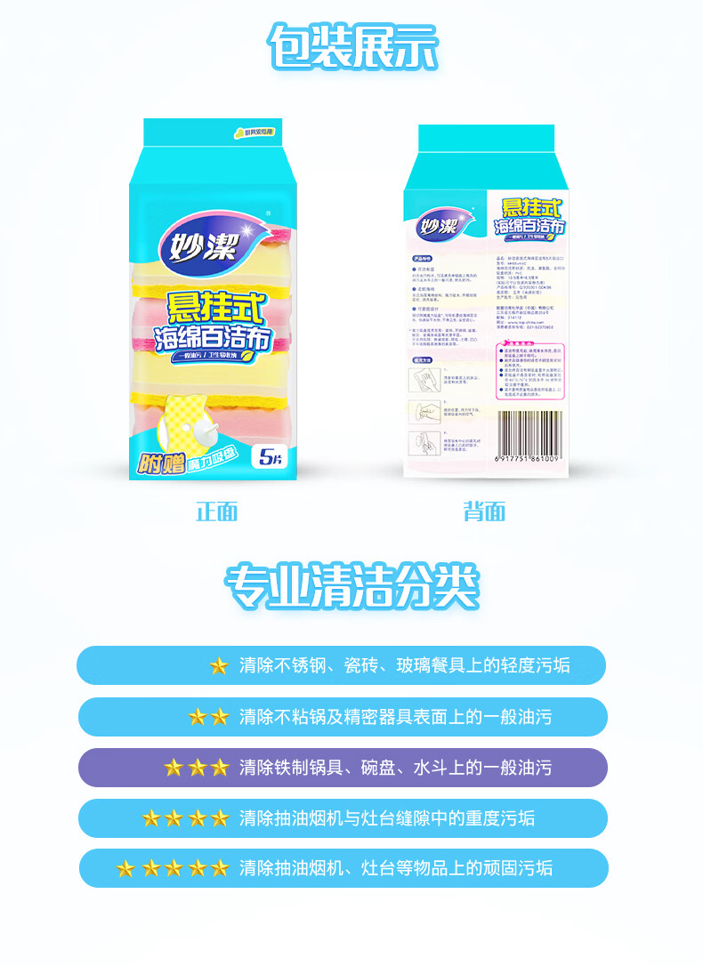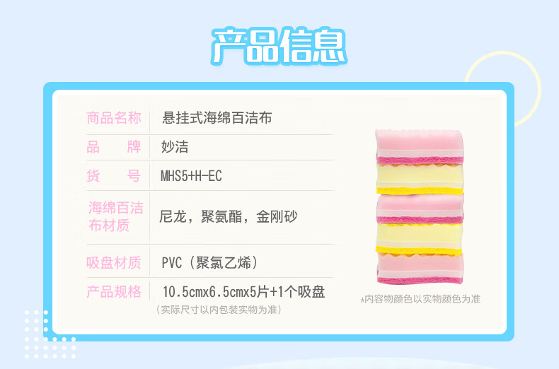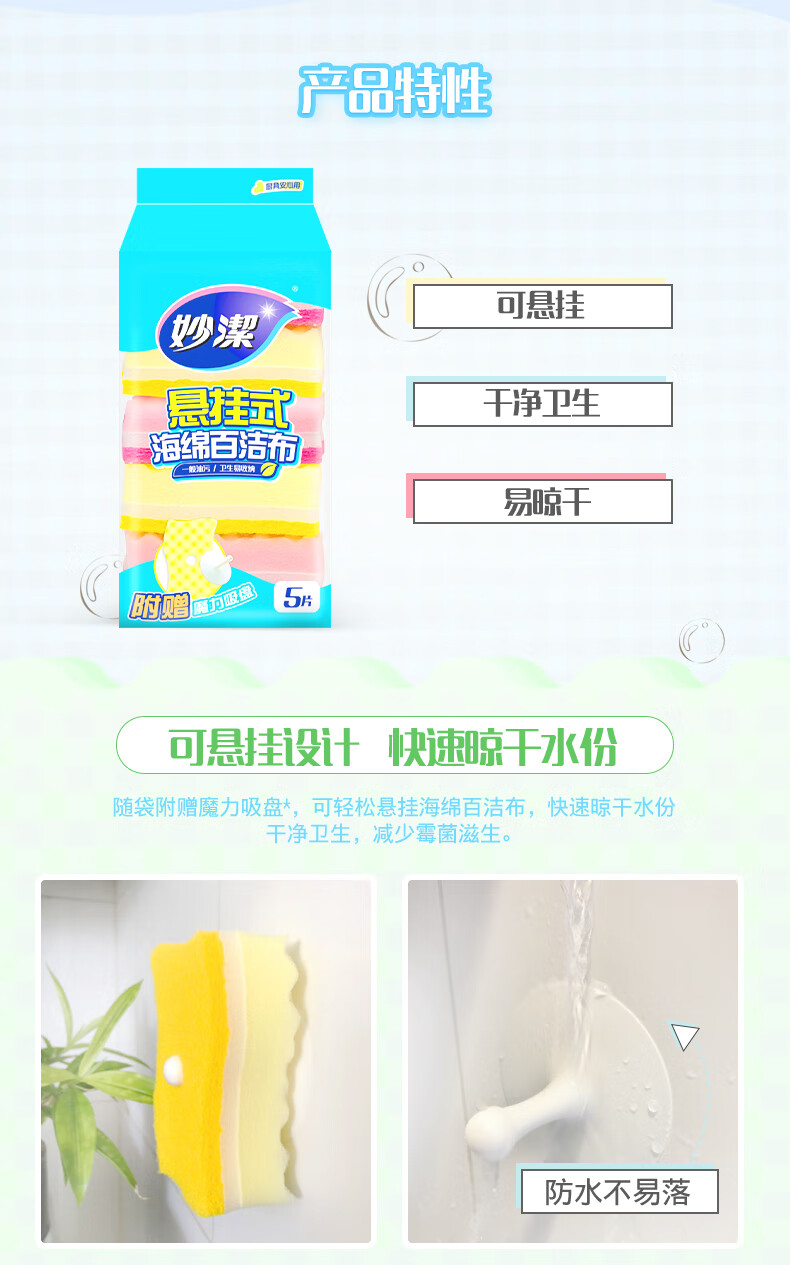 妙洁 悬挂式海绵百洁布 5片装 包装内含悬挂吸盘 厨房洗碗抹布神器