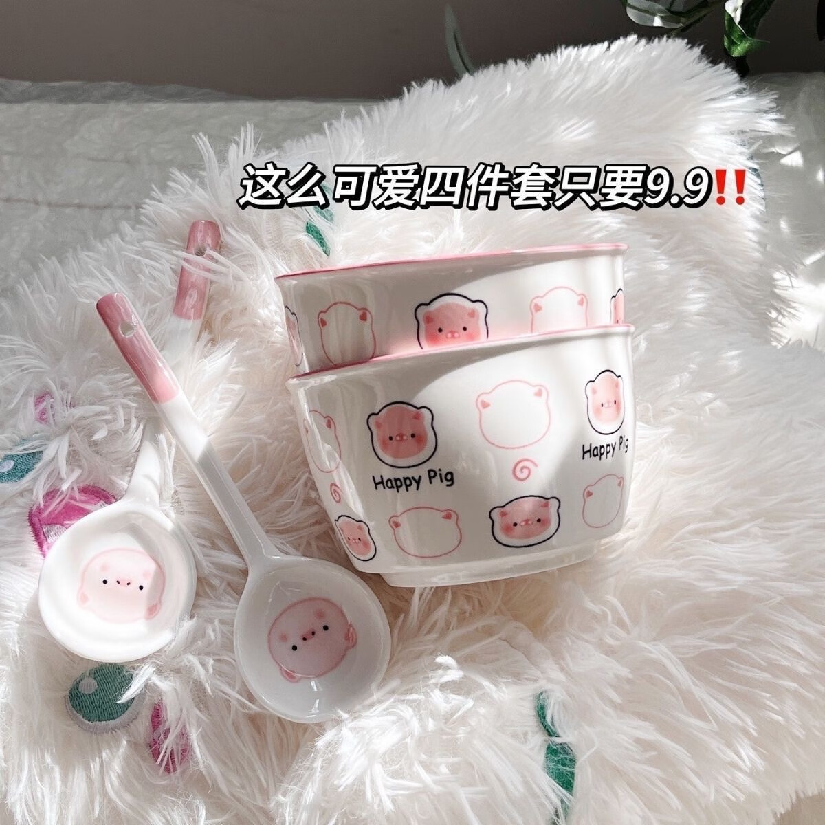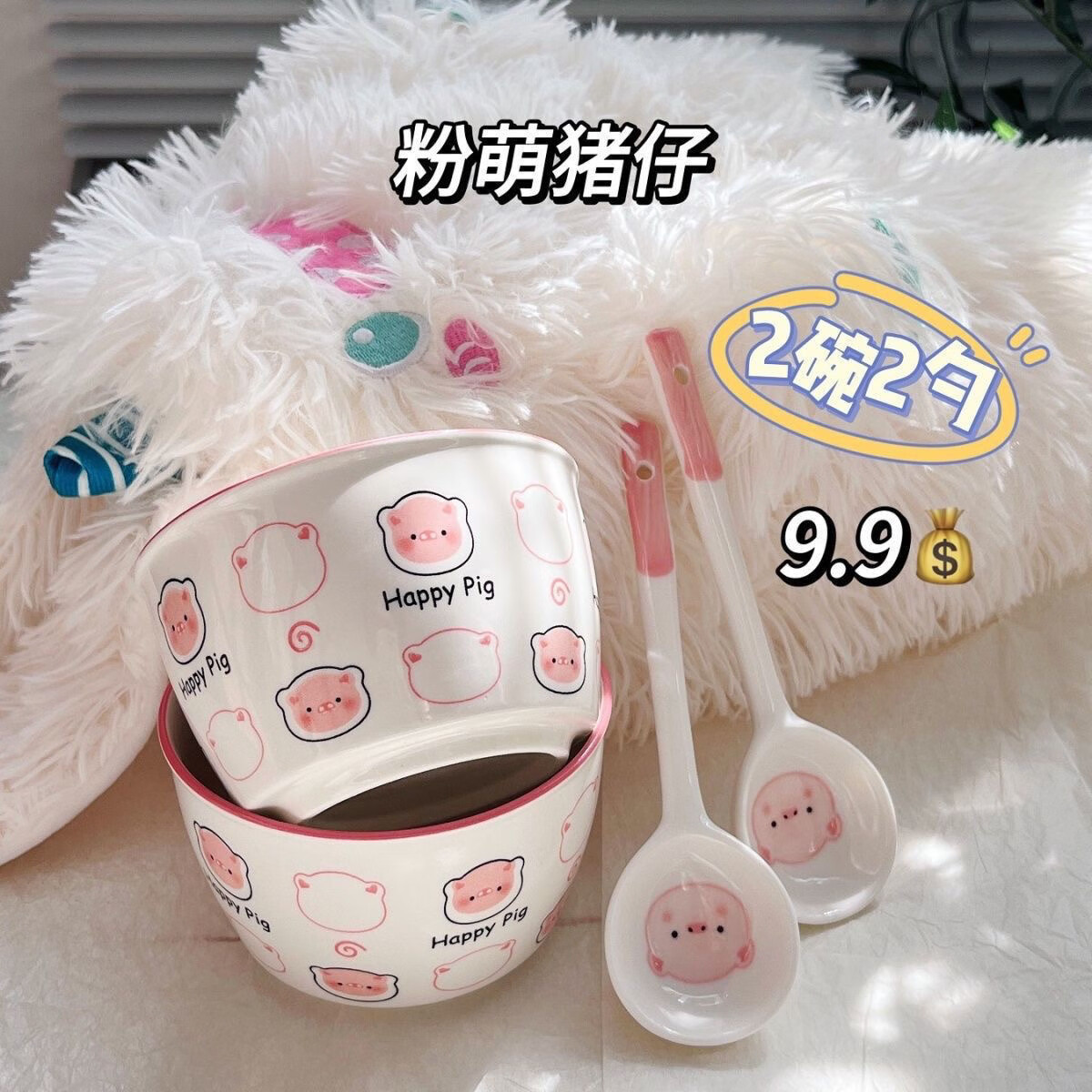 小猪猪happy陶瓷ins家用可爱少女釉下彩饭碗高颜值餐具2碗2勺 粉猪4.5英寸米饭碗【2碗2勺】