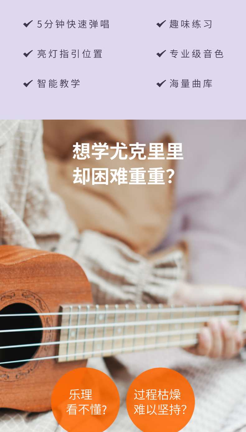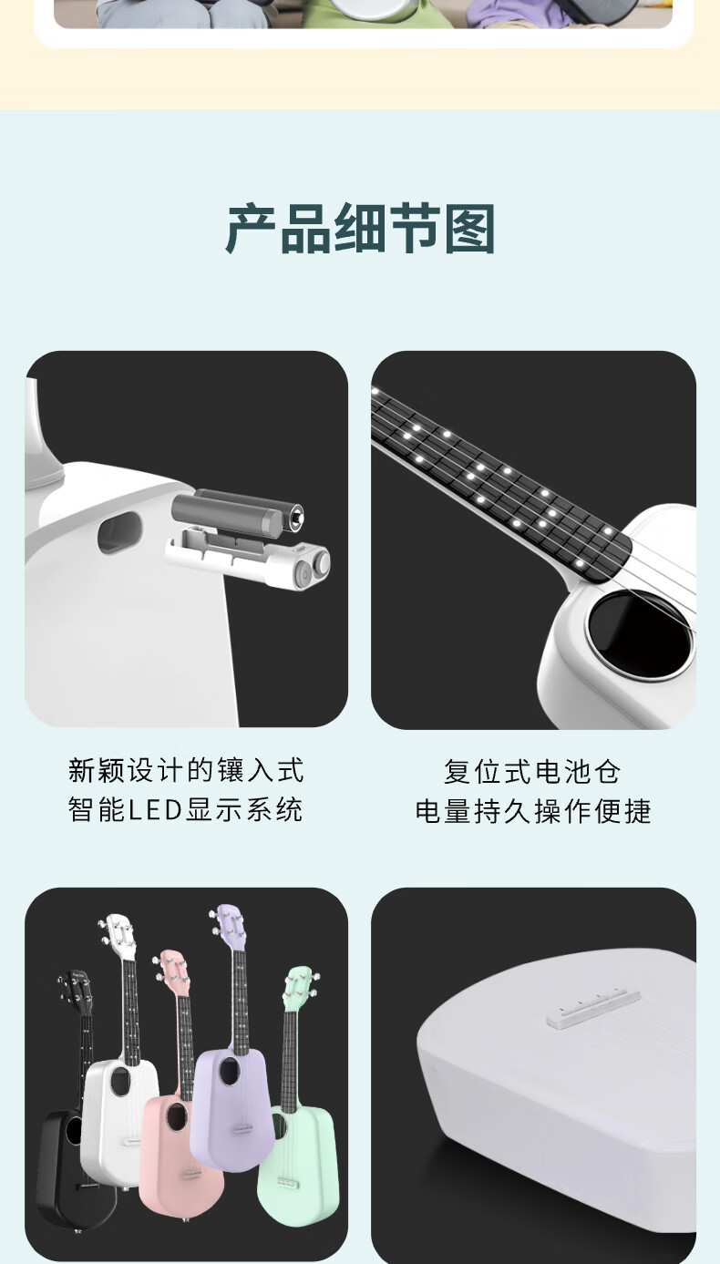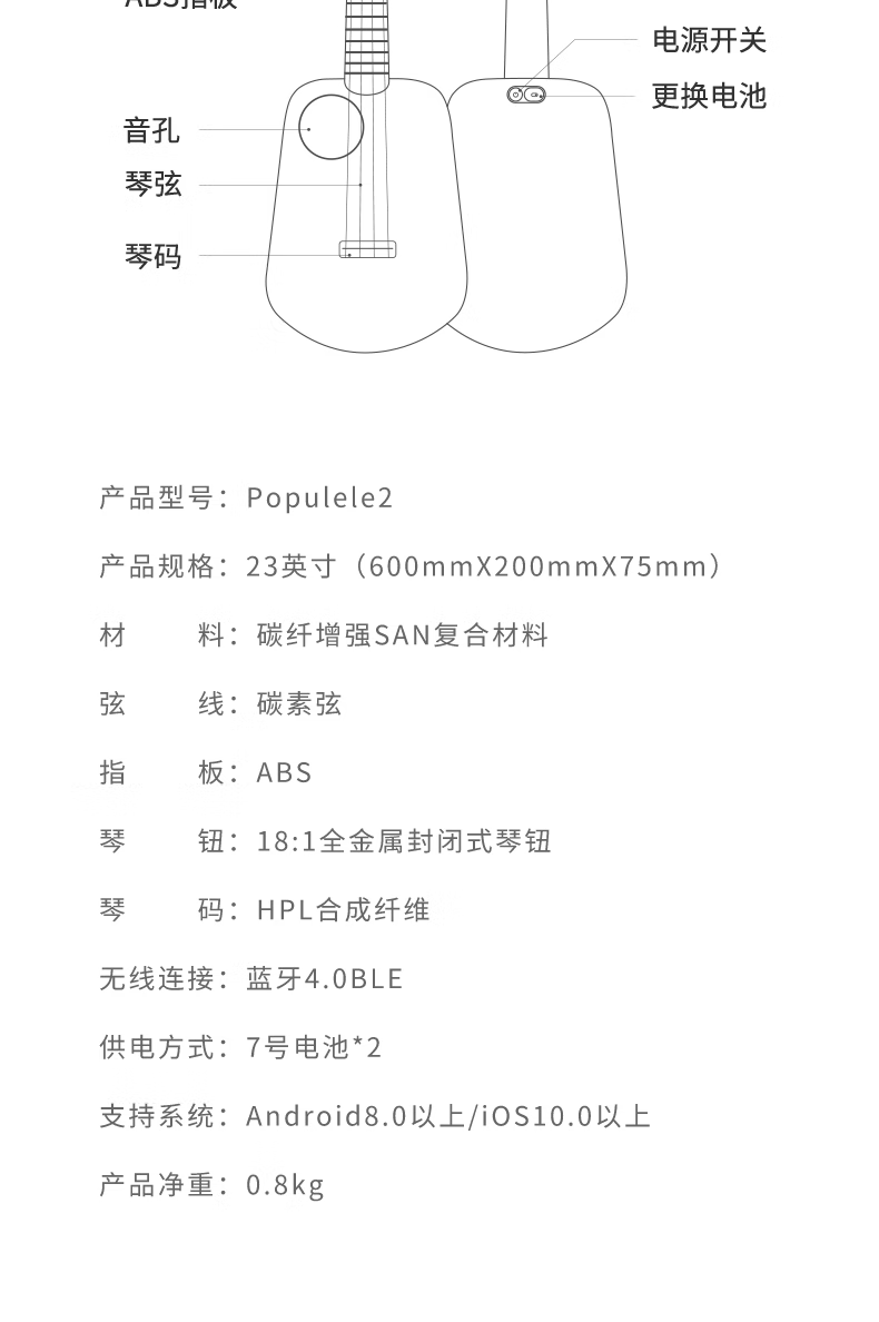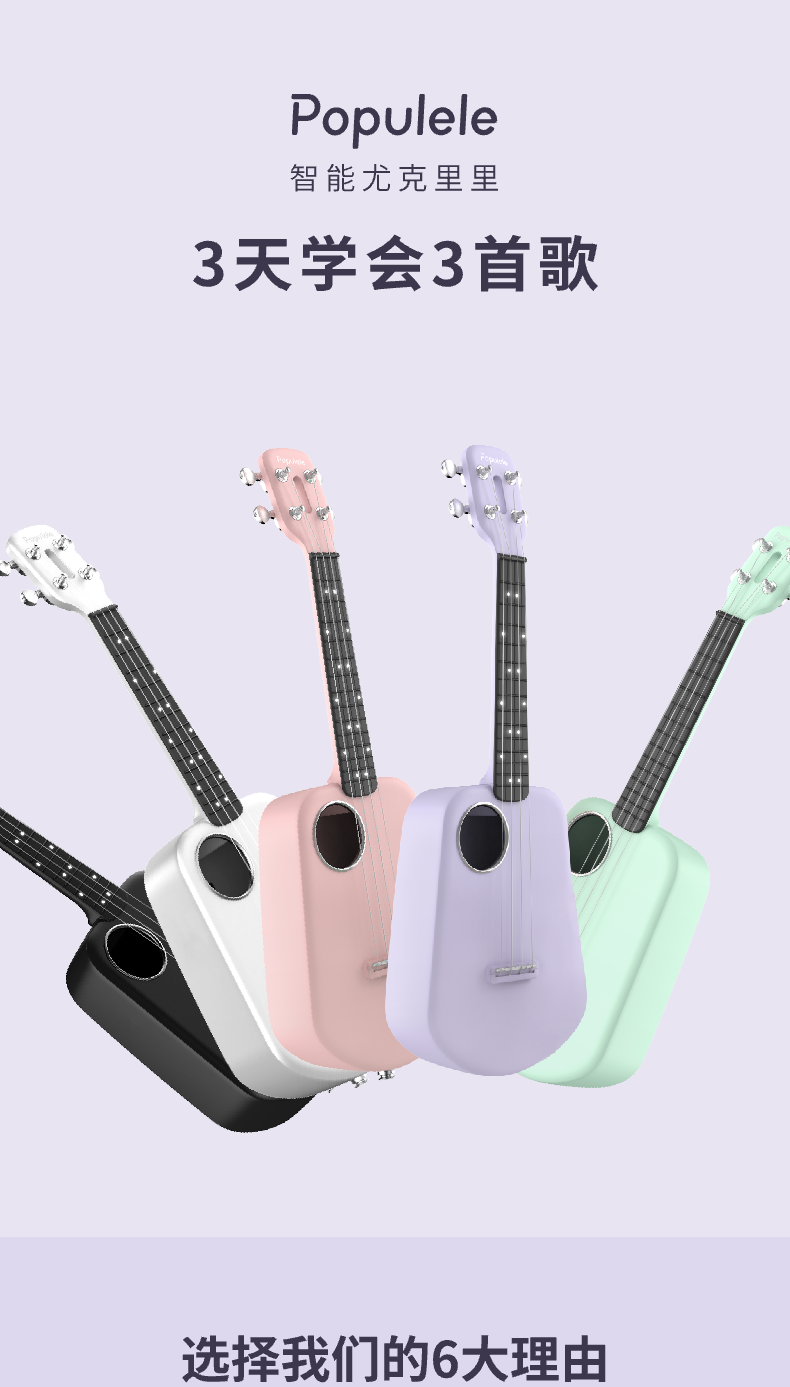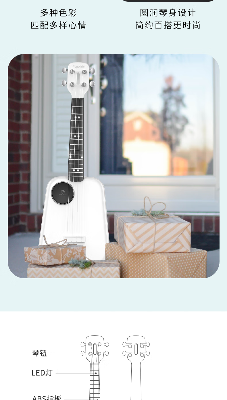 音乐密码Populele2智能尤克里里成人儿童小吉他初学者碳纤维M1白色