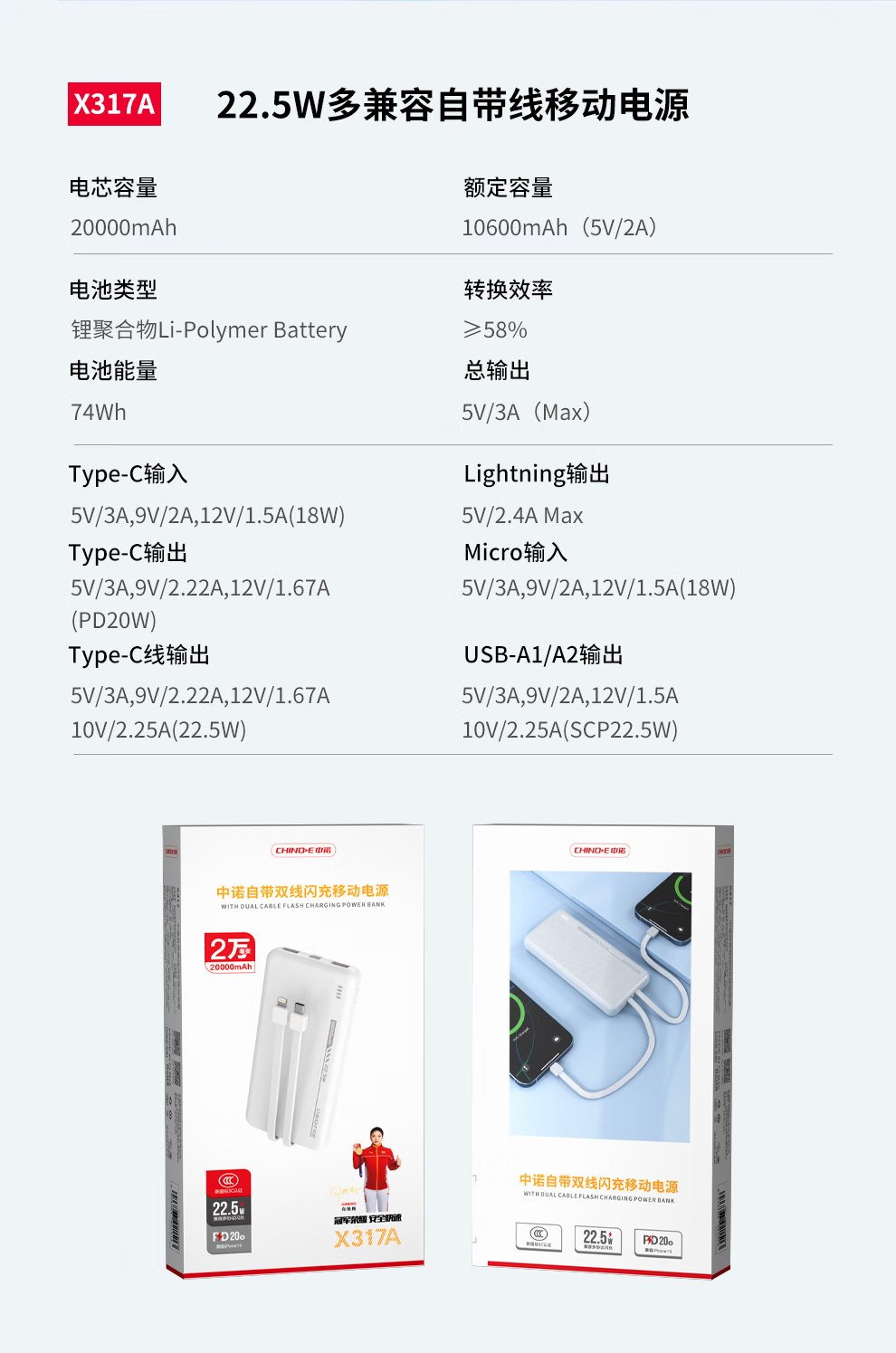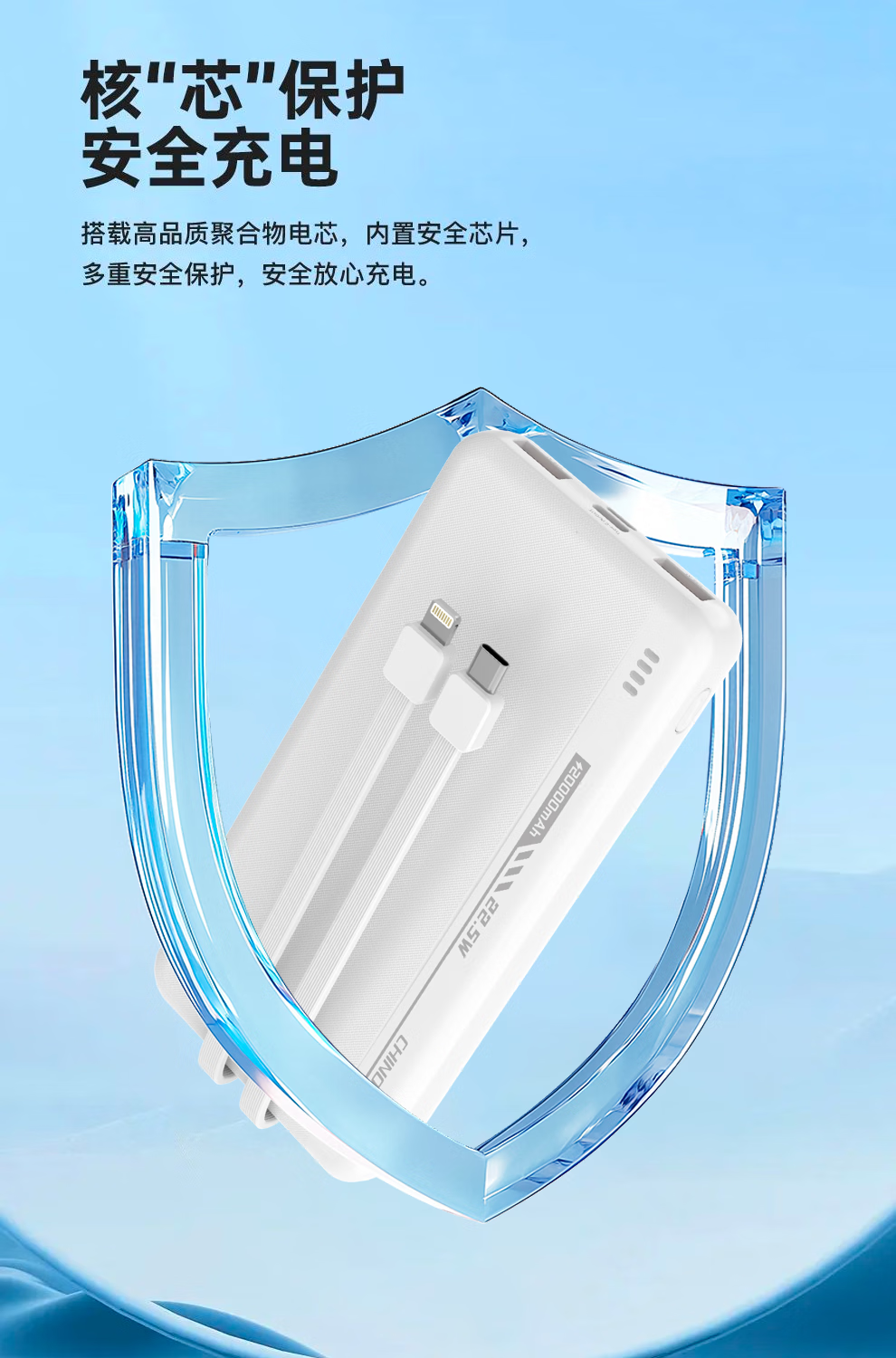 中诺(CHINO-E)【新国标3C认证 可上飞机】充电宝20000毫安自带线22.5W快充适用于苹果安卓全系列手机移动电源 黑色【10000毫安 自带双线四孔】