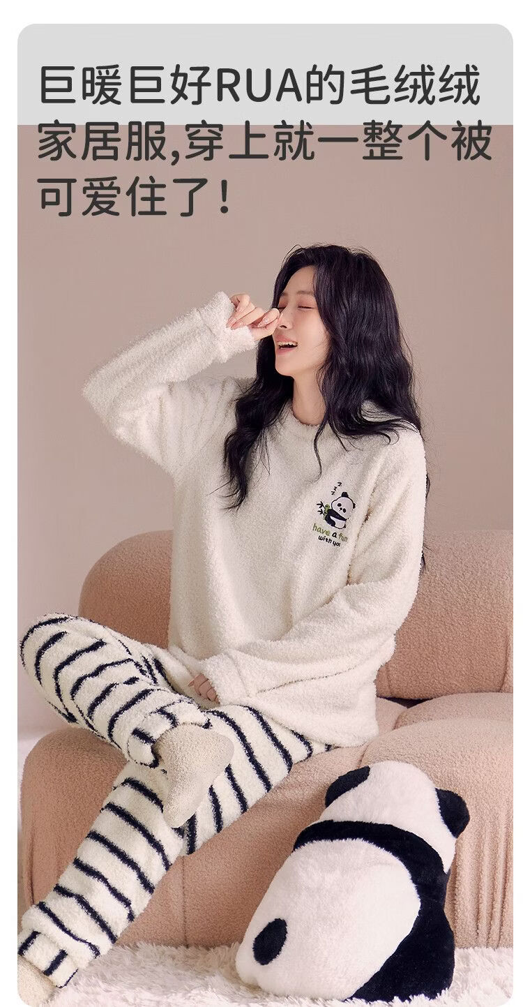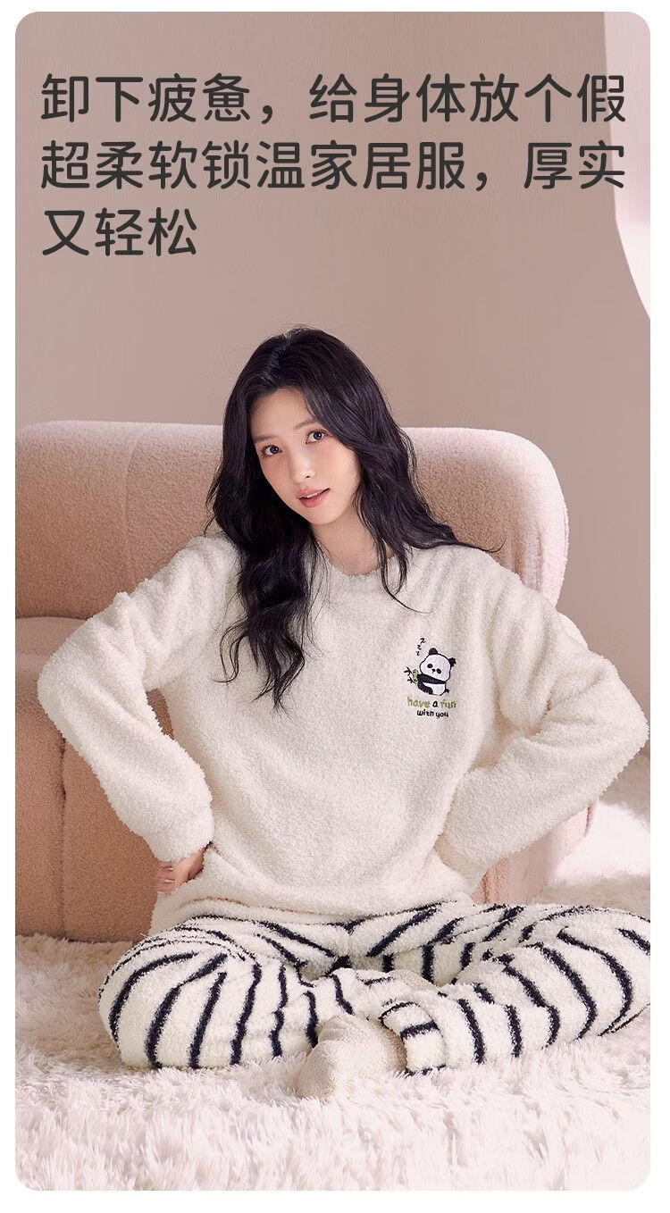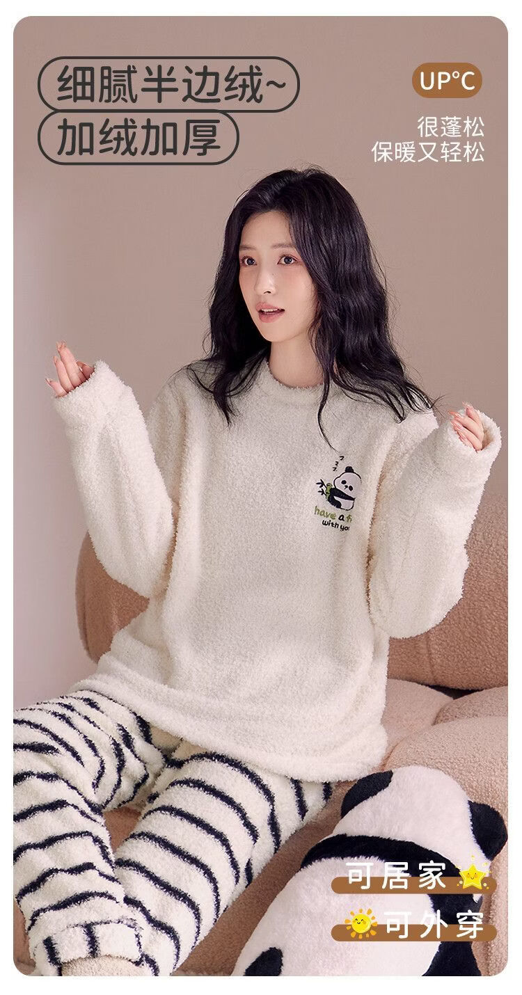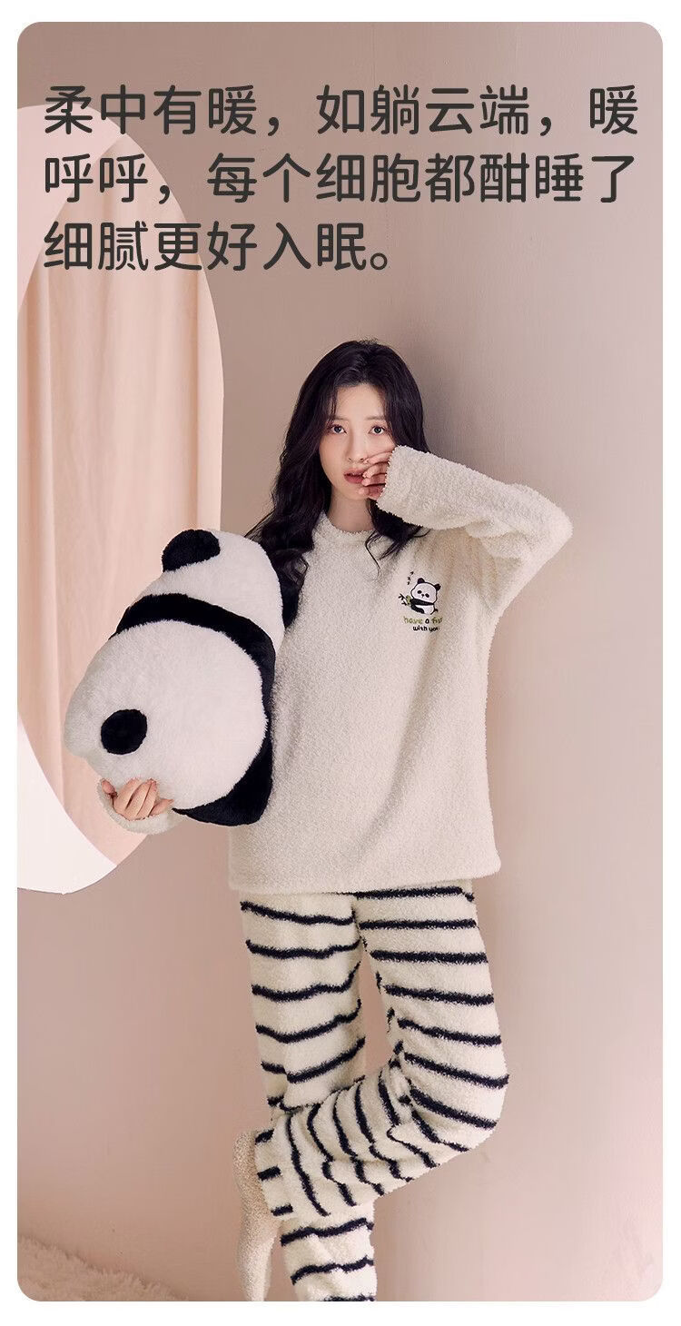 欧迪芬女士睡衣女半边绒暖呼呼卡通熊猫家居服秋冬可外穿套装 【半边绒萌宠熊猫印花-杏色】 XL 【建议身高165-170cm】