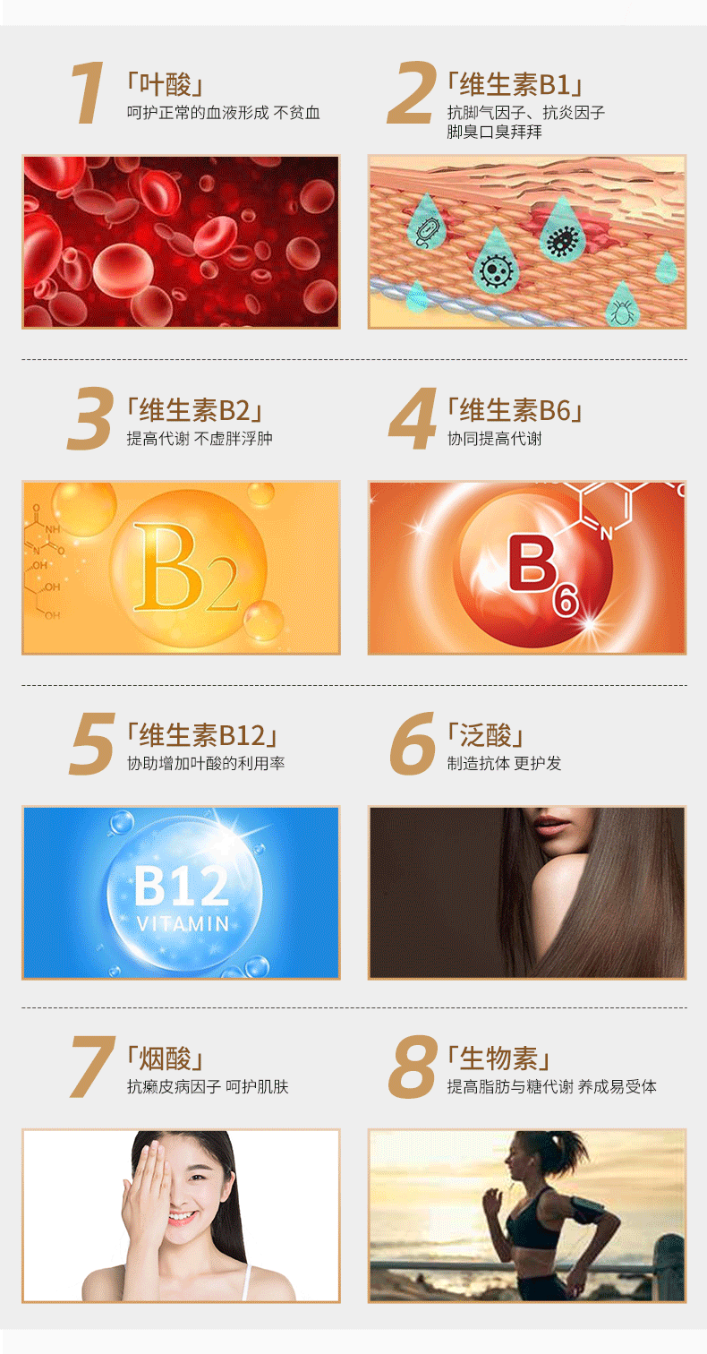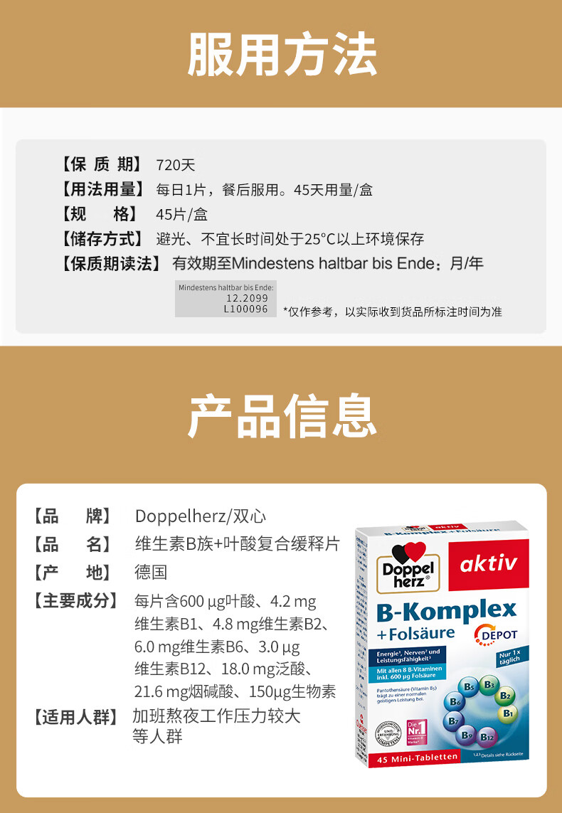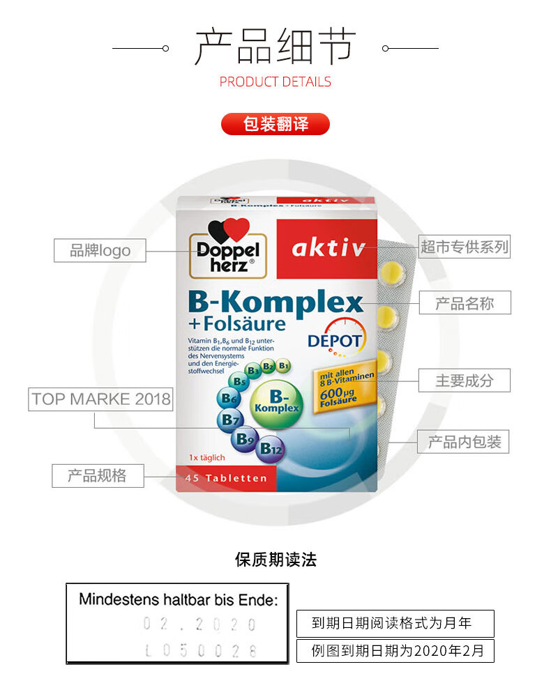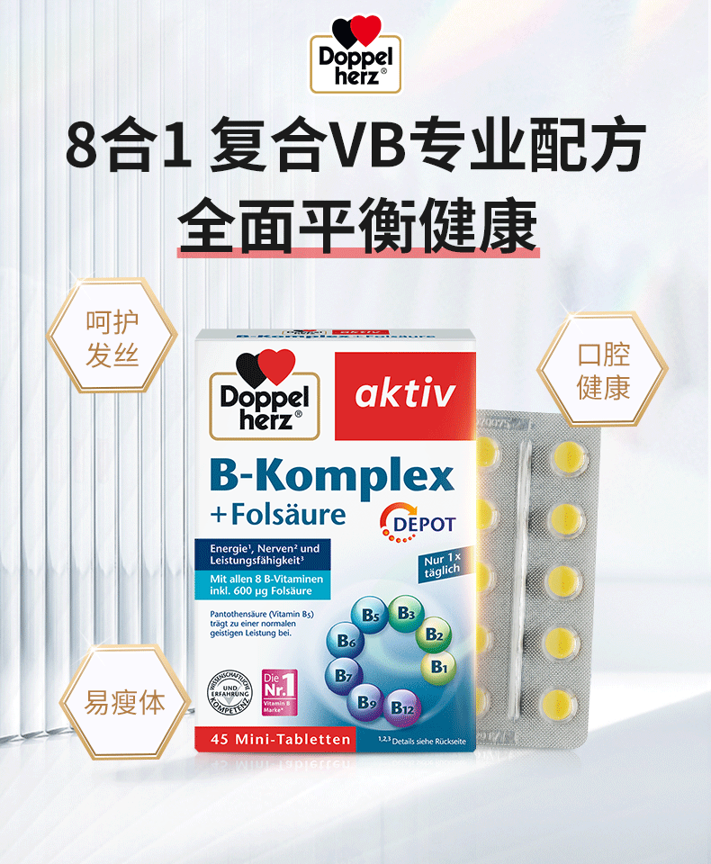 双心(Doppel herz)维生素B族+叶酸复合缓释片泛酸多种维B成人b1b6b7b12提高新陈代谢 维生素B族45粒*3盒