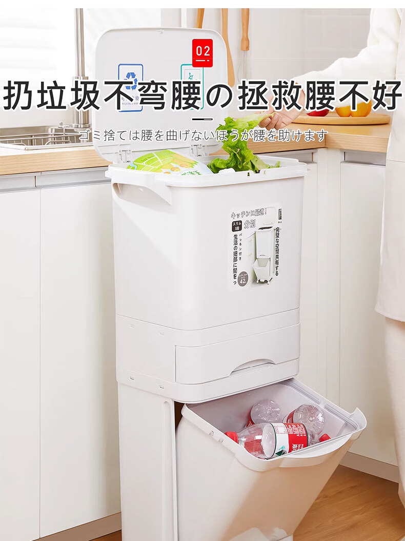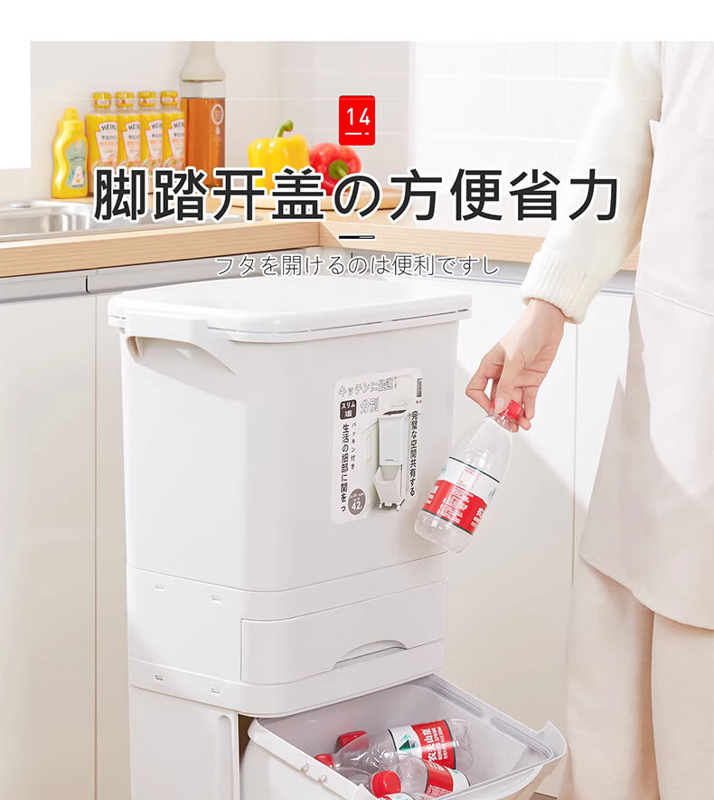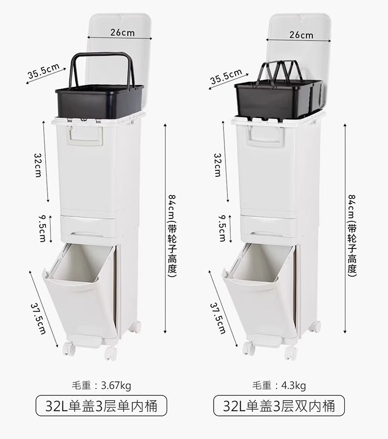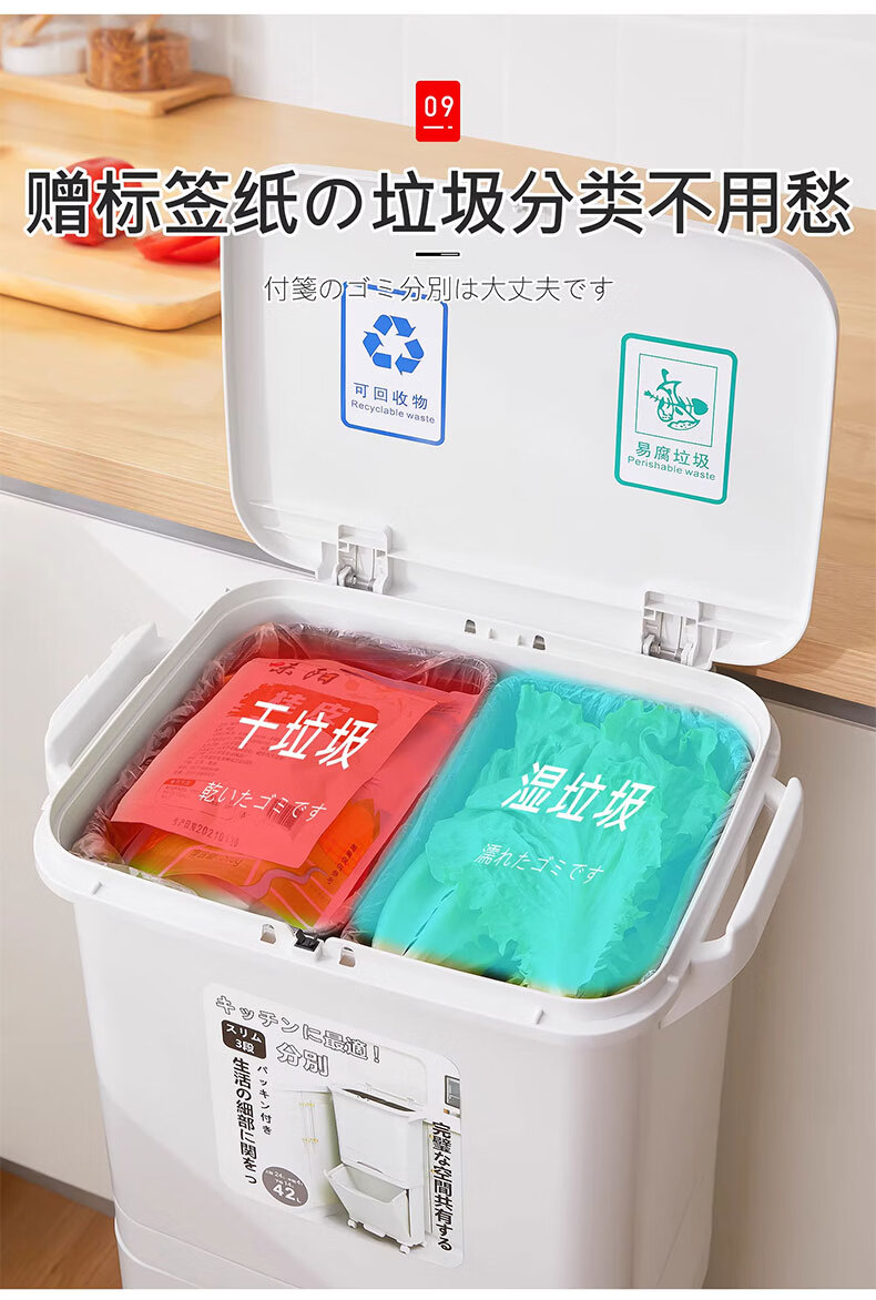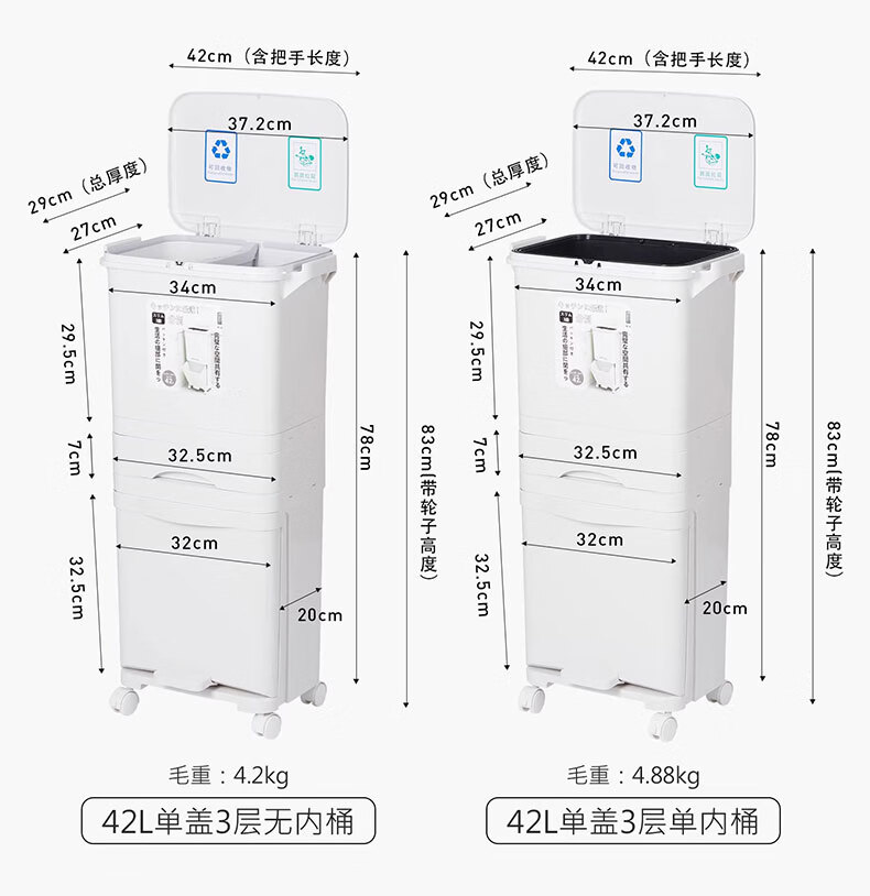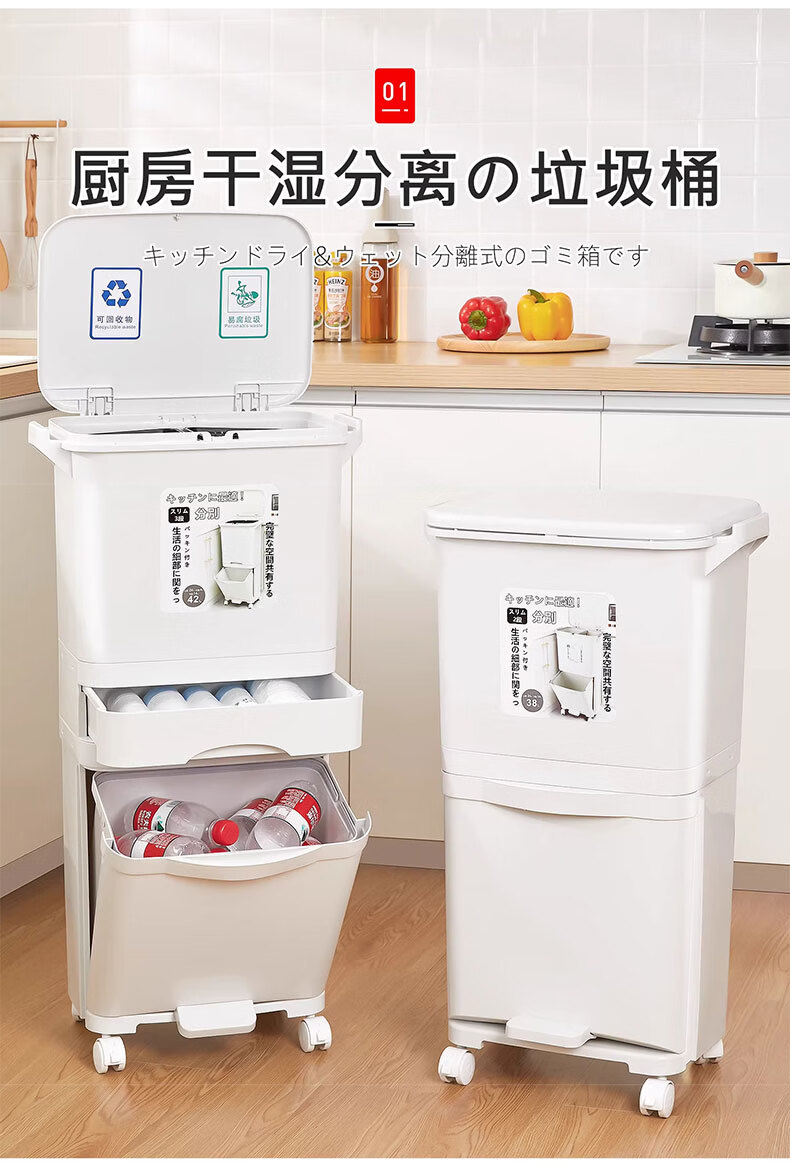 吱凡日本收纳厨房垃圾桶家用收纳专用2025新款加高可移动免弯腰 42L【三层-单盖-双内桶】+120只垃圾袋