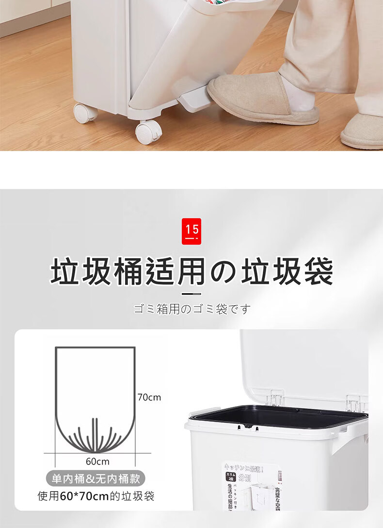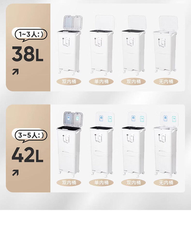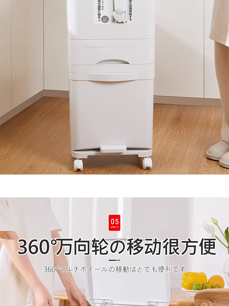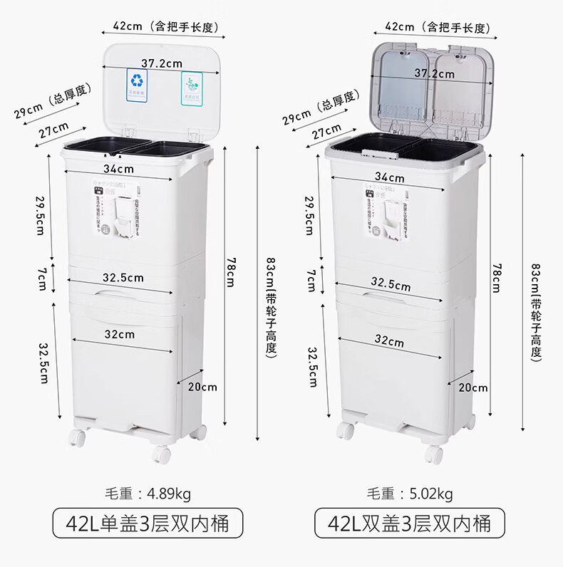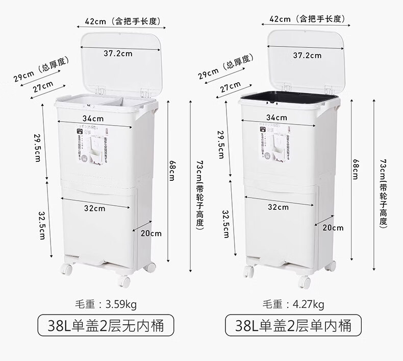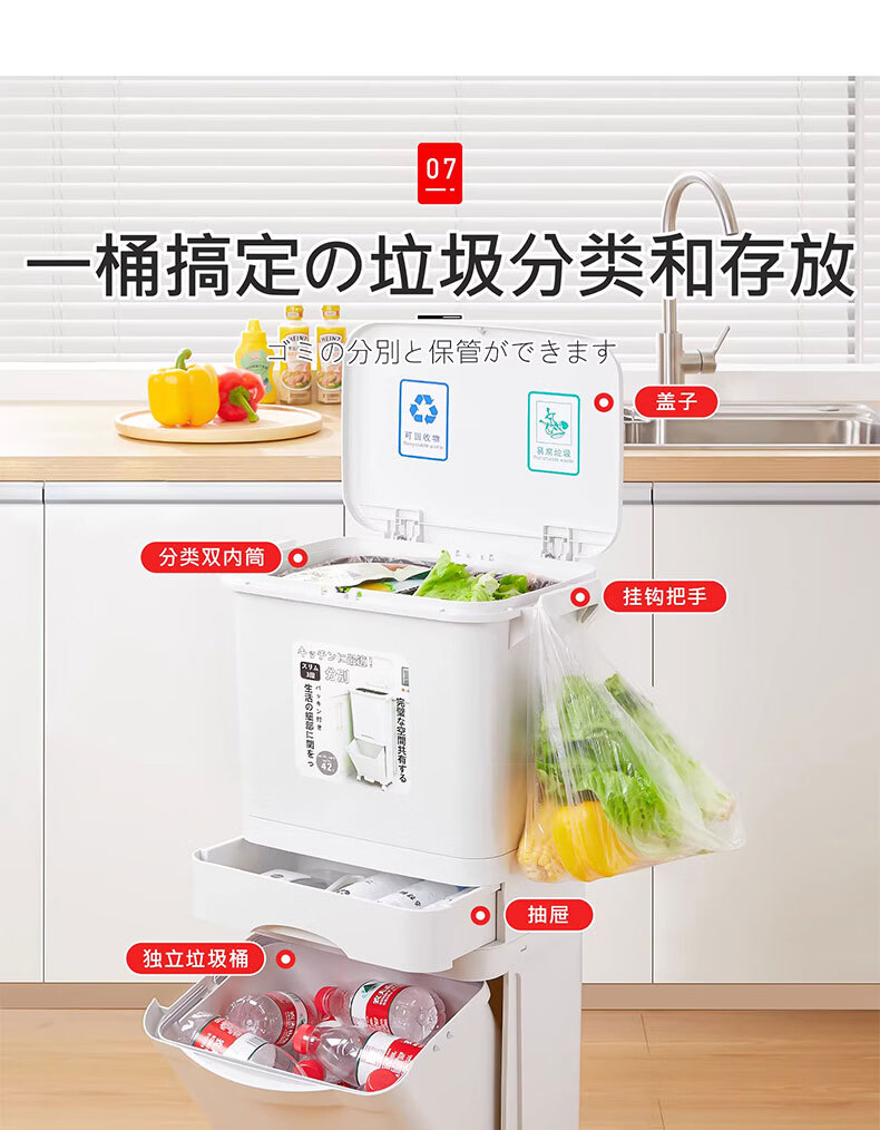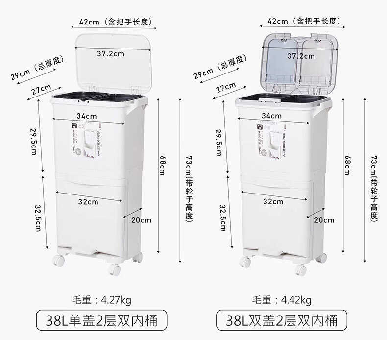 吱凡日本收纳厨房垃圾桶家用收纳专用2025新款加高可移动免弯腰 42L【三层-单盖-双内桶】+120只垃圾袋