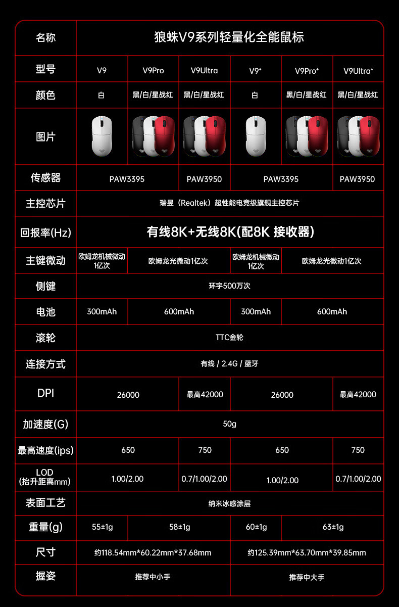 狼蛛(AULA)V9/V9+轻量化无线鼠标 2.4G/蓝牙/有线三模电竞超神鼠标PAW3395/3950芯片8K回报率 SC680轻羽白-无线8K版-【PAW3395】