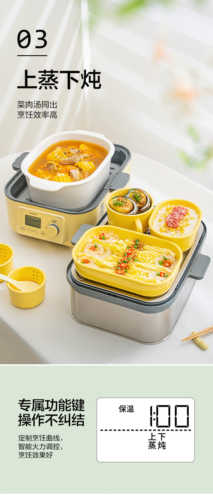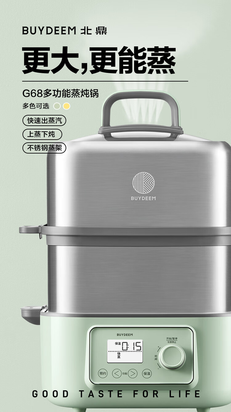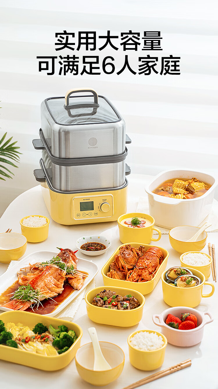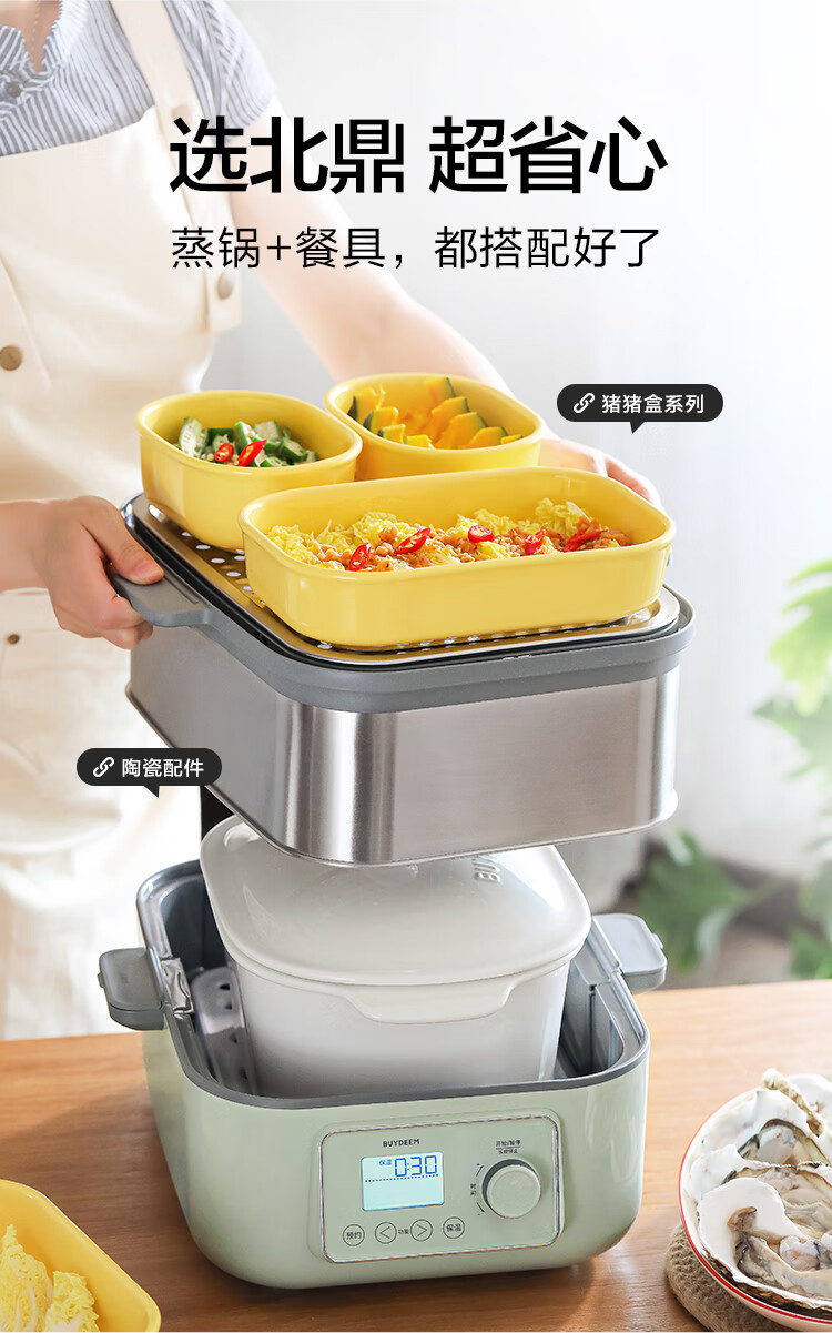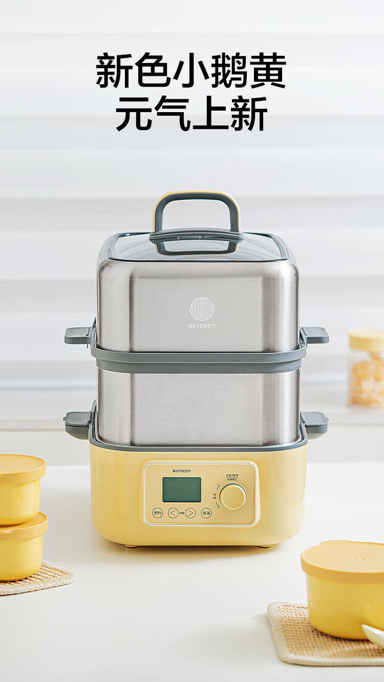 北鼎(Buydeem)电蒸锅蒸锅家用蒸炖锅不锈钢电炖锅蒸炖煮一体 大容量全自动定时预约多用途锅 14L 【小鹅黄】G68+大炖盅+蒸盘+饭盒