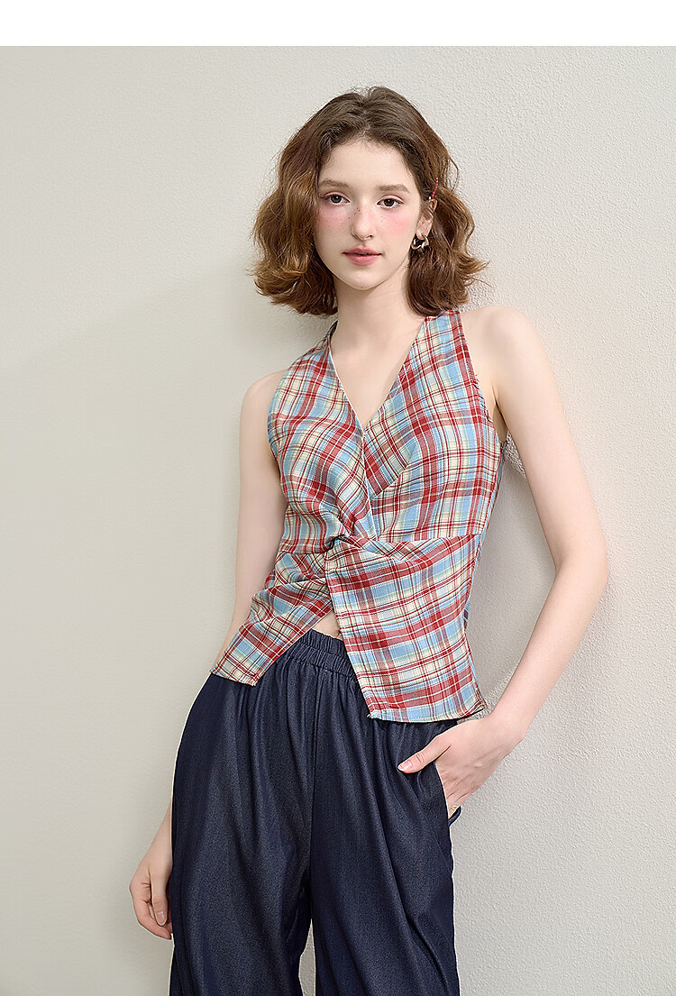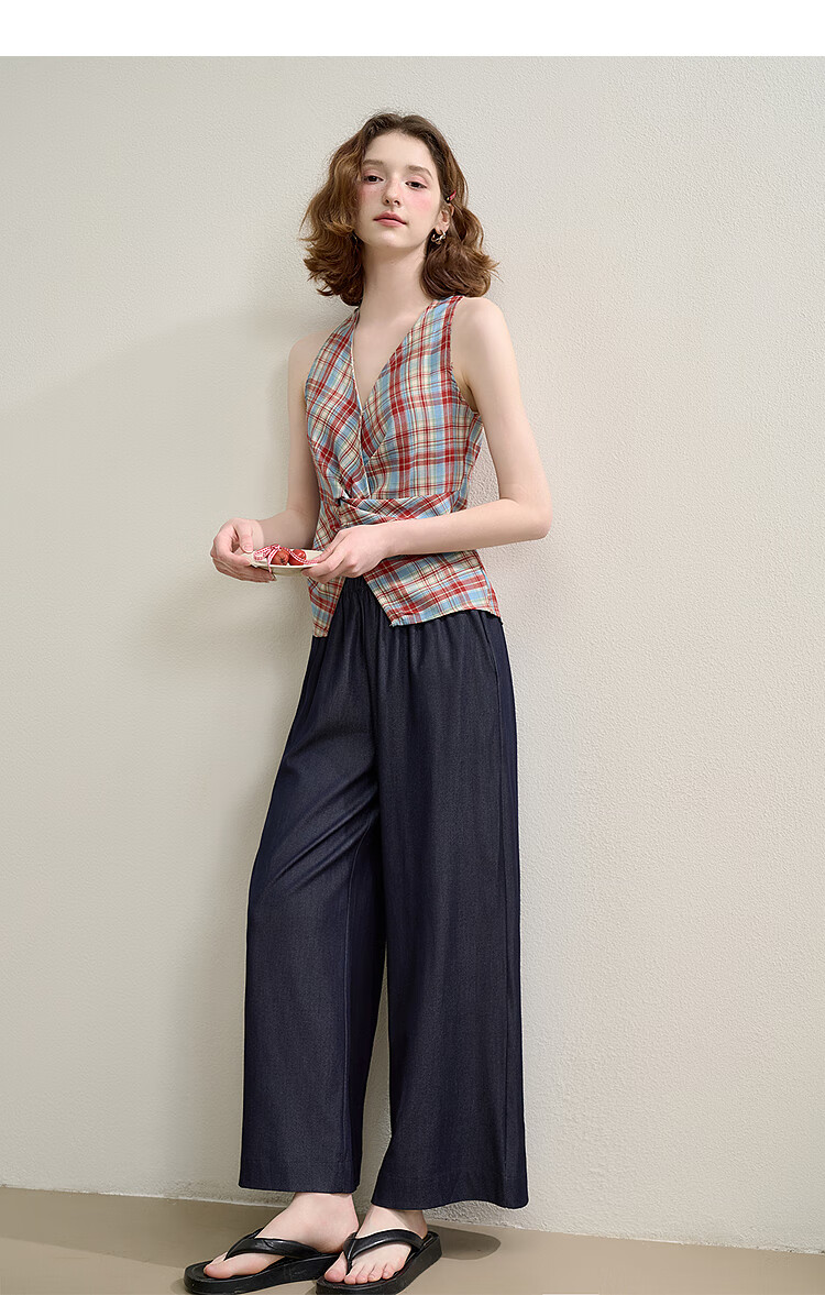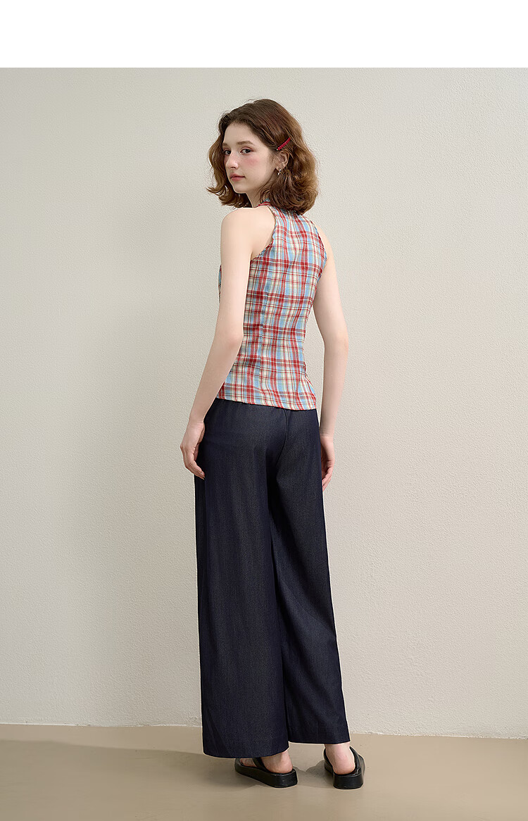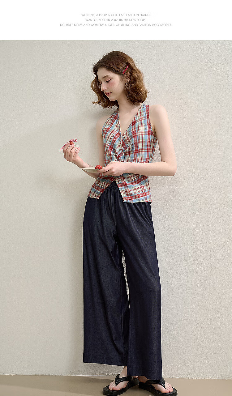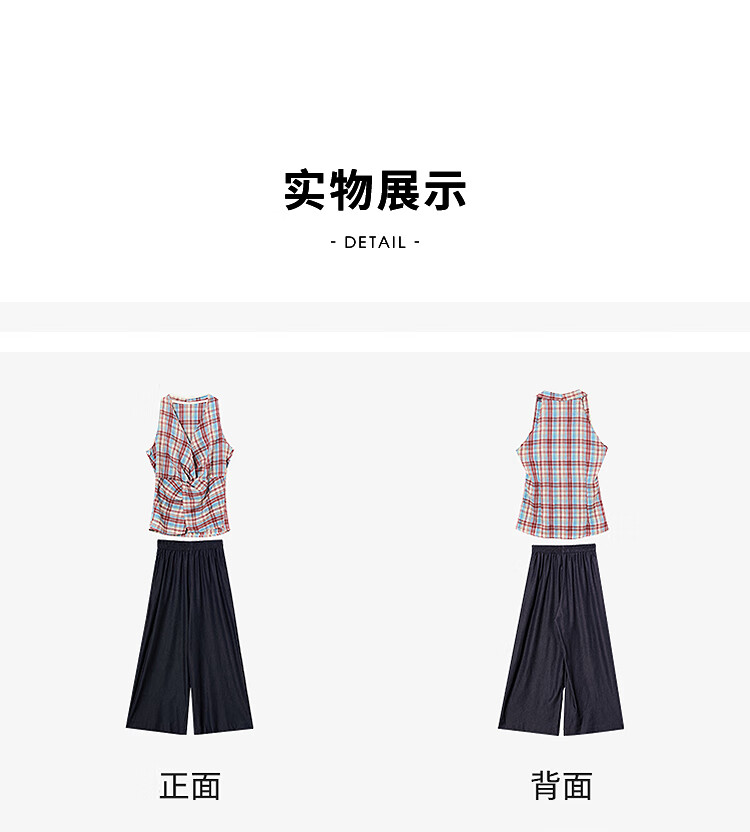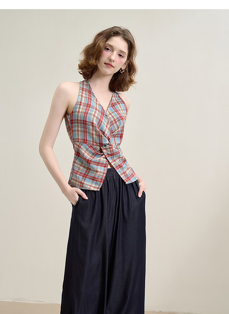 西遇垂感阔腿裤套装2025夏新款格子无袖挂脖短款上衣两件套 红色 L (165)