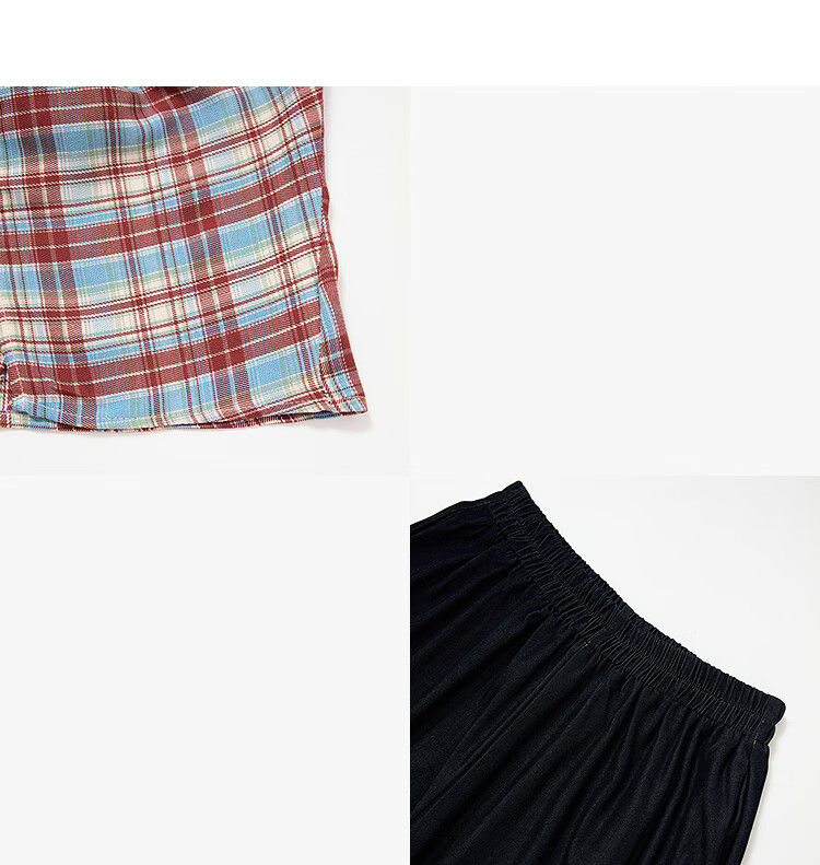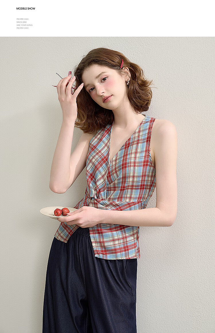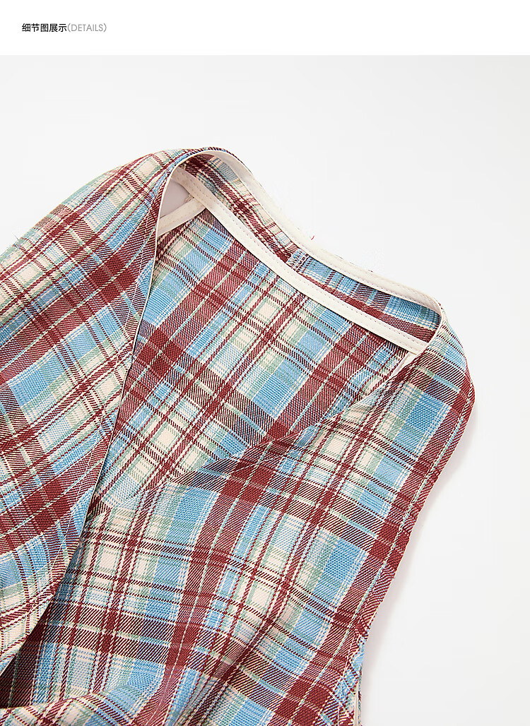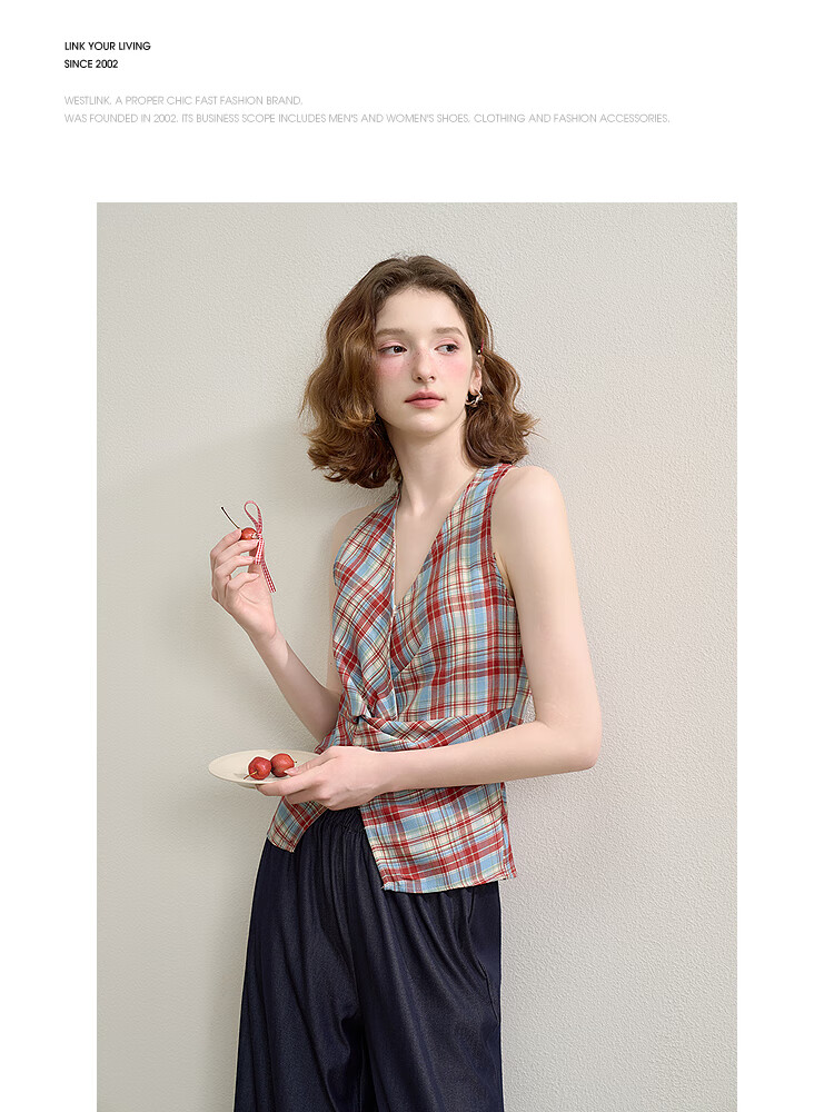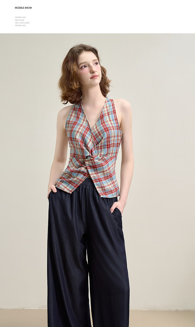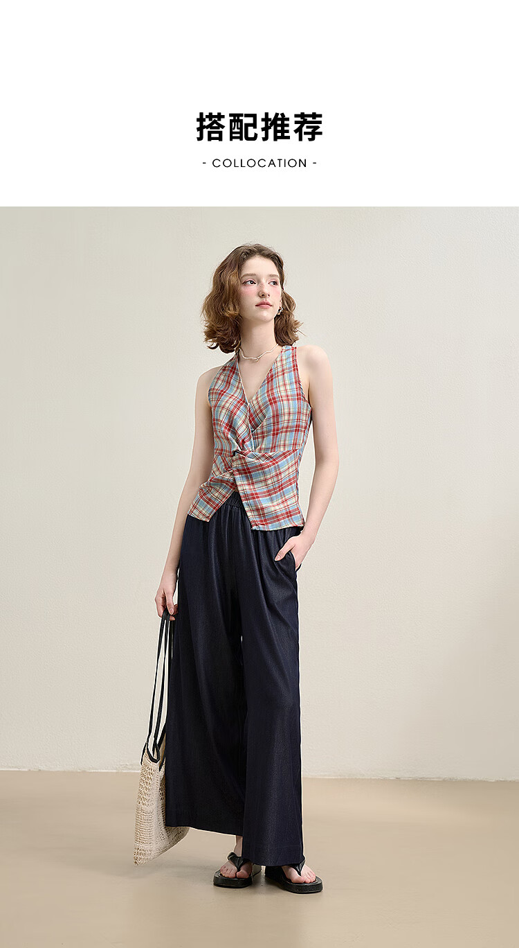 西遇垂感阔腿裤套装2025夏新款格子无袖挂脖短款上衣两件套 红色 L (165)