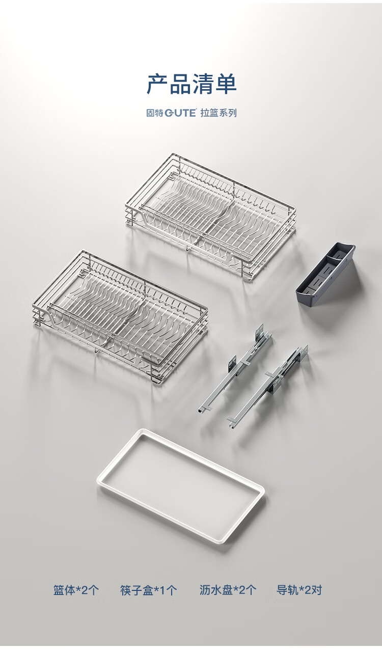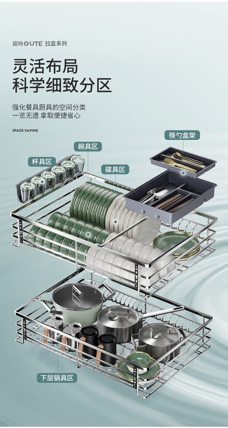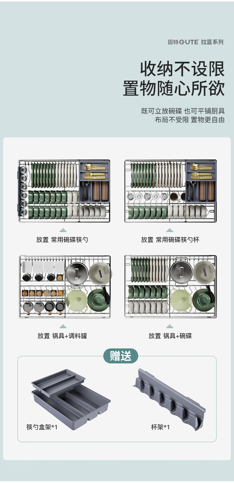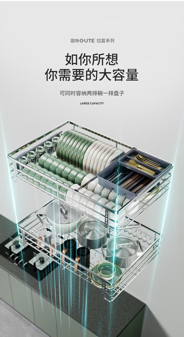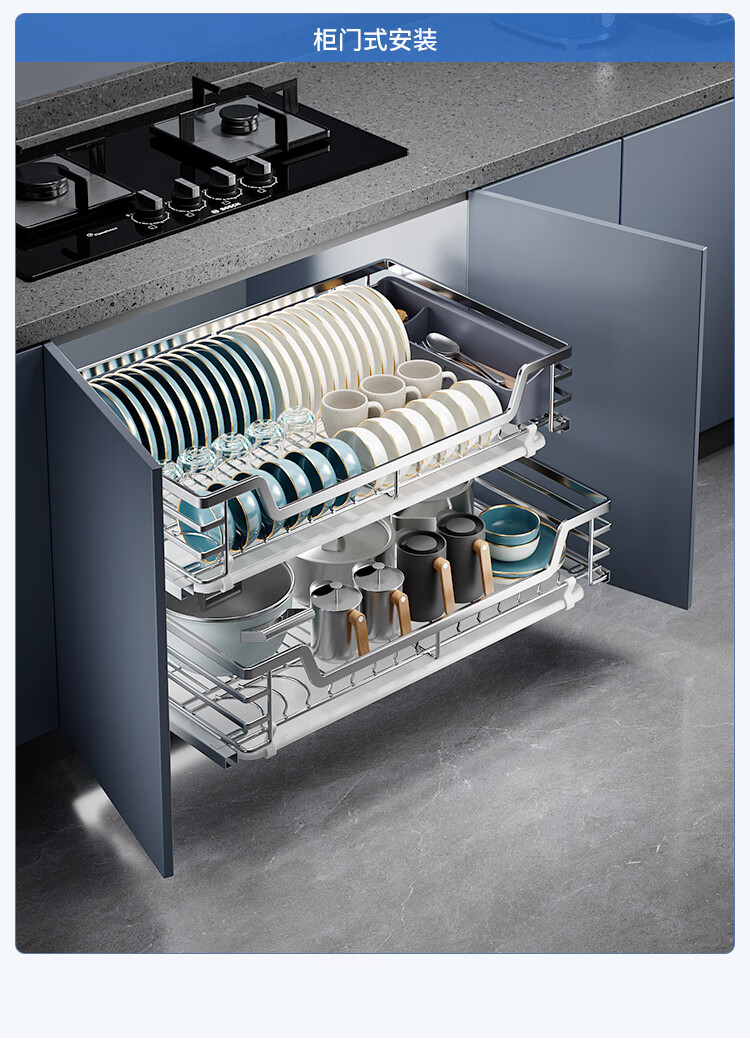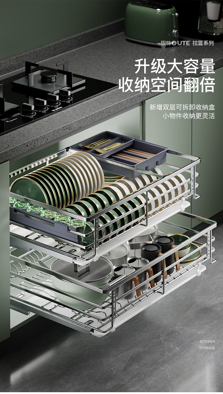 固特(GUTE)304不锈钢厨房拉篮橱柜双层抽屉式碗篮碗碟内放碗筷碗架 A款 304不锈钢【600柜】深度≥430 柜高≥550