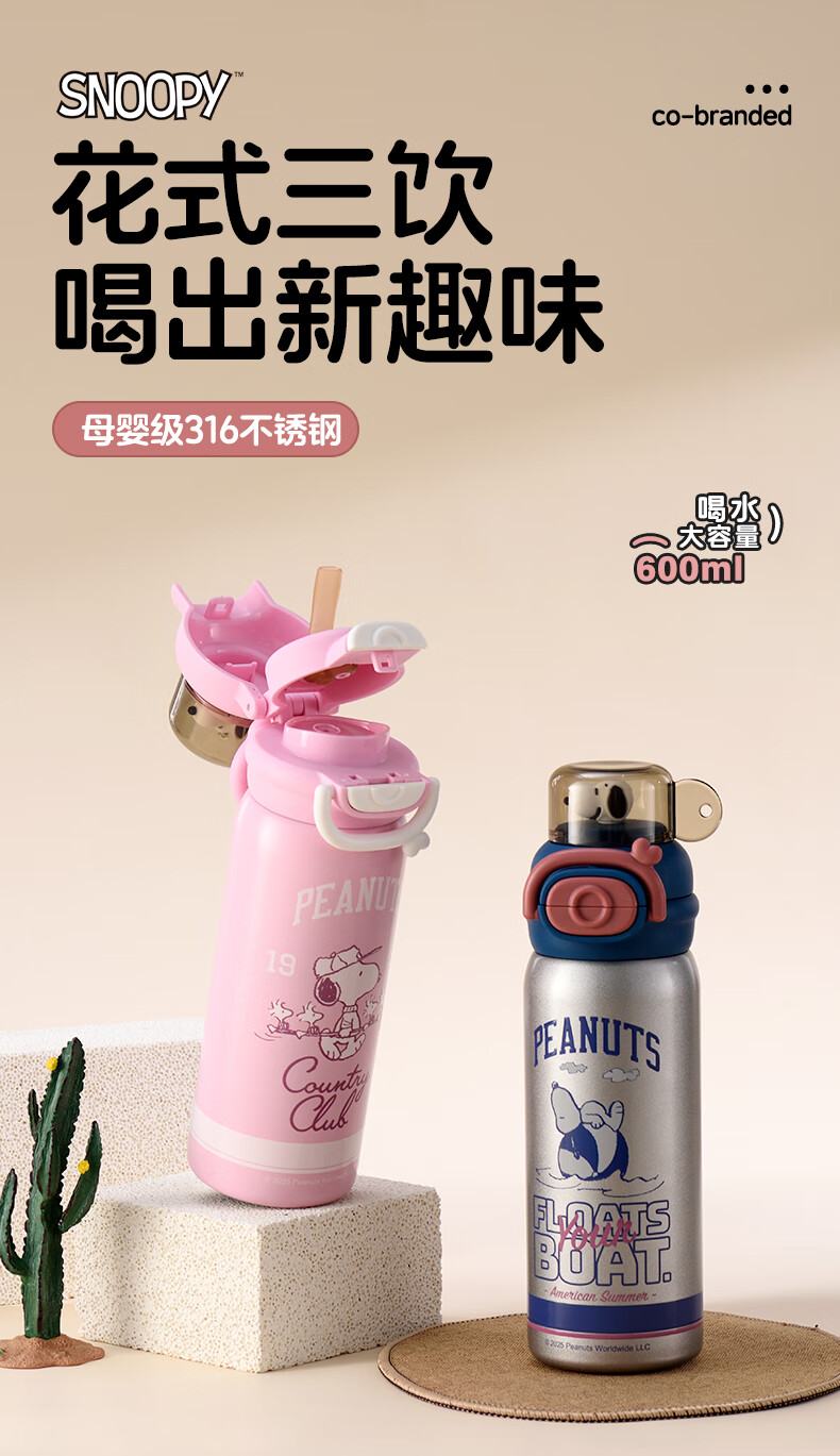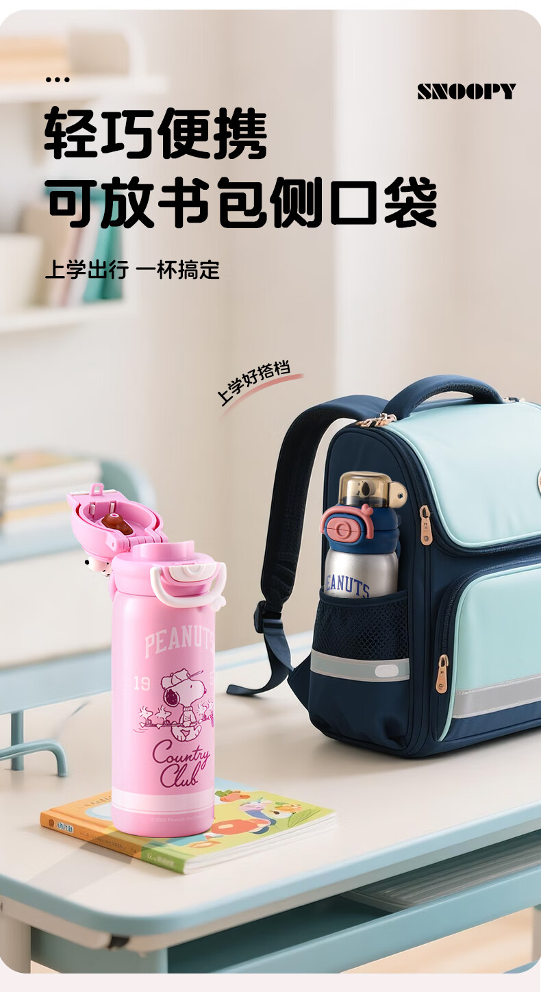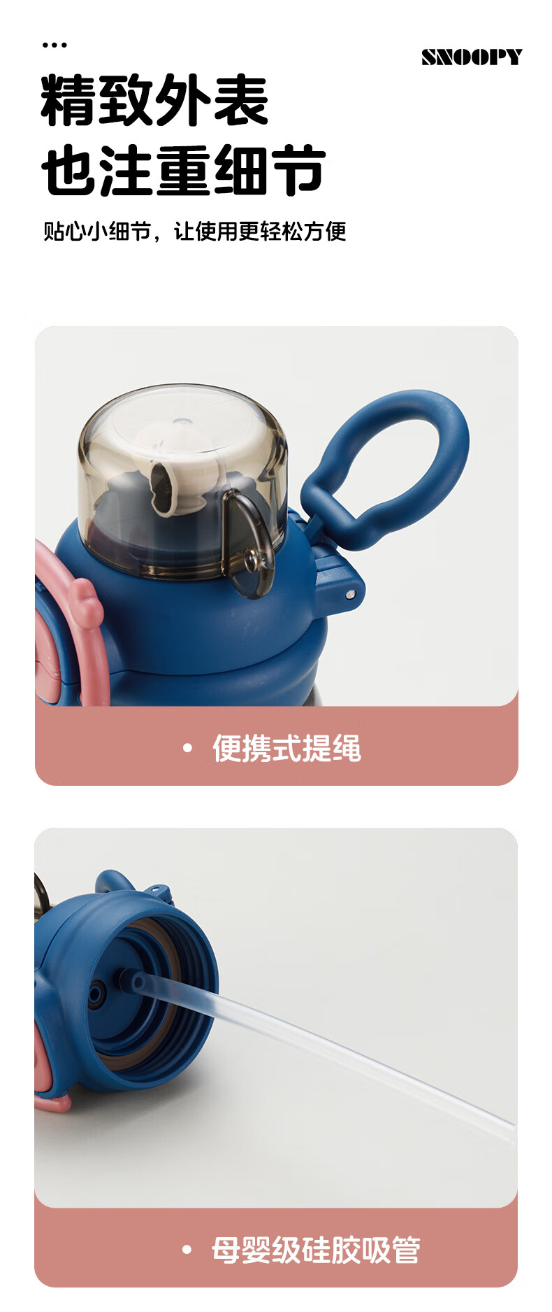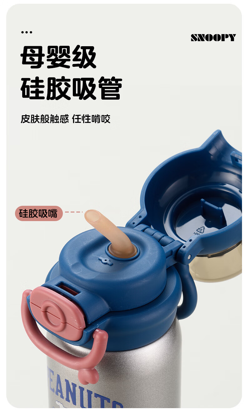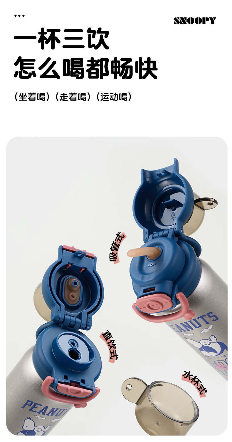 史努比儿童保温杯316不锈钢男女生上学专用水杯大容量便携直饮随行杯子 蓝色-【一杯三饮+316内胆】600ml