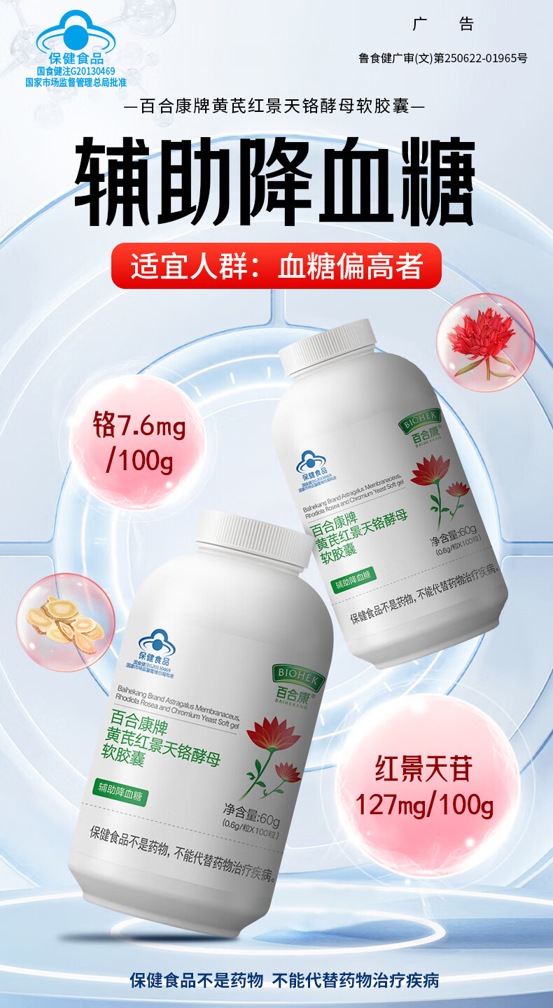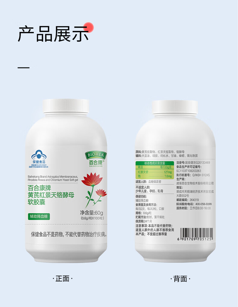 BIOHEK百合康黄芪红景天铬酵母软胶囊100粒/瓶辅助降血糖蓝帽血糖偏高者 【推荐装家庭分享装】黄芪100粒*4瓶